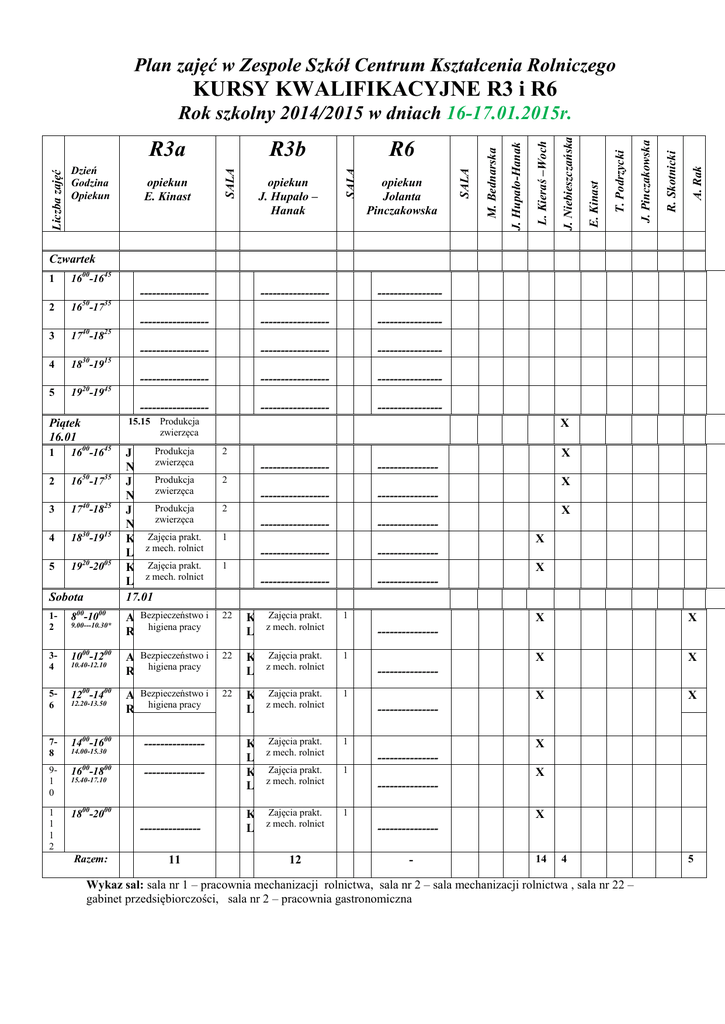 Plan zajęć w Zespole Szkół Centrum Kształcenia Rolniczego KURSY KWALIFIKACYJNE R3 i R6 A. Rak R. Skotnicki J. Pinczakowska T. Podrzycki E. Kinast J. Niebieszczańska L. Kieraś –Woch J. Hupało-Hanak opiekun Jolanta Pinczakowska SALA opiekun J. Hupało – Hanak R6 SALA opiekun E. Kinast R3b SALA Liczba zajęć R3a Dzień Godzina Opiekun M. Bednarska Rok szkolny 2014/2015 w dniach 16-17.01.2015r. Czwartek 1 1600-1645 2 1650-1735 3 1740-1825 4 1830-1915 5 1920-1945 Piątek 16.01 1 2 3 4 5 ----------------- ----------------- ---------------- ----------------- ----------------- ---------------- ----------------- ----------------- ---------------- ----------------- ----------------- ---------------- ----------------- ----------------- ---------------- 15.15 Produkcja zwierzęca 1600-1645 1650-1735 1740-1825 1830-1915 1920-2005 Sobota 12 800-1000 34 1000-1200 56 1200-1400 78 1400-1600 91 0 1600-1800 1 1 1 2 1800-2000 9.00---10.30* 10.40-12.10 12.20-13.50 14.00-15.30 15.40-17.10 Produkcja J zwierzęca N Produkcja J zwierzęca N Produkcja J zwierzęca N K Zajęcia prakt. L z mech. rolnict K Zajęcia prakt. L z mech. rolnict 17.01 2 A Bezpieczeństwo i R higiena pracy 22 A Bezpieczeństwo i R higiena pracy 22 A Bezpieczeństwo i R higiena pracy 22 ----------------------------- --------------Razem: X 11 X ----------------- --------------- ----------------- --------------- ----------------- --------------- ----------------- --------------- ----------------- --------------- 2 X 2 X 1 X 1 X K Zajęcia prakt. L z mech. rolnict 1 K Zajęcia prakt. L z mech. rolnict 1 K Zajęcia prakt. L z mech. rolnict 1 K Zajęcia prakt. L z mech. rolnict K Zajęcia prakt. L z mech. rolnict 1 K Zajęcia prakt. L z mech. rolnict 1 12 X X X X X X ------------------------------------------X --------------1 X --------------X --------------- 14 4 Wykaz sal: sala nr 1 – pracownia mechanizacji rolnictwa, sala nr 2 – sala mechanizacji rolnictwa , sala nr 22 – gabinet przedsiębiorczości, sala nr 2 – pracownia gastronomiczna 5