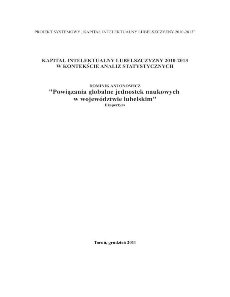 PROJEKT SYSTEMOWY „KAPITAŁ INTELEKTUALNY LUBELSZCZYZNY 2010-2013” KAPITAŁ INTELEKTUALNY LUBELSZCZYZNY 2010-2013 W KONTEKŚCIE ANALIZ STATYSTYCZNYCH DOMINIK ANTONOWICZ "Powiązania globalne jednostek naukowych w województwie lubelskim" Ekspertyza Toruń, grudzień 2011 2|Strona Spis treści 1.WSTĘP....................................................................................................................................3 2.OTOCZENIE SPOŁECZNO-EKONOMICZNE MAJĄCE WPŁYW NA KAPITAŁ INTELEKTUALNY LUBLINA.............................................................................................. 5 3.POTENCJAŁ BADAWCZY I EDUKACYJNY LUBELSZCZYZNY.............................6 4.Potencjał edukacyjny województwa lubelskiego ....................................................................................................................................... 6 5.Umiędzynarodowienie w wymiarze edukacyjnym ................................................... 9 6.Program międzynarodowej wymiany studentów i nauczycieli akademickich Erasmus-Mundus......................................................................................................... 13 7.ANALIZA WYNIKÓW BADAŃ INSTYTUCJI NAUKOWO-BADAWCZYCH W WOJEWÓDZTWIE LUBELSKIM..................................................16 4.1. Charakterystyka badanych instytucji................................................................. 17 4.2. Efekty badań naukowych.....................................................................................18 4.3. Udział w Programach Ramowych UE.................................................................. 21 4.4. Parametryzacja jednostek naukowych .............................................................. 24 4.5. Współpraca naukowo-badawcza jednostek B+R................................................ 26 8.KONKLUZJE ..................................................................................................................... 29 BIBLIOGRAFIA.....................................................................................................................31 SPIS TABEL, RYSUNKÓW I WYKRESÓW...................................................................... 32 Projekt współfinansowany przez Unię Europejską w ramach Europejskiego Funduszu Społecznego 3|Strona 1. WSTĘP Niniejszy dokument prezentuje analizę globalnych powiązań jednostek badawczo-naukowych działających w województwie lubelskim. „Powiązanie globalne” jest terminem niezwykle szerokim, nieostrym i szczególnie trudnym do zdefiniowania Na potrzeby niniejszej ekspertyzy będzie on definiowany jako wszelkie formy pośredniej oraz bezpośredniej współpracy pomiędzy instytucjami naukowo- -badawczymi znajdującymi się na terenie województwa lubelskiego, a transnarodowym światem nauki. Innymi słowy „powiązania globalne” będą traktowane jako umiędzynarodowienie jednostek badawczo-naukowych. Nauka bowiem staje się fenomenem społecznym o charakterze transnarodowym, który zarówno w wymiarze badań naukowych, jak również edukacyjnym wymyka się poza sztywne granic państwa narodowego. W tym kontekście pytanie o „powiązania globalne” w istocie po pierwsze dotyczy wpływu prowadzonych badań naukowych na rozwój nauki, po drugie jest to pytanie o bogactwo oferty dydaktycznej, a przede wszystkim jej zasięg; wreszcie po trzecie – co wydaje się najbardziej dyskusyjne – to również pytanie o przepływ wiedzy oraz innowacji z sektora nauki do sektora gospodarki. Bo idee, pomysły, patenty, wzory użytkowe w łatwy, a nawet niezauważalny sposób pokonują polityczne granice. Wszystkie trzy pytania, tworzące jednocześnie trzy wymiary analizy są nie tylko ogromnym badawczym wyzwaniem definicyjnym, ale przede wszystkim stanowią ogromne wyzwanie związane z operacjonalizacją, doborem odpowiednich wskaźników oraz wskazaniem ich wartości. Tym bardziej, że formułowanie ocen dotyczących „powiązań globalnych” jednostek badawczo-naukowych wymaga odniesienia do szerszego kontekstu. Z tego powodu, tam gdzie jest to możliwe, prowadzone analizy przedstawiają województwo lubelskie w relacji do innych województw o podobnej charakterystyce lub do średniej wartości danego wskaźnika w Polsce. W wielu przypadkach jest to jednak punkt odniesienia mówiący bardzo niewiele i dlatego jedynym możliwym benchmarkiem jest odniesienie do posiadanego potencjału. Dlatego stosunkowo wiele miejsca poświęcono opisowi potencjału jednostek naukowobadawczych województwa lubelskiego. Projekt współfinansowany przez Unię Europejską w ramach Europejskiego Funduszu Społecznego 4|Strona Ekspertyza została przygotowana przede wszystkim (1) na podstawie raportów Głównego Urzędu Statystycznego: „Szkoły wyższe i ich finanse w 2010 roku”, „Nauka i technika w Polsce w 2009 roku”, „Rocznik statystyczny województwa lubelskiego 2010”; „Analiza na temat potencjału akademickiego Lublina”, „Regionalna Strategia Innowacji województwa lubelskiego”, „Analiza na temat istniejącego potencjału naukowo-badawczego w aglomeracji lubelskiej”, „Strategia Lublin Miasto Wiedzy do roku 2020”; (2) danych statystycznych dotyczących funkcjonowania szkolnictwa wyższego, zwłaszcza w kontekście jego umiędzynarodowienia, udziału w programie Erasmus na tle innych regionów w Polsce, (3) analizy dokumentów diagnostycznych oraz strategicznych dla województwa lubelskiego, (4) wyników badań empirycznych przeprowadzonych na zlecenie Urzędu Marszałkowskiego Województwa Lubelskiego w Lublinie w instytucjach badawczo-rozwojowych metodą wywiadu bezpośredniego w oparciu o zestandaryzowany kwestionariusz wywiadu. Do realizacji badania zostało wybranych 39 jednostek działających w sferze B+R na terenie województwa lubelskiego. Ostatecznie przebadano 29 instytucji (16 publicznych i 13 niepublicznych). Projekt współfinansowany przez Unię Europejską w ramach Euro
