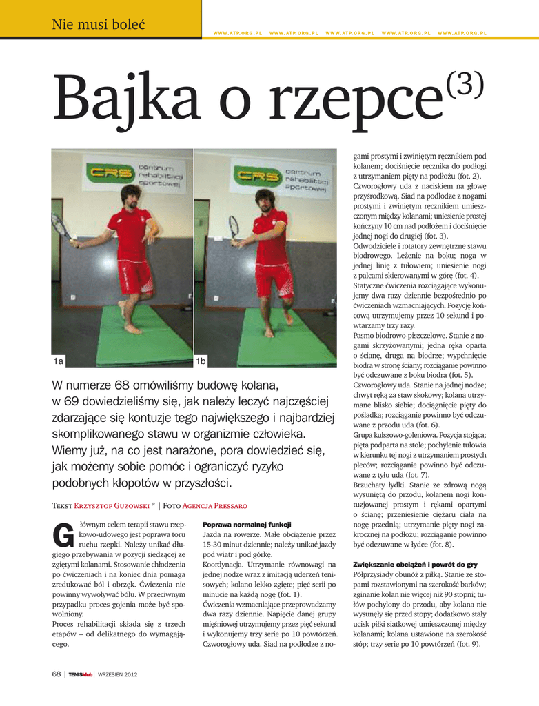 Nie musi boleç W W W . A T P. O R G . P L W W W . A T P. O R G . P L W W W . A T P. O R G . P L W W W . A T P. O R G . P L W W W . A T P. O R G . P L (3) Bajka o rzepce 1a 1b W numerze 68 omówiliÊmy budow´ kolana, w 69 dowiedzieliÊmy si´, jak nale˝y leczyç najcz´Êciej zdarzajàce si´ kontuzje tego najwi´kszego i najbardziej skomplikowanego stawu w organizmie człowieka. Wiemy ju˝, na co jest nara˝one, pora dowiedzieç si´, jak mo˝emy sobie pomóc i ograniczyç ryzyko podobnych kłopotów w przyszłoÊci. Tekst Krzysztof Guzowski * | Foto Agencja Pressaro łównym celem terapii stawu rzepkowo-udowego jest poprawa toru ruchu rzepki. Nale˝y unikaç długiego przebywania w pozycji siedzàcej ze zgi´tymi kolanami. Stosowanie chłodzenia po çwiczeniach i na koniec dnia pomaga zredukowaç ból i obrz´k. åwiczenia nie powinny wywoływaç bólu. W przeciwnym przypadku proces gojenia mo˝e byç spowolniony. Proces rehabilitacji składa si´ z trzech etapów – od delikatnego do wymagajàcego. G 68 | TENISklub| WRZESIE¡ 2012 Poprawa normalnej funkcji Jazda na rowerze. Małe obcià˝enie przez 15-30 minut dziennie; nale˝y unikaç jazdy pod wiatr i pod górk´. Koordynacja. Utrzymanie równowagi na jednej nodze wraz z imitacjà uderzeƒ tenisowych; kolano lekko zgi´te; pi´ç serii po minucie na ka˝dà nog´ (fot. 1). åwiczenia wzmacniajàce przeprowadzamy dwa razy dziennie. Napi´cie danej grupy mi´Êniowej utrzymujemy przez pi´ç sekund i wykonujemy trzy serie po 10 powtórzeƒ. Czworogłowy uda. Siad na podłodze z no- gami prostymi i zwini´tym r´cznikiem pod kolanem; dociÊni´cie r´cznika do podłogi z utrzymaniem pi´ty na podło˝u (fot. 2). Czworogłowy uda z naciskiem na głow´ przyÊrodkowà. Siad na podłodze z nogami prostymi i zwini´tym r´cznikiem umieszczonym mi´dzy kolanami; uniesienie prostej koƒczyny 10 cm nad podło˝em i dociÊni´cie jednej nogi do drugiej (fot. 3). Odwodziciele i rotatory zewn´trzne stawu biodrowego. Le˝enie na boku; noga w jednej lini´ z tułowiem; uniesienie nogi z palcami skierowanymi w gór´ (fot. 4). Statyczne çwiczenia rozciàgajàce wykonujemy dwa razy dziennie bezpoÊrednio po çwiczeniach wzmacniajàcych. Pozycj´ koƒcowà utrzymujemy przez 10 sekund i powtarzamy trzy razy. Pasmo biodrowo-piszczelowe. Stanie z nogami skrzy˝owanymi; jedna r´ka oparta o Êcian´, druga na biodrze; wypchni´cie biodra w stron´ Êciany; rozciàganie powinno byç odczuwane z boku biodra (fot. 5). Czworogłowy uda. Stanie na jednej nodze; chwyt r´kà za staw skokowy; kolana utrzymane blisko siebie; dociàgni´cie pi´ty do poÊladka; rozciàganie powinno byç odczuwane z przodu uda (fot. 6). Grupa kulszowo-goleniowa. Pozycja stojàca; pi´ta podparta na stole; pochylenie tułowia w kierunku tej nogi z utrzymaniem prostych pleców; rozciàganie powinno byç odczuwane z tyłu uda (fot. 7). Brzuchaty łydki. Stanie ze zdrowà nogà wysuni´tà do przodu, kolanem nogi kontuzjowanej prostym i r´kami opartymi o Êcian´; przeniesienie ci´˝aru ciała na nog´ przednià; utrzymanie pi´ty nogi zakrocznej na podło˝u; rozciàganie powinno byç odczuwane w łydce (fot. 8). Zwi´kszanie obcià˝eƒ i powrót do gry Półprzysiady obunó˝ z piłkà. Stanie ze stopami rozstawionymi na szerokoÊç barków; zginanie kolan nie wi´cej ni˝ 90 stopni; tułów pochylony do przodu, aby kolana nie wysun´ły si´ przed stopy; dodatkowo stały ucisk piłki siatkowej umieszczonej mi´dzy kolanami; kolana ustawione na szerokoÊç stóp; trzy serie po 10 powtórzeƒ (fot. 9). W W W . A T P. O R G . P L W W W . A T P. O R G . P L W W W . A T P. O R G . P L 2 W W W . A T P. O R G . P L W W W . A T P. O R G . P L W W W . A T P. O R G . P L 3 4 5a W W W . A T P. O R G . P L 5b Półprzysiady na schodku. Stanie jednonó˝ na stopniu z drugà nogà zwisajàcà poza kraw´dê; powolne obni˝enie sylwetki i dotkni´cie pi´tà podło˝a; kolano nogi podporowej powinno jak najmniej przemieÊciç si´ ku przodowi i do Êrodka; trzy serie po 10 powtórzeƒ (fot. 10). Drobnienie w miejscu. Stanie z nogami rozstawionymi szeroko; szybkie przenoszenie ci´˝aru ciała na stron´ prawà i lewà; 3 minuty. Bieg. Trucht po mi´kkim, równym terenie; zwi´kszenie tempa jest dozwolone, kiedy zawodnik mo˝e biec bez dolegliwoÊci przez 20 minut; nast´pnie nale˝y dodaç zmiany kierunków i przyspieszenia. Skoki. Przeskoki do przodu, na boki, na jednej nodze i skipy. Gra w tenisa mo˝e byç kontynuowana w trakcie podejmowania procesu terapii pod warunkiem, ˝e nie powoduje ona bólu. Uprawiajmy tenis przede wszystkim na kortach ziemnych, poczàtkowo unikajàc nawierzchni twardych, gdzie wykonywanie Êlizgów nie jest mo˝liwe. Czasowo zmodyfikujmy sposób gry i odbijajmy piłki jedynie w rejonie dwóch metrów kwadratowych dookoła siebie, aby wdra˝aç delikatnà prac´ nóg bez nadmiernych obcià˝eƒ kolana. Nast´pnie wprowadzajmy coraz bardziej wymagajàce uderzenia i çwiczenia na korcie. Na koniec rekomendowane jest wykonywanie niskich wolejów, smeczów z wyskoku i rozgrywanie meczów treningowych. Po dwóch tygodniach sparingów, bez odczuwania dolegliwoÊci, tenisista jest gotowy do uczestnictwa w turniejach. W pierwszych zawodach po przerwie unikajmy jednoczesnych wyst´pów w rozgrywkach singlowych i deblowych WRZESIE¡ 2012| TENISklub| 69 Ç Nie musi boleç W W W . A T P. O R G . P L W W W . A T P. O R G . P L W W W . A T P. O R G . P L Ç 6 7 8 9 W W W . A T P. O R G . P L W W W . A T P. O R G . P L .I ˝eby to było ostatni raz! Wi´kszoÊç urazów kolana wynika z jego przecià˝enia, dlatego tak wa˝ne jest wyeliminowanie wszelkich niedoskonałoÊci w technice zawodnika, bł´dów w metodyce treningu oraz zaniedbaƒ dotyczàcych sprz´tu i ubrania. Utrzymanie sprawnoÊci fizycznej na maksymalnie wysokim poziomie jest jednym w wa˝niejszych elementów prewencji urazów. Wykonujmy regularnie çwiczenia wzmacniajàce mi´Ênie ud. Stopniowo zwi´kszajmy ob