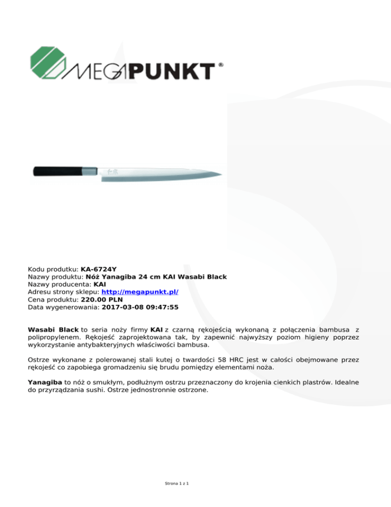 Kodu produtku: KA-6724Y Nazwy produktu: Nóż Yanagiba 24 cm KAI Wasabi Black Nazwy producenta: KAI Adresu strony sklepu: http://megapunkt.pl/ Cena produktu: 220.00 PLN Data wygenerowania: 2017-03-08 09:47:55 Wasabi Black to seria noży firmy KAI z czarną rękojeścią wykonaną z połączenia bambusa z polipropylenem. Rękojeść zaprojektowana tak, by zapewnić najwyższy poziom higieny poprzez wykorzystanie antybakteryjnych właściwości bambusa. Ostrze wykonane z polerowanej stali kutej o twardości 58 HRC jest w całości obejmowane przez rękojeść co zapobiega gromadzeniu się brudu pomiędzy elementami noża. Yanagiba to nóż o smukłym, podłużnym ostrzu przeznaczony do krojenia cienkich plastrów. Idealne do przyrządzania sushi. Ostrze jednostronnie ostrzone. Strona 1 z 1