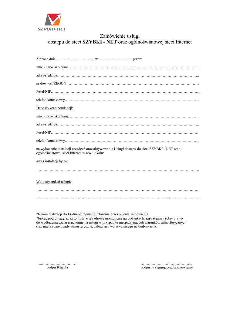 Zamówienie usługi dostępu do sieci SZYBKI - NET oraz ogólnoświatowej sieci Internet Złożone dnia ………………………… w ……………………… przez: imię i nazwisko/firma ……………………………………………………………………………………………. adres/siedziba…………………………………………………………………………………………………….. nr dow. os./REGON……………………………………………………………………………………………… Pesel/NIP………………………………………………………………………………………………………….. telefon kontaktowy……………………………………………………………………………………………….. Dane do korespondencji: imię i nazwisko/firma…………………………………………………………………………………………….. adres/siedziba…………………………………………………………………………………………………….. Pesel/NIP………………………………………………………………………………………………………… telefon kontaktowy……………………………………………………………………………………………….. na wykonanie instalacji urządzeń oraz aktywowanie Usługi dostępu do sieci SZYBKI - NET oraz ogólnoświatowej sieci Internet w n/w Lokalu: adres instalacji łącza: …………………….……………………………………………………………………………………………… Wybrany rodzaj usługi: ……………………………………………………………………………………………………………………. ……………………………………………………………………………………………………………………... *termin realizacji do 14 dni od momentu złożenia przez klienta zamówienia *biorąc pod uwagę, iż są to instalacje radiowe montowane na budynkach, zastrzegamy sobie prawo do wydłużenia czasu uruchomienia usługi w przypadku niesprzyjających warunków atmosferycznych (np. intensywne opady atmosferyczne, zalegająca warstwa śniegu na budynkach). ….…………………………. podpis Klienta ………………..………………….. podpis Przyjmującego Zamówienie