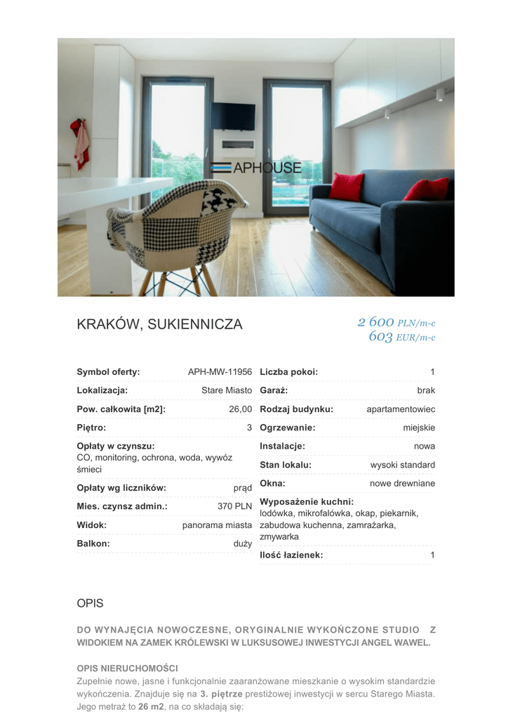 2 600 PLN/m-c 603 EUR/m-c KRAKÓW, SUKIENNICZA Symbol oferty: Lokalizacja: Pow. całkowita [m2]: APH-MW-11956 Liczba pokoi: Stare Miasto Garaż: 26,00 Rodzaj budynku: Piętro: 3 Ogrzewanie: Opłaty w czynszu: CO, monitoring, ochrona, woda, wywóz śmieci Opłaty wg liczników: Mies. czynsz admin.: Widok: Balkon: Instalacje: Stan lokalu: prąd Okna: 1 brak apartamentowiec miejskie nowa wysoki standard nowe drewniane 370 PLN Wyposażenie kuchni: lodówka, mikrofalówka, okap, piekarnik, panorama miasta zabudowa kuchenna, zamrażarka, zmywarka duży Ilość łazienek: 1 OPIS DO WYNAJĘCIA NOWOCZESNE, ORYGINALNIE WYKOŃCZONE STUDIO Z WIDOKIEM NA ZAMEK KRÓLEWSKI W LUKSUSOWEJ INWESTYCJI ANGEL WAWEL. OPIS NIERUCHOMOŚCI Zupełnie nowe, jasne i funkcjonalnie zaaranżowane mieszkanie o wysokim standardzie wykończenia. Znajduje się na 3. piętrze prestiżowej inwestycji w sercu Starego Miasta. Jego metraż to 26 m2, na co składają się: - w pełni wyposażony aneks kuchenny, - przestronny salon, - łazienka, - przedpokój, - balkon. Nieruchomość została wykończona przy użyciu materiałów najwyższej jakości, z dbałością o każdy szczegół. Ekskluzywnie wyposażony aneks kuchenny zawiera dużą lodówkę z zamrażarką, płytę indukcyjną, piekarnik z funkcją mikrofali, zmywarkę oraz pralkę. W salonie znajduje się wygodna rozkładana kanapa oraz TV. Każdy metr kwadratowy został tu ergonomicznie zaaranżowany aby stworzyć wygodną i zarazem funkcjonalną przestrzeń. Mieszkanie wyposażone jest w zaskakującą liczbę szaf oraz schowków. Z balkonu natomiast roztacza się piękny widok na Zamek Królewski oraz Bulwar Wiślany. Nieruchomość dostępna od zaraz. OPIS BUDYNKU: Najbardziej luksusowa lokalizacja w mieście - kompleks Angel Wawel oferuje swoim mieszkańcom liczne udogodnienia, takie jak strefa wellness z salą fitness, basenem oraz saunami, strefa lounge z salą kinową czy pokoju zabaw dla dzieci. Co więcej wyróżnia Inwestycję u podnóża Wzgórza Wawelskiego? Przygotowana specjalnie dla wymagających winna piwniczka, cigar-room i sala bilardowa. OPIS LOKALIZACJI: Budynek znajduje się w doskonałej lokalizacji - dokładnie pomiędzy Starym Miastem, Kazimierzem i Bulwarami Wiślanymi. CENA: Czynsz najmu 2600 zł + czynsz administracyjny ok. 370 zł + prąd, internet. Zapraszamy do kontaktu z naszym biurem w celu prezentacji nieruchomości. KONTAKT Izabela Myśliwiec +48 799 936 689 [email protected]