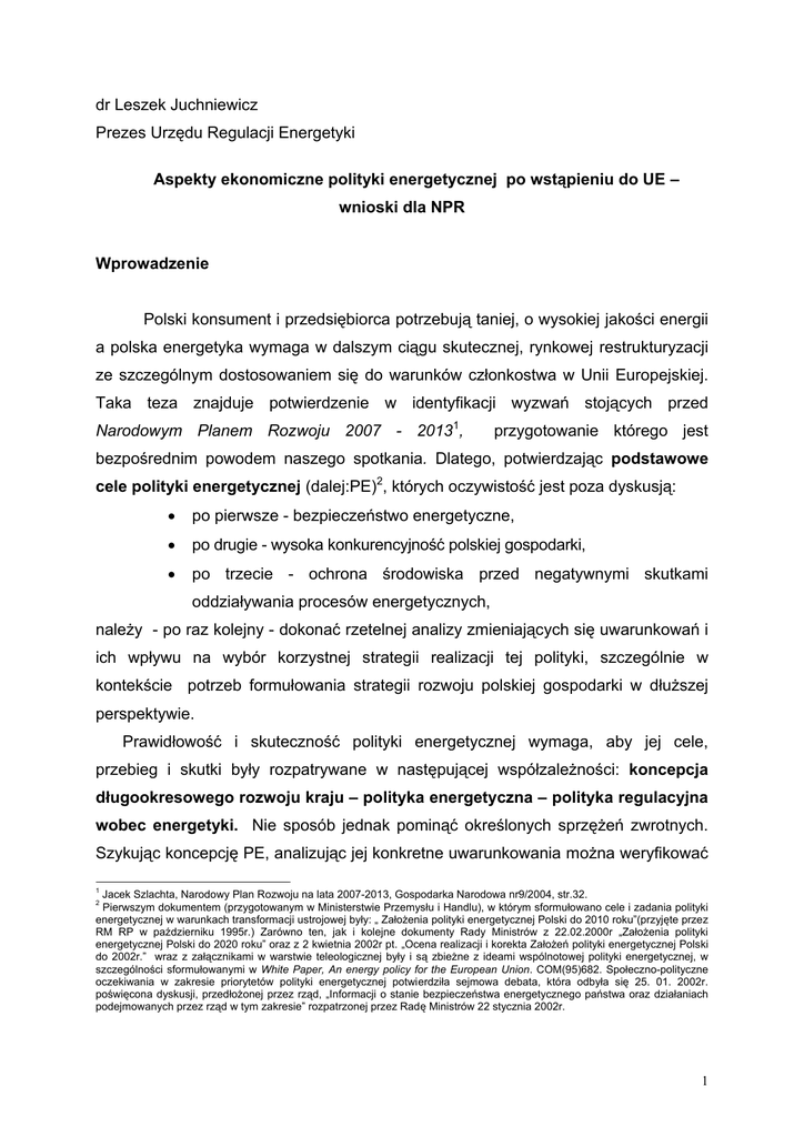 dr Leszek Juchniewicz Prezes Urzędu Regulacji Energetyki Aspekty ekonomiczne polityki energetycznej po wstąpieniu do UE – wnioski dla NPR Wprowadzenie Polski konsument i przedsiębiorca potrzebują taniej, o wysokiej jakości energii a polska energetyka wymaga w dalszym ciągu skutecznej, rynkowej restrukturyzacji ze szczególnym dostosowaniem się do warunków członkostwa w Unii Europejskiej. Taka teza znajduje potwierdzenie w identyfikacji wyzwań stojących przed Narodowym Planem Rozwoju 2007 - 20131, przygotowanie którego jest bezpośrednim powodem naszego spotkania. Dlatego, potwierdzając podstawowe cele polityki energetycznej (dalej:PE)2, których oczywistość jest poza dyskusją: • po pierwsze - bezpieczeństwo energetyczne, • po drugie - wysoka konkurencyjność polskiej gospodarki, • po trzecie - ochrona środowiska przed negatywnymi skutkami oddziaływania procesów energetycznych, należy - po raz kolejny - dokonać rzetelnej analizy zmieniających się uwarunkowań i ich wpływu na wybór korzystnej strategii realizacji tej polityki, szczególnie w kontekście potrzeb formułowania strategii rozwoju polskiej gospodarki w dłuższej perspektywie. Prawidłowość i skuteczność polityki energetycznej wymaga, aby jej cele, przebieg i skutki były rozpatrywane w następującej współzależności: koncepcja długookresowego rozwoju kraju – polityka energetyczna – polityka regulacyjna wobec energetyki. Nie sposób jednak pominąć określonych sprzężeń zwrotnych. Szykując koncepcję PE, analizując jej konkretne uwarunkowania można weryfikować 1 Jacek Szlachta, Narodowy Plan Rozwoju na lata 2007-2013, Gospodarka Narodowa nr9/2004, str.32. Pierwszym dokumentem (przygotowanym w Ministerstwie Przemysłu i Handlu), w którym sformułowano cele i zadania polityki energetycznej w warunkach transformacji ustrojowej były: „ Założenia polityki energetycznej Polski do 2010 roku”(przyjęte przez RM RP w październiku 1995r.) Zarówno ten, jak i kolejne dokumenty Rady Ministrów z 22.02.2000r „Założenia polityki energetycznej Polski do 2020 roku” oraz z 2 kwietnia 2002r pt. „Ocena realizacji i korekta Założeń polityki energetycznej Polski do 2002r.” wraz z załącznikami w warstwie teleologicznej były i są zbieżne z ideami wspólnotowej polityki energetycznej, w szczególności sformułowanymi w White Paper, An energy policy for the European Union. COM(95)682. Społeczno-polityczne oczekiwania w zakresie priorytetów polityki energetycznej potwierdziła sejmowa debata, która odbyła się 25. 01. 2002r. poświęcona dyskusji, przedłożonej przez rząd, „Informacji o stanie bezpieczeństwa energetycznego państwa oraz działaniach podejmowanych przez rząd w tym zakresie” rozpatrzonej przez Radę Ministrów 22 stycznia 2002r. 2 1 słuszność koncepcji długookresowego rozwoju. Obecnie cierpimy na niedostatek strategicznego, kompleksowego podejścia w polityce gospodarczej. Brak stosownej tego wizji. Należy zatem mieć nadzieję, że uda się zrealizować polityczne zapowiedzi NPR3 dotyczące i polityka gospodarcza uzyska przynajmniej perspektywę średniookresową, w której właściwą rolę spełni energetyka - rolę służebną! Celem rozwoju polskiej gospodarki jest rosnący poziom i jakość życia obywateli osiągany poprzez trwały, efektywny wzrost ekonomiczny - z zachowaniem poszanowania zasad ochrony środowiska - ze szczególnym ukierunkowaniem polityki długookresowej na minimalizację niewykorzystania zasobów pracy. Pomocą może być umiejętne i szybkie zdyskontowanie szans stworzonych członkostwem Polski w UE, a zatem m.in. popieranie w unijnej polityce gospodarczej takich kierunków i sposobów realizacji, które przyczyniają się do przyspieszania rozwoju gospodarczego (m.in. Strategia Lizbońska). Nieodzowną przesłanką polityki rozwoju są również prognozy zużycia i podaży poszczególnych nośników energii, natomiast strategia ich zbilansowania - dostępność poszczególnych nośników energii i ich cen warunkująca postęp ekonomiczny kraju jest przedmiotem polityki energetycznej. Prace koncepcyjne nad polską polityką energetyczną, rozpatrywane w nawiązaniu do NPR, muszą brać pod uwagę szeroki kontekst zagadnień społecznoekonomicznych, analizowany przede wszystkim z punktu widzenia rozpoznawania barier efektywnego rozwoju kraju i ukierunkowywania działań polityki regulacyjnej na ich pokonywanie. Wtedy być może szanse – rezerwy, szeroko mówiąc kosztowe4, tkwiące w energetyce, jako jednego z elementarnych uwarunkowań gospodarowania zostaną przekute w realia. Co zatem jest w tym najistotniejsze, na co należy w pierwszej kolejności zwracać uwagę? W moim przekonaniu należałoby to porządkować stosownie do następujących uwarunkowań: 1. Naturalne - dominacja węgla, bogate zasoby geotermalne, deficyt gazu; 2. Społeczne - niski poziom cywilizacyjny, brak wiedzy, fobie i mity, przywiązanie do suwerenności; 3 Założenia do NPR 2007 – 2013, przyjęte przez Radę Ministrów 30 kwietnia 2004r. Gdy się mówi o energetyce to głównie podkreśla się konieczność wzrostu nakładów, a zapomina się o tym, że efektywność energetyczna – syntetyczna miara produkcji i wykorzystania energii – jest Polsce przynajmniej 3 razy niższa od średniej „starej” UE. 4 2 3. Polityczne – specyficzny układ sił politycznych: dominacja grup branżowych a brak siły interesu publicznego, brak de facto długookresowej wizji rozwoju polskiego państwa, gospodarki i społeczeństwa, brak świadomości i myślenia (realnego a nie sloganowego) o sytuacji Polski po akcesji; 4. Systemowe - hybrydowy: niedojrzała w pełni gospodarka rynkowa; 5. Zewnętrzne - przynależność do UE, geografia zasobów energetycznych w Europie, ich eksploatacji i tranzytu; 6. Ekonomiczne - niski poziom rozwoju, zacofana struktura wytwarzania i spożycia PKB, relatywnie wysokie ceny energii i jej inwestycji; 7. Techn