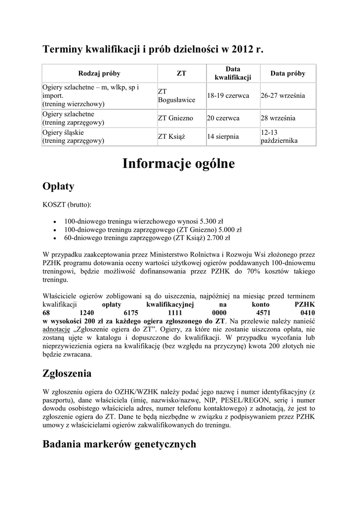 Terminy kwalifikacji i prób dzielności w 2012 r. Rodzaj próby Data kwalifikacji Data próby ZT Bogusławice 18-19 czerwca 26-27 września ZT Gniezno 20 czerwca 28 września ZT Książ 14 sierpnia 12-13 października ZT Ogiery szlachetne – m, wlkp, sp i import. (trening wierzchowy) Ogiery szlachetne (trening zaprzęgowy) Ogiery śląskie (trening zaprzęgowy) Informacje ogólne Opłaty KOSZT (brutto): 100-dniowego treningu wierzchowego wynosi 5.300 zł 100-dniowego treningu zaprzęgowego (ZT Gniezno) 5.000 zł 60-dniowego treningu zaprzęgowego (ZT Książ) 2.700 zł W przypadku zaakceptowania przez Ministerstwo Rolnictwa i Rozwoju Wsi złożonego przez PZHK programu dotowania oceny wartości użytkowej ogierów poddawanych 100-dniowemu treningowi, będzie możliwość dofinansowania przez PZHK do 70% kosztów takiego treningu. Właściciele ogierów zobligowani są do uiszczenia, najpóźniej na miesiąc przed terminem kwalifikacji opłaty kwalifikacyjnej na konto PZHK 68 1240 6175 1111 0000 4571 0410 w wysokości 200 zł za każdego ogiera zgłoszonego do ZT. Na przelewie należy nanieść adnotację „Zgłoszenie ogiera do ZT”. Ogiery, za które nie zostanie uiszczona opłata, nie zostaną ujęte w katalogu i dopuszczone do kwalifikacji. W przypadku wycofania lub nieprzywiezienia ogiera na kwalifikację (bez względu na przyczynę) kwota 200 złotych nie będzie zwracana. Zgłoszenia W zgłoszeniu ogiera do OZHK/WZHK należy podać jego nazwę i numer identyfikacyjny (z paszportu), dane właściciela (imię, nazwisko/nazwę, NIP, PESEL/REGON, serię i numer dowodu osobistego właściciela adres, numer telefonu kontaktowego) z adnotacją, że jest to zgłoszenie ogiera do ZT. Dane te będą niezbędne w związku z podpisywaniem przez PZHK umowy z właścicielami ogierów zakwalifikowanych do treningu. Badania markerów genetycznych Zgłoszone do OZHK/WZHK ogiery MUSZĄ mieć potwierdzone pochodzenie po obojgu rodzicach. Pochodzenie potwierdza się na podstawie badań markerów genetycznych ogiera i jego rodziców. PZHK upoważnił do wykonywania badań dwa laboratoria: w Poznaniu i Chorzelowie. Brak badań lub niezgodność pary rodzicielskiej spowoduje, że ogier nie zostanie ujęty w katalogu PZHK i nie ma prawa przystąpić do kwalifikacji. UWAGA: Laboratorium od momentu uzyskania materiału genetycznego (próbek krwi) potrzebuje 30 dni na wykonanie badania. Ogiery hodowli zagranicznej Ogiery zagraniczne (z właściwych ksiąg stadnych – patrz strona pzhk.pl) muszą zostać zgłoszone do właściwego OZHK/WZHK oraz wpisane do bazy PZHK. Należy pamiętać, iż w paszporcie zagranicznym ogiera winien być wpisany polski właściciel, a dokonać tego winien związek rodzimy (czyli zagraniczny), który wydał paszport. W celu zarejestrowania ogiera hodowli zagranicznej w polskiej bazie pracownik odpowiedniego OZHK/WZHK musi zidentyfikować konia, m. in. poprzez porównanie z opisem graficznym w jego paszporcie. Pracownik OZHK/WZHK wykonuje kserokopię stron z paszportu: z datą urodzenia i nazwą, z rodowodem i opisem oraz ze stroną z wpisanym polskim właścicielem i nazwą pod jaką został zarejestrowany koń. Jeżeli dokumenty konia nie zostały wystawione w języku angielskim, francuskim lub niemieckim, właściciel jest zobowiązany przetłumaczyć je u tłumacza przysięgłego i tłumaczenie to wraz z oryginalnym dokumentem hodowlanym dostarczyć do OZHK/WZHK. Zdrowie Ogiery muszą posiadać świadectwo zdrowia wystawione przez lekarza weterynarii oraz paszport konia z wpisanymi szczepieniami przeciwko grypie. Brak szczepień bądź jakiekolwiek nieprawidłowości w schemacie szczepień spowodują niedopuszczenie ogiera do kwalifikacji. Obowiązuje następujący schemat szczepień: 1. szczepienia bazowe: o pierwsze szczepienie – w dniu rozpoczęcia szczepień o drugie szczepienie – nie wcześniej niż 21. dnia i nie później niż 92. dnia od pierwszego szczepienia 2. szczepienie przypominające: o co 6 miesięcy od ostatniego szczepienia (dopuszczalny jest 21-dniowy okres przekroczenia terminu); o żadne szczepienie przypominające nie może się odbyć później niż 7 dni przed przybyciem na kwalifikację. W przypadku wszelkiego rodzaju zmian skórnych, właściciel zobligowany jest przedstawić wynik badania laboratoryjnego z okresu nie wcześniej niż dwu tygodni przed kwalifikacją. Brak wyników badań skutkować będzie nie przyjęciem ogiera do ZT. Ogier bez oporów musi podawać wszystkie nogi. W czasie kwalifikacji ogier nie może być pod wpływem środków pobudzających ani uspokajających (doping). Kierownik Zakładu ma prawo do 14 dnia po kwalifikacji wycofać ogiera z treningu, gdy jego zachowanie odbiega od normy. O tym fakcie musi być powiadomiony właściciel (pisemnie) oraz PZHK (pisemnie). Przybywające do ZT ogiery, mimo braku widocznych zmian skórnych, mogą być nosicielami np. grzybicy i pomimo przestrzegania zasad higieny przez organizatora treningu osobniki mniej odporne mogą się nabawić tej choroby i zostać czasowo wycofane z pracy, co odbije się na wyniku próby dzielności. Dlatego zalecamy, aby przybywające na kwalifikacje ogiery zostały uodpornione na tę chorobę za pomocą szczepienia przeciw grzybicy (podobna zasada obowiązuje np. w Niemczech). Uwaga: na każdym etapie kwalifikacji i treningu wykluczone zostaną ogiery, u których stwierdzi się występowanie wad zwrotnych (łykawość, dychawica świszcząca, wartogłowienie, ślepota miesięczna) oraz wad uniemożliwiających wpis do księgi (obustronna ślepota, nieprawidłowa budowa szczęki – zgryz karpiowaty lub zgryz szczupaczy, jedno- lub obustronne wnętrostwo, szpat kostny, zajęczak oraz porażenie krtani). Powtórny trening: Ogier, który: zostanie wycofany z ZT z powodu kontuzji, zostanie wycofany przez właściciela przed końcem treningu, nie zda próby dzielności (ocena niedostateczna), zda próbę dzielności, ale z wynikiem niewystarczającym do wpi