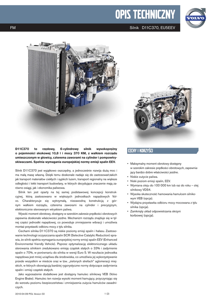 OPIS TECHNICZNY Silnik D11C370, EU5EEV FM D11C370 to rzędowy, 6-cylindrowy silnik wysokoprężny o pojemności skokowej 10,8 l i mocy 370 KM, z wałkiem rozrządu umieszczonym w głowicy, czterema zaworami na cylinder i pompowtryskiwaczami. Spełnia wymagania europejskiej normy emisji spalin EEV. Silnik D11C370 jest wyjątkowo oszczędny, a jednocześnie rozwija dużą moc i ma małą masę własną. Dzięki temu doskonale nadaje się do zastosowań,takich jak transport materiałów ciekłych i sypkich luzem, transport regionalny na większe odległości i lekki transport budowlany, w których decydujące znaczenie mają zarówno osiągi, jak i ekonomika paliwowa. Silnik ten jest oparty na tej samej podstawowej koncepcji konstrukcyjnej, którą zastosowano w większych jednostkach napędowych Volvo. Charakteryzuje się wytrzymałą, niezawodną konstrukcją z górnym wałkiem rozrządu, czterema zaworami na cylinder i precyzyjnym, elektronicznie sterowanym wtryskiem paliwa. Wysoki moment obrotowy, dostępny w szerokim zakresie prędkości obrotowych zapewnia doskonałe właściwości jezdne. Mechanizm rozrządu znajduje się w tylnej części jednostki napędowej, co powoduje zmniejszenie wibracji i umożliwia montaż przystawki odbioru mocy z tyłu silnika. Cechami silnika D11C370 są niskie poziomy emisji spalin i hałasu. Zastosowanie technologii oczyszczania spalin SCR (Selective Catalytic Reduction) sprawia, że silnik spełnia wymagania europejskiej normy emisji spalin EEV (Enhanced Environmental friendly Vehicle). Poprzez optymalizację elektronicznego układu sterowania silnikiem zredukowano emisję cząstek stałych o 33% i zadymienie spalin o 70%, w porównaniu do silnika w wersji Euro 5. W rezultacie jednostka napędowa jest mniej uciążliwa dla środowiska, co umożliwia jej wykorzystywanie przede wszystkim w mieście oraz w tzw. „zielonych strefach” aglomeracji miejskich, w których obowiązują bardziej rygorystyczne normy dotyczące zadymienia spalin i emisji cząstek stałych. Jako wyposażenie dodatkowe jest dostępny hamulec silnikowy VEB (Volvo Engine Brake). Hamulec ten rozwija wysoki moment hamujący, przyczyniając się do wzrostu poziomu bezpieczeństwa i zmniejszenia zużycia hamulców zasadniczych. 2010-04-09 POL Version 02 1 (2) Cechy i korzyści • Maksymalny moment obrotowy dostępny w szerokim zakresie prędkości obrotowych, zapewniający bardzo dobre właściwości jezdne. • Niskie zużycie paliwa. • Niski poziom emisji spalin, EEV. • Wymiana oleju do 100 000 km lub raz do roku – olej silnikowy VDS4. • Wysoka skuteczność hamowania hamulcem silnikowym VEB (opcja). • Wydajna przystawka odbioru mocy mocowana z tyłu silnika (opcja). • Zamknięty układ odpowietrzania skrzyni korbowej (opcja). OPIS TECHNICZNY FM Silnik D11C370, EU5EEV Niskie zużycie paliwa i dobre właściwości jezdne Zamknięty układ odpowietrzania skrzyni korbowej W silniku D11C zastosowano pompowtryskiwacze zapewniające wysokie ciśnienie wtrysku. Konstrukcja komory spalania i kolektora dolotowego sprzyja optymalnemu przebiegowi procesu spalania. Rezultatem jest wysoki współczynnik napełniania, zwiększający sprawność silnika. Silnik jest oszczędny, a jednocześnie rozwija dużą moc i wysoki moment obrotowy w szerokim zakresie prędkości obrotowych. Dzięki wszystkim tym cechom silnik D11C zapewnia wyjątkowo dobre właściwości jezdne. Silnik D11C może być wyposażony w zamknięty układ odpowietrzania skrzyni korbowej (opcja). W takim przypadku gazy spod pokrywy zaworów są kierowane, za pośrednictwem bezobsługowego, odśrodkowego separatora oleju, do turbosprężarki. Dzięki ponownemu wykorzystaniu gazów ze skrzyni korbowej silnik jest wyjątkowo czysty i przyjazny środowisku. Tylny mechanizm rozrządu i przystawka odbioru mocy Mechanizm rozrządu znajduje się z tyłu silnika i napędza pompę wspomagania układu kierowniczego, pompę oleju, pompę paliwową oraz sprężarkę powietrza. Dzięki temu jednostka napędowa ma zwartą budowę, jest cicha, lekka i w pełni hermetyczna. Tylny mechanizm rozrządu poprawia także wydajność chłodzenia, ponieważ nie blokuje strumienia powietrza opływającego silnik. Do silnika D11C można zamocować przystawkę odbioru mocy (PTO), wyposażoną w kołnierz napędowy lub złącze do bezpośredniego montażu pompy hydraulicznej. Umiejscowienie przystawki PTO z tyłu silnika, w pobliżu koła zamachowego, umożliwia odbiór wysokich momentów obrotowych, do 1000 Nm przy pracy ciągłej. Zgodność z normami emisji spalin dzięki technologii SCR Aby zmniejszyć emisję tlenków azotu, silnik wyposażono w układ oczyszczania spalin wykorzystujący technologię selektywnej redukcji katalitycznej SCR (Selective Catalytic Reduction). W procesie oczyszczania reduktor AdBlue, jest wtryskiwany do spalin, zanim jeszcze przejdą one przez katalizator SCR. Wewnątrz katalizatora substancja AdBlue reaguje z tlenkami azotu zawartymi w spalinach, znacznie obniżając poziom emisji tych zanieczyszczeń. W rezultacie silnik D11C uzyskał certyfikat zgodności z europejską normą emisji spalin EEV. Niski poziom hałasu na biegu jałowym Silnik D11C spełnia wszystkie wymagania dotyczące emisji hałasu. Wał korbowy i wałek rozrządu są wyposażone w hydrauliczne tłumiki drgań, które skutecznie eliminują hałas i wibracje. Wstępny wtrysk paliwa zapewnia niski poziom emisji hałasu przy prędkości obrotowej biegu jałowego. Power hp Torque Nm 450 2200 430 410 DANE TECHNICZNE 1750 Nm 950-1400 r/min 370 Typ....................................................................................... D11C370, EU5EEV Moc maksymalna przy 1600-1900 obr/min.................. 370 KM (272 kW) Maks. prędkość obrotowa.......................................................... 2200 obr/min Maks. moment obrotowy przy 950–1400 obr/min.......................1750 Nm Liczba cylindrów...............................................