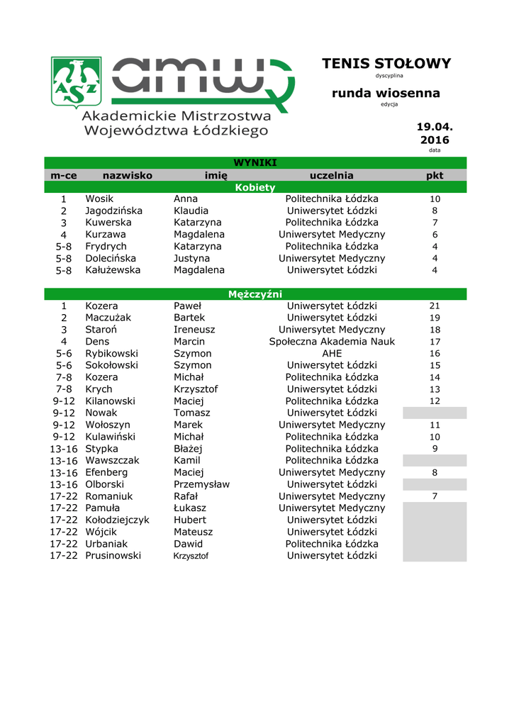 TENIS STOŁOWY dyscyplina runda wiosenna edycja 19.04. 2016 data WYNIKI m-ce 1 2 3 4 5-8 5-8 5-8 1 2 3 4 5-6 5-6 7-8 7-8 9-12 9-12 9-12 9-12 13-16 13-16 13-16 13-16 17-22 17-22 17-22 17-22 17-22 17-22 nazwisko imię Kobiety uczelnia pkt Politechnika Łódzka Uniwersytet Łódzki Politechnika Łódzka Uniwersytet Medyczny Politechnika Łódzka Uniwersytet Medyczny Uniwersytet Łódzki 10 8 7 6 4 4 4 Wosik Jagodzińska Kuwerska Kurzawa Frydrych Dolecińska Kałużewska Anna Klaudia Katarzyna Magdalena Katarzyna Justyna Magdalena Kozera Maczużak Staroń Dens Rybikowski Sokołowski Kozera Krych Kilanowski Nowak Wołoszyn Kulawiński Stypka Wawszczak Efenberg Olborski Romaniuk Pamuła Kołodziejczyk Wójcik Urbaniak Prusinowski Mężczyźni Paweł Uniwersytet Łódzki Bartek Uniwersytet Łódzki Ireneusz Uniwersytet Medyczny Marcin Społeczna Akademia Nauk Szymon AHE Szymon Uniwersytet Łódzki Michał Politechnika Łódzka Krzysztof Uniwersytet Łódzki Maciej Politechnika Łódzka Tomasz Uniwersytet Łódzki Marek Uniwersytet Medyczny Michał Politechnika Łódzka Błażej Politechnika Łódzka Kamil Politechnika Łódzka Maciej Uniwersytet Medyczny Przemysław Uniwersytet Łódzki Rafał Uniwersytet Medyczny Łukasz Uniwersytet Medyczny Hubert Uniwersytet Łódzki Mateusz Uniwersytet Łódzki Dawid Politechnika Łódzka Krzysztof Uniwersytet Łódzki 21 19 18 17 16 15 14 13 12 11 10 9 8 7
