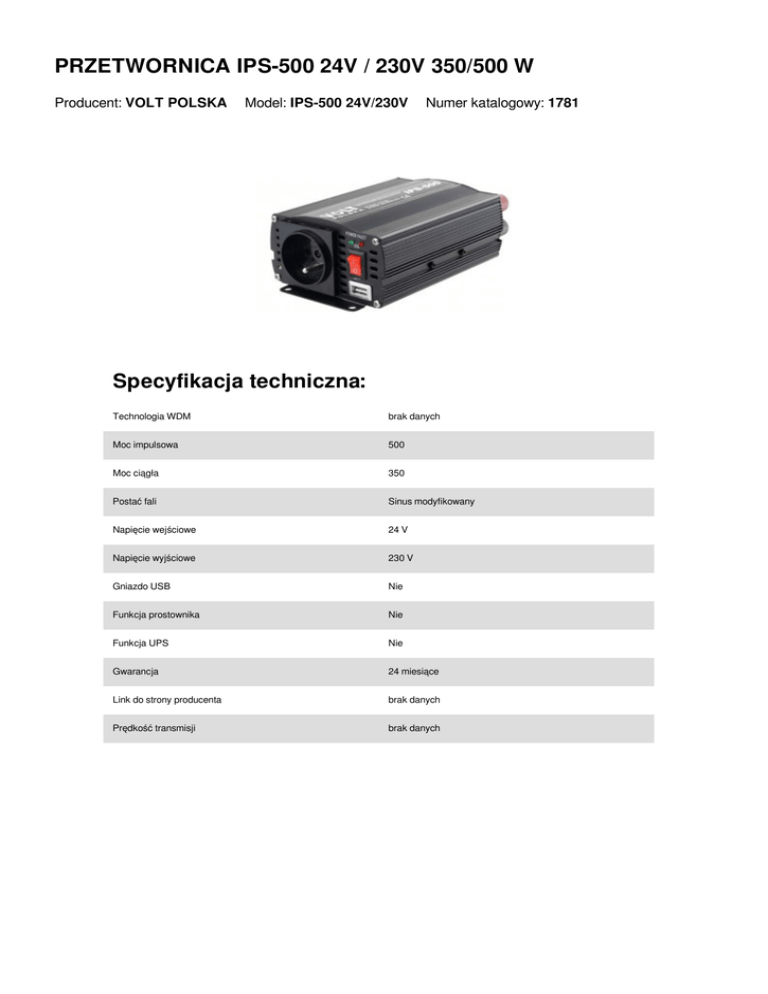 PRZETWORNICA IPS-500 24V / 230V 350/500 W Producent: VOLT POLSKA Model: IPS-500 24V/230V Numer katalogowy: 1781 Specyfikacja techniczna: Technologia WDM brak danych Moc impulsowa 500 Moc ciągła 350 Postać fali Sinus modyfikowany Napięcie wejściowe 24 V Napięcie wyjściowe 230 V Gniazdo USB Nie Funkcja prostownika Nie Funkcja UPS Nie Gwarancja 24 miesiące Link do strony producenta brak danych Prędkość transmisji brak danych