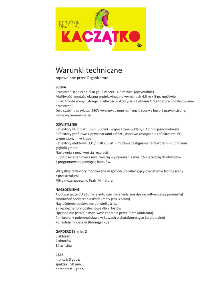 Warunki techniczne zapewnione przez Organizatora SCENA Przestrzeñ sceniczna: 5 m g³., 6 m szer., 4,5 m wys. (optymalnie) Mo¿liwoœæ monta¿u ekranu projekcyjnego o wymiarach 4,5 m x 5 m, mo¿liwie blisko frontu sceny (istnieje mo¿liwoœæ wykorzystania ekranu Organizatora i dostosowanie przestrzeni) Dwa stabilne przy³¹cza 230V wyprowadzone na froncie sceny z lewej i prawej strony. Pe³ne wyciemnienie sali OŒWIETLENIE Reflektory PC x 6 szt. (min. 500W) , wyposa¿one w klapy - 2 x filtr jasnoniebieski Reflektory profilowe z przycinarkami x 6 szt.; mo¿liwe zast¹pienie reflektorami PC wyposa¿onymi w klapy. Reflektory efektowe LED / RGB x 3 szt. - mo¿liwe zast¹pienie reflektorami PC z filtrem g³êboki granat Nastawnia z mo¿liwoœci¹ regulacji. Pulpit oœwietleniowy z mo¿liwoœci¹ wysterowania min. 16 niezale¿nych obwodów z programowan¹ pamiêci¹ kana³ów. Wszystkie reflektory montowane w sposób umo¿liwiaj¹cy oœwietlenie frontu sceny z przestrza³ami. Filtry mo¿e zapewniæ Teatr Miniatura. NAG£OŒNIENIE 4 odtwarzacze CD z funkcj¹ auto cue (mile widziane dj-skie odtwarzacze pioneer'a) Mo¿liwoœæ pod³¹czenia iPada (ma³y jack 3.5mm) Nag³oœnienie adekwatne do wielkoœci sali 2 niezale¿ne tory ods³uchowe dla artystów Opcjonalnie (istnieje mo¿liwoœæ zabrania przez Teatr Miniatura): 4 mikrofony pojemnoœciowe w koszach o charakterystyce kardioidalnej Konsoleta mikserska Behringer x32 GARDEROBY: min. 2 5 aktorek 2 aktorów 1 harfistka CZAS monta¿: 3 godz. spektakl: 50 min. demonta¿: 1 godz.