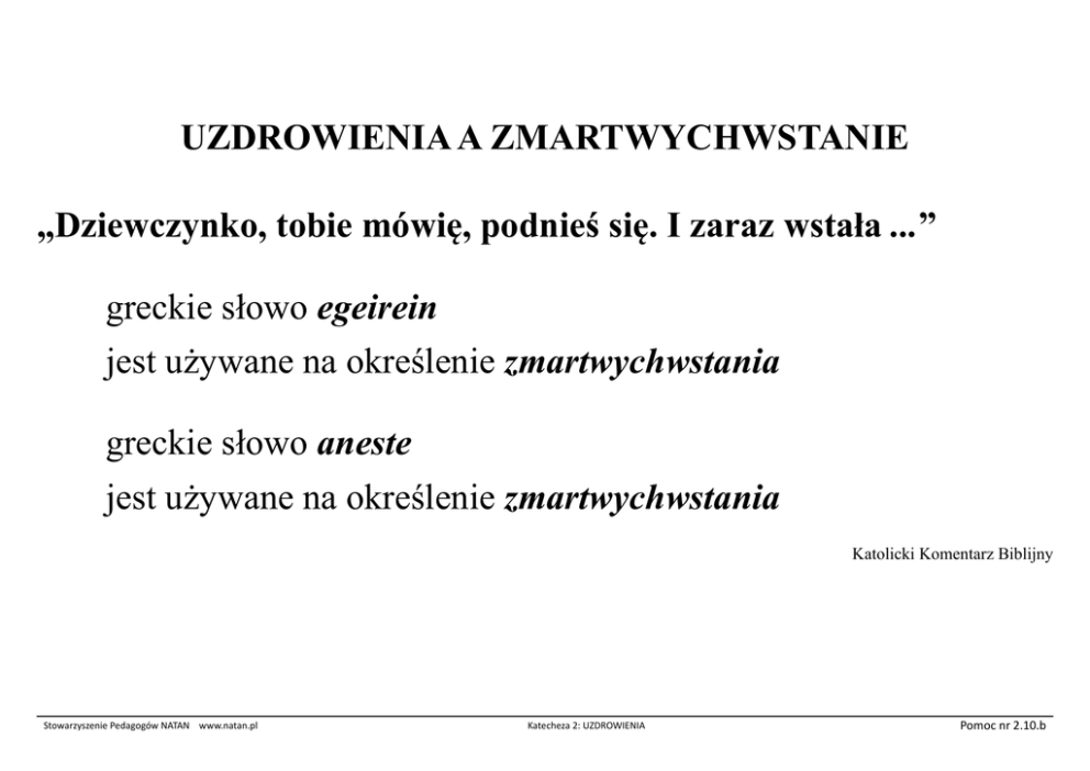 UZDROWIENIA A ZMARTWYCHWSTANIE „Dziewczynko, tobie mówię, podnieś się. I zaraz wstała ...” greckie słowo egeirein jest używane na określenie zmartwychwstania greckie słowo aneste jest używane na określenie zmartwychwstania Katolicki Komentarz Biblijny Stowarzyszenie Pedagogów NATAN www.natan.pl Katecheza 2: UZDROWIENIA Pomoc nr 2.10.b