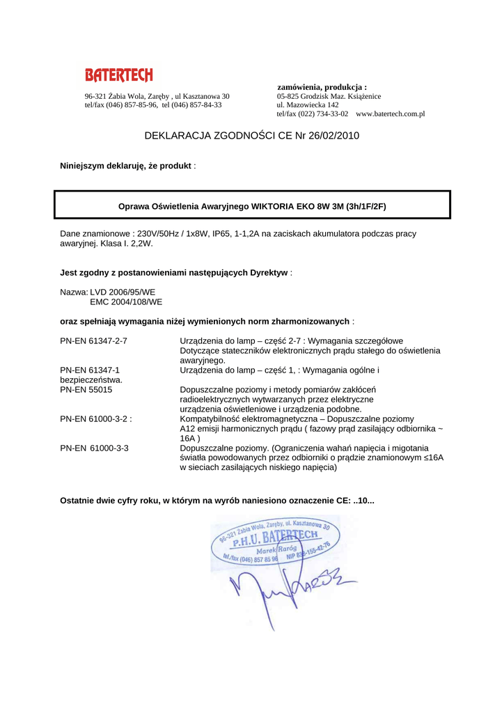 zamówienia, produkcja : 96-321 Żabia Wola, Zaręby , ul Kasztanowa 30 tel/fax (046) 857-85-96, tel (046) 857-84-33 05-825 Grodzisk Maz. Książenice ul. Mazowiecka 142 tel/fax (022) 734-33-02 www.batertech.com.pl DEKLARACJA ZGODNOŚCI CE Nr 26/02/2010 Niniejszym deklaruję, że produkt : Oprawa Oświetlenia Awaryjnego WIKTORIA EKO 8W 3M (3h/1F/2F) Dane znamionowe : 230V/50Hz / 1x8W, IP65, 1-1,2A na zaciskach akumulatora podczas pracy awaryjnej. Klasa I. 2,2W. Jest zgodny z postanowieniami następujących Dyrektyw : Nazwa: LVD 2006/95/WE EMC 2004/108/WE oraz spełniają wymagania niżej wymienionych norm zharmonizowanych : PN-EN 61347-2-7 PN-EN 61347-1 bezpieczeństwa. PN-EN 55015 PN-EN 61000-3-2 : PN-EN 61000-3-3 Urządzenia do lamp – część 2-7 : Wymagania szczegółowe Dotyczące stateczników elektronicznych prądu stałego do oświetlenia awaryjnego. Urządzenia do lamp – część 1, : Wymagania ogólne i Dopuszczalne poziomy i metody pomiarów zakłóceń radioelektrycznych wytwarzanych przez elektryczne urządzenia oświetleniowe i urządzenia podobne. Kompatybilność elektromagnetyczna – Dopuszczalne poziomy A12 emisji harmonicznych prądu ( fazowy prąd zasilający odbiornika ~ 16A ) Dopuszczalne poziomy. (Ograniczenia wahań napięcia i migotania światła powodowanych przez odbiorniki o prądzie znamionowym ≤16A w sieciach zasilających niskiego napięcia) Ostatnie dwie cyfry roku, w którym na wyrób naniesiono oznaczenie CE: ..10...