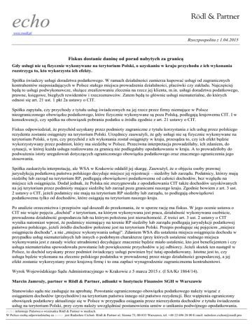 echo www.roedl.pl Rzeczpospolita z 1.04.2015 Fiskus dostanie daninę od porad nabytych za granicą Gdy usługi nie są fizycznie wykonywane na terytorium Polski, o uzyskaniu w kraju przychodu z ich wykonania rozstrzyga to, kto wykorzysta ich efekty. Spółka świadczy usługi doradztwa podatkowego. W ramach działalności zamierza kupować usługi od zagranicznych kontrahentów nieposiadających w Polsce stałego miejsca prowadzenia działalności, placówki czy zakładu. Najczęściej będą to usługi podwykonawcze, służące zrealizowaniu zlecenia na rzecz jej klienta, m.in. usługi doradztwa podatkowego, prawne, księgowe, biegłych rewidentów i rzeczoznawców. Zatem będą to głównie usługi niematerialne, do których odnosi się art. 21 ust. 1 pkt 2a ustawy o CIT. Spółka zapytała, czy przychody z tytułu usług świadczonych na jej rzecz przez firmy niemające w Polsce nieograniczonego obowiązku podatkowego, które fizycznie wykonywane są poza Polską, podlegają krajowemu CIT. I w konsekwencji, czy spółka na obowiązek pobrania podatku u źródła zgodnie z art. 21 ustawy o CIT. Fiskus odpowiedział, że przychód uzyskany przez podmioty zagraniczne z tytułu korzystania z ich usług przez polskiego rezydenta zostanie osiągnięty na terytorium Polski. Urzędnicy zauważyli, że gdy usługi nie są fizycznie wykonywane na terytorium Polski, o tym, czy przychód z ich wykonania został osiągnięty w kraju, przesądza to, czy ich efekt będzie wykorzystywany przez podmiot, który ma siedzibę w Polsce. Przeciwna interpretacja prowadziłaby, ich zdaniem, do sytuacji, w której każda usługa realizowana za granicą nie podlegałaby opodatkowaniu w kraju. A to prowadziłoby do podważenia istoty uregulowań dotyczących ograniczonego obowiązku podatkowego oraz znacznego ograniczenia jego stosowania. Spółka zaskarżyła interpretację, ale WSA w Krakowie oddalił jej skargę. Zauważył, że o objęciu osoby prawnej jurysdykcją podatkową państwa polskiego decyduje miejsce jej rejestracji – siedziby lub zarządu. Podatnicy, którzy mają siedzibę lub zarząd na terytorium RP, podlegają obowiązkowi podatkowemu od całości dochodów, bez względu na miejsce ich osiągnięcia. Dodał jednak, że Polska nie zrezygnowała z opodatkowania CIT także dochodów uzyskiwanych na jej terytorium przez podmioty mające siedzibę lub zarząd poza granicami naszego kraju. Zgodnie bowiem z art. 3 ust. 2 ustawy o CIT, jeżeli podatnicy nie mają na terytorium RP siedziby lub zarządu, to podlegają obowiązkowi podatkowemu tylko od dochodów, które osiągają na terytorium naszego kraju. Po analizie orzecznictwa i przepisów sąd doszedł do przekonania, że w sporze rację ma fiskus. W jego ocenie ustawa o CIT nie wiąże pojęcia „dochód" z terytorium, na którym wykonywana jest praca, działalność wykonywana osobiście, prowadzona działalność gospodarcza lub na którym położona jest nieruchomość. Z treści art. 3 ust. 2 ustawy o CIT wynika natomiast wprost, że podatnicy niemający na terenie RP siedziby lub zarządu podlegają jurysdykcji podatkowej państwa polskiego, jeżeli źródło dochodów położone jest na terytorium Polski. Przepis posługuje się pojęciem „miejsce osiągnięcia dochodu", a nie „miejsce wykonywania usługi". Zdaniem WSA dla ustalenia miejsca osiągnięcia dochodu w przypadku usług niematerialnych lub innych o podobnym charakterze (przy których ustalenie realnego miejsca wykonywania jest z zasady wielce utrudnione) decydujące znaczenie będzie miało ustalenie, kto jest beneficjentem i czy usługa niematerialna spowodowała powstanie lub powiększenie przychodów u jej odbiorcy. Jeżeli skutek ten nastąpił w Polsce, to dochód uzyskany przez podmiot świadczący usługi powinien być tutaj opodatkowany. Istotne jest to, czy usługa będzie wykonana na zlecenie polskiego podatnika w prowadzonej przez niego działalności gospodarczej, a jej efekt zostanie wykorzystany przez krajową firmę i to ona zapłaci wynagrodzenie zagranicznemu kontrahentowi. Wyrok Wojewódzkiego Sądu Administracyjnego w Krakowie z 5 marca 2015 r. (I SA/Kr 1864/14). Marcin Jamroży, partner w Rödl & Partner, adiunkt w Instytucie Finansów SGH w Warszawie Stanowisko sądu nie zasługuje na aprobatę. Powstanie ograniczonego obowiązku podatkowego należy wiązać z osiąganiem dochodów (przychodów) na terytorium państwa innego niż państwo rezydencji. Bez wątpienia ograniczony obowiązek podatkowy aktualizuje się w Polsce w przypadku osiągania przez nierezydenta dochodów z tytułu świadczenia usług na terytorium Polski, przy czym należy uwzględniać postanowienia umów o unikaniu podwójnego opodatkowania. echo informuje Państwa o wizerunku Rödl & Partner w mediach. W Polsce osobą odpowiedzialną za echo jest Radosław Cichoń Rödl & Partner ul. Sienna 73, 00-833 Warszawa, tel. +48 22 696 28 00 E-mail: [email protected] Natomiast przy usługach świadczonych za granicą dochód (przychód) uzyskiwany przez kontrahenta zagranicznego nie spełnia przesłanek określonych w art. 3 ust. 2 ustawy o CIT, ponieważ nie jest osiągany w Polsce. Dlatego nie ma tu zastosowania art. 21 ust. 1 pkt 2a ustawy o CIT. Nie należy wiązać powstania ograniczonego obowiązku podatkowego nierezydenta z przepływem pieniężnym. W przypadku usług o źródle dochodów położonym w Polsce można zasadniczo mówić wtedy, gdy nierezydent wykonuje w Polsce czynności prowadzące do uzyskania przychodu. Artykuł 3 ust. 2 ustawy o CIT nie uzależnia opodatkowania od tego, czy wypłata wynagrodzenia następuje z majątku polskiego przedsiębiorcy, ani od tego, czy efekt usługi wykonanej przez nierezydenta zostanie wykorzystany na terytorium Polski. Wypłata wynagrodzenia nie powinna wystarczać dla przyjęcia, że dochód podmiotu zagranicznego został osiągnięty na terytorium Polski. Podobnie miejscem osiągania dochodu przez pracownika jest miejsce świadcze