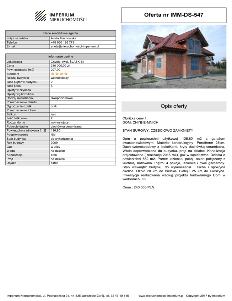 Oferta nr IMM-DS-547 Dane kontaktowe agenta Imię i nazwisko Telefon E-mail Aneta Machowska +48 660 126 771 [email protected] Informacje ogólne Lokalizacja Cena Pow. całkowita [m2] Standard Rodzaj budynku Ilość pięter w budynku Ilość pokoi Opłaty w czynszu Opłaty wg liczników Rodzaj mieszkania Przeznaczenie działki Ogrodzenie działki Przeznaczenie lokalu Balkon Ilość balkonów Rodzaj domu Pokrycie dachu Powierzchnia użytkowa [m2] Podpiwniczenie Stan budynku Rok budowy Gaz Woda Kanalizacja Prąd Dojazd Chybie, (woj. ŚLĄSKIE) 240 000,00 zł 207,90 wolnostojący 2 6 Dwupoziomowe Opis oferty brak jest 2 wolnostojący dachówka ceramiczna 136,80 Nie do wykończenia 2009 w ulicy na działce brak na działce asfalt Obniżka ceny ! DOM, CHYBIE-MNICH STAN SUROWY, CZĘŚCIOWO ZAMKNIĘTY Dom o powierzchni użytkowej 136,80 m2 z garażem dwustanowiskowym. Materiał konstrukcyjny- Porotherm 25cm. Dach czterospadowy z jaskółkami, kryty dachówką ceramiczną. Woda doprowadzona do budynku, prąd na działce. Kanalizacja projektowana ( realizacja 2016 rok), gaz w sąsiedztwie. Działka o powierzchni 852 m2. Parter: łazienka, pokój, salon połączony z kuchnią, kotłownia. Piętro: 4 pokoje, łazienka i dwie garderoby. Stan wewnątrz budynku do wykończenia . Cicha i spokojna okolica. Około 20 km do Bielska- Białej i 25 km do Cieszyna. Inwestycja realizowana według projektu budowlanego Dom w werbenach G2. Cena : 240 000 PLN. Imperium Nieruchomości, ul. Podhalańska 31, 44-335 Jastrzębie-Zdrój, tel. 32 47 10 115 www.nieruchomosci-imperium.pl Copyright 2017 by Imperium