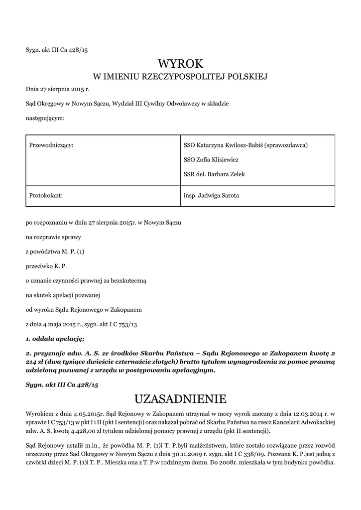 Sygn. akt III Ca 428/15 WYROK W IMIENIU RZECZYPOSPOLITEJ POLSKIEJ Dnia 27 sierpnia 2015 r. Sąd Okręgowy w Nowym Sączu, Wydział III Cywilny Odwoławczy w składzie następującym: Przewodniczący: SSO Katarzyna Kwilosz-Babiś (sprawozdawca) SSO Zofia Klisiewicz SSR del. Barbara Zelek Protokolant: insp. Jadwiga Sarota po rozpoznaniu w dniu 27 sierpnia 2015r. w Nowym Sączu na rozprawie sprawy z powództwa M. P. (1) przeciwko K. P. o uznanie czynności prawnej za bezskuteczną na skutek apelacji pozwanej od wyroku Sądu Rejonowego w Zakopanem z dnia 4 maja 2015 r., sygn. akt I C 753/13 1. oddala apelację; 2. przyznaje adw. A. S. ze środków Skarbu Państwa – Sądu Rejonowego w Zakopanem kwotę 2 214 zł (dwa tysiące dwieście czternaście złotych) brutto tytułem wynagrodzenia za pomoc prawną udzieloną pozwanej z urzędu w postępowaniu apelacyjnym. Sygn. akt III Ca 428/15 UZASADNIENIE Wyrokiem z dnia 4.05.2015r. Sąd Rejonowy w Zakopanem utrzymał w mocy wyrok zaoczny z dnia 12.03.2014 r. w sprawie I C 753/13 w pkt I i II (pkt I sentencji) oraz nakazał pobrać od Skarbu Państwa na rzecz Kancelarii Adwokackiej adw. A. S. kwotę 4.428,00 zł tytułem udzielonej pomocy prawnej z urzędu (pkt II sentencji). Sąd Rejonowy ustalił m.in., że powódka M. P. (1)i T. P.byli małżeństwem, które zostało rozwiązane przez rozwód orzeczony przez Sąd Okręgowy w Nowym Sączu z dnia 30.11.2009 r. sygn. akt I C 338/09. Pozwana K. P.jest jedną z czwórki dzieci M. P. (1)i T. P.. Mieszka ona z T. P.w rodzinnym domu. Do 2008r. mieszkała w tym budynku powódka. T. P.był właścicielem zabudowanej działki ewid. nr (...)obręb (...)w Z.objętej Kw nr (...), którą otrzymał w wyniku działu spadku po swoich rodzicach. Przed Sądem Rejonowym w Zakopanem toczyła się z wniosku M. P. (1)sprawa o podział majątku wspólnego pod sygn. I Ns 793/10, która zakończyła się zawarciem ugody między stronami w dniu 24.04.2012r. Na mocy tej ugody w pkt I M. P. (1)i T. P.zgodnie oświadczyli, że w skład ich majątku dorobkowego wchodzą nakłady na budynek mieszkalny usytuowany na działce (...)obręb (...)w Z.– objętej Kw nr (...), zlokalizowany przy ul. (...)o wartości 142.700,00 zł. W pkt II ugody T. P.zobowiązał się tytułem zwrotu połowy opisanych wyżej nakładów zapłacić M. P. (1)do dnia 25.08.2012r. kwotę 71.350 zł z ustawowymi odsetkami w razie zwłoki oraz kwotę 2.170 zł tytułem zwrotu kosztów postępowania. W ramach sprawy o podział majątku wspólnego sygn. I Ns 793/10 pozwana, która mieszkała wspólnie z ojcem, odebrała - podpisując własnoręcznie w dniu 19.10.2010r.- potwierdzenie odbioru korespondencji sądowej w tej sprawie oraz wypełniała T. P., który starał się o zwolnienie od kosztów sądowych - rubryki nr 2, 3, 4, 5, i 7 oświadczenia o stanie rodzinnym i majątkowym z dnia 26.10.2010r. Pozwana wypełniła też w całości oświadczenie o stanie rodzinnym i majątkowym z dnia 12.10.2011r. Pozwana sporządzała T. P.w ramach sprawy o podział majątku pismo z dnia 15.11.2011r. dotyczące rozłożenia na raty kwoty 1.500 zł z tytułu zaliczki na opinie biegłego rzeczoznawcy. Pozwana K. P.wiedziała o naoczni sądowej w przedmiotowym budynku, wiedziała o wystąpieniu przez M. P. (1)przeciwko T. P.z roszczeniem o spłatę z tytułu podziału majątku wspólnego i o zobowiązaniu T. P.wobec powódki wynikającym z treści ugody z dnia 24.04.2012r. Powódka rozmawiała z nią o tym, że chce, aby T. P.zwrócił jej cześć nakładów na dom. Z uwagi na niewywiązanie się przez T. P.z obowiązku nałożonego przedmiotową ugodą co do spłaty na rzecz M. P. (1)w/w wymagalnych kwot – z wniosku powódki z dnia 5.11.2012r. została przeciwko niemu skierowana egzekucja komornicza w sprawie o sygn. Km 1365/12. Komornik dokonał początkowo zajęcia jego świadczeń emerytalno – rentowych, jednak postanowieniem z dnia 29.01.2013r. organ egzekucyjny umorzył postępowanie egzekucyjne z uwagi na bezskuteczność egzekucji. T. P., mając świadomość konieczności spłaty byłej żony z połowy wartości nakładów poczynionych na jego osobisty majątek, aktem notarialnym z dnia 24.11.2010r., rep. A (...)w Kancelarii Notarialnej w N.przed notariuszem W. C.zawarł z pozwaną umowę dożywocia, na podstawie której nieruchomość położona w Z.w obrębie(...), a stanowiąca dz. ewid. nr (...) o pow. 0,0627 ha - objętą Kw nr (...)Sądu Rejonowego w Zakopanem przeszła na własność jego córki pozwanej K. P.. T. P.ustanowił również na swoją rzecz służebność mieszkania w tym budynku. Na skutek zawarcia umowy dożywocia z dnia 24.11.2010r., dłużnik T. P.stał się niewypłacalny. Pozwana opiekuje się T. P.i partycypuje w kosztach utrzymania domu. Wspólnie zamieszkując ze swoim ojcem i pozostając z nim w bliskich relacjach, wiedziała o działaniu T. P.z pokrzywdzeniem wierzyciela, jakim była jej matka M. P. (1). Po uzyskaniu informacji o zawarciu w/w umowy dożywocia M. P. (1)zerwała kontakty z córką K. P., uważając, że takie działanie krzywdzi nie tylko ją jako wierzyciela, ale i pozostałe jej dzieci. W tak ustalonym stanie faktycznym Sąd I instancji uznał, że pozwana zawierając przedmiotową umowę dożywocia ze swoim ojcem miała świadomość pokrzywdzenia M. P. (1). W wyniku tej umowy T. P.wyzbył się bowiem posiadanej nieruchomości, stanowiącej jego jedyny majątek, stając się w zasadzie niewypłacalny. Sąd I instancji stwierdził, że postępowanie dowodowe wykazało, iż celem wyzbycia się przez T. P.jedynego swojego majątku stanowiącego działkę ewid. nr (...) na rzecz K. P.było uniemożliwienie egzekucji, gdyż miał on świadomość, iż będzie musiał ją spłacić z potowy wartości nakładów, poczynionych na jego osobisty majątek. Znamienne jest w ocenie Sądu Rejonowego na gruncie niniejszej sprawy, iż wniosek o podział majątku dorobkowego został złożony w Sądzie w dniu 1.10.2010r., a prz