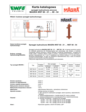 Karta katalogowa sprzęgło hydrauliczne pionowe MAGRA WST 60 - 21 … 80 - 54 Widok i budowa sprzęgła hydraulicznego: Nazwa handlowa sprzęgła hydraulicznego : Sprzęgło hydrauliczne MAGRA WST 60 - 21 … WST 80 - 54 Budowa sprzęgła hydraulicznego MAGRA: Sprzęgło hydrauliczne MAGRA WST 60 - 21 … WST 80 - 54 to typowa zwrotnica wodna do instalacji grzewczej lub klimatyzacyjnej typu pionowego, typ wiszący o budowie modułowej, komora wymiany z blachy stalowej o przekroju kwadratowym , przyłącza do źródła ciepła i instalacji odbioru ciepła w postaci przyspawanych króćców mufowych z gwintem wewnętrznym od 1” do 2”; dodatkowo trzy króćce mufowe ½” od dołu króciec spustowo-odszlamiający, od góry do wkręcenia odpowietrznika oraz z boku na kieszeń czujnika lub termometru czynnika zasilania. Fabrycznie zagruntowane oraz sprawdzone pod ciśnieniem. Typ sprzęgła MAGRA : Typ Przepływ czynnika WST 60-21 Atest : Przyłącza mufa Wymiar komory Grubość izolacji 21,0 kW 1” 25 mm 115 kW 34,5 kW 1 ¼” 60 x 60 mm 7,0 m³/h 160 kW 48,0 kW 1 ½“ 35 mm 9,0 m³/h 210 kW 63,0 kW 2“ 80 x 80 mm w chłodzie ΔT 6 K 3,0 m³/h 70 kW WST 60-34 5,0 m³/h WST 80-34 WST 80-54 Króciec spustowy : Króciec na odpowietrznik : Króciec czujnika temperatury : Maksymalne ciśnienie robocze : Maksymalna temperatura robocza : Wykonanie : Sposób montażu : Osprzęt : Moc sprzęgła grzewcza ΔT 20K mufa ½“ mufa ½“ mufa ½“ 6 bar 110°C zagruntowany fabrycznie, sprawdzony ciśnieniowo montaż pionowy na ścianie ● SET osprzęt do zazbrojenia sprzęgła; zawór spustowy, odpowietrznik, zaślepka ● izolacja prefabrykowana z twardej pianki PU czarna, grubość ● izolacja prefabrykowana z twardej pianki PU w osłonie aluminiowej ● uchwyty montażowe – wysięg od osi sprzęgła Typ 60 – 110 / 100 : wysięg 100 mm od osi sprzęgła Typ 60 – 110 / 150 : wysięg 150 mm od osi sprzęgła Typ 80 – 160 / 130 : wysięg 125 mm od osi sprzęgła Wykonanie zgodnie z DGVO 97/23/EG „GIP“ Wymiary sprzęgła hydraulicznego MAGRA WST 60 … 80 Funkcjonowanie sprzęgła hydraulicznego dla obiegów grzewczych ( po lewej ) i układów wody lodowej ( po prawej ) Osprzęt do sprzęgieł hydraulicznych MAGRA WST 60 … 80 Izolacja prefabrykowana czarna z twardej pianki PU Izolacja prefabrykowana ALU z twardej pianki PU SET - Osprzęt do zazbrojenia WST Uchwyty naścienny Wersja V2_1405 EWFE-Polonia Sp. z o.o. • Homera 55 • 80-299 Gdańsk • Tel: +58 524 12 10 • Fax: +58 342 12 62 E-Mail: [email protected] • Internet: www.ewfe.com.pl