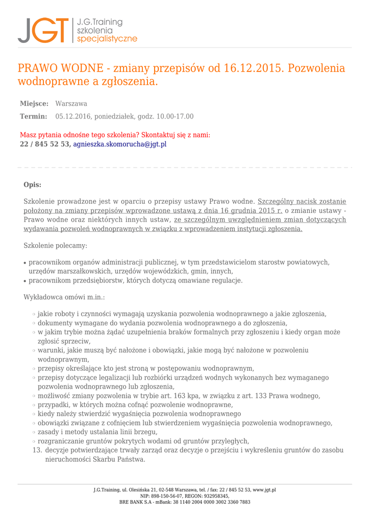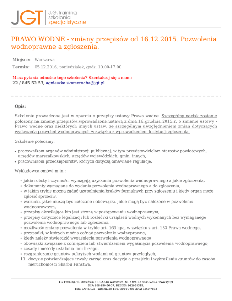 PRAWO WODNE - zmiany przepisów od 16.12.2015. Pozwolenia wodnoprawne a zgłoszenia. Miejsce: Warszawa Termin: 05.12.2016, poniedziałek, godz. 10.00-17.00 Masz pytania odnośne tego szkolenia? Skontaktuj się z nami: 22 / 845 52 53, [email protected] Opis: Szkolenie prowadzone jest w oparciu o przepisy ustawy Prawo wodne. Szczególny nacisk zostanie położony na zmiany przepisów wprowadzone ustawą z dnia 16 grudnia 2015 r. o zmianie ustawy Prawo wodne oraz niektórych innych ustaw, ze szczególnym uwzględnieniem zmian dotyczących wydawania pozwoleń wodnoprawnych w związku z wprowadzeniem instytucji zgłoszenia. Szkolenie polecamy: ● ● pracownikom organów administracji publicznej, w tym przedstawicielom starostw powiatowych, urzędów marszałkowskich, urzędów wojewódzkich, gmin, innych, pracownikom przedsiębiorstw, których dotyczą omawiane regulacje. Wykładowca omówi m.in.: jakie roboty i czynności wymagają uzyskania pozwolenia wodnoprawnego a jakie zgłoszenia, dokumenty wymagane do wydania pozwolenia wodnoprawnego a do zgłoszenia, w jakim trybie można żądać uzupełnienia braków formalnych przy zgłoszeniu i kiedy organ może zgłosić sprzeciw, warunki, jakie muszą być nałożone i obowiązki, jakie mogą być nałożone w pozwoleniu wodnoprawnym, przepisy określające kto jest stroną w postępowaniu wodnoprawnym, przepisy dotyczące legalizacji lub rozbiórki urządzeń wodnych wykonanych bez wymaganego pozwolenia wodnoprawnego lub zgłoszenia, możliwość zmiany pozwolenia w trybie art. 163 kpa, w związku z art. 133 Prawa wodnego, przypadki, w których można cofnąć pozwolenie wodnoprawne, kiedy należy stwierdzić wygaśnięcia pozwolenia wodnoprawnego obowiązki związane z cofnięciem lub stwierdzeniem wygaśnięcia pozwolenia wodnoprawnego, zasady i metody ustalania linii brzegu, rozgraniczanie gruntów pokrytych wodami od gruntów przyległych, 13. decyzje potwierdzające trwały zarząd oraz decyzje o przejściu i wykreśleniu gruntów do zasobu nieruchomości Skarbu Państwa. ❍ ❍ ❍ ❍ ❍ ❍ ❍ ❍ ❍ ❍ ❍ ❍ J.G.Training, ul. Olesińska 21, 02-548 Warszawa, tel. / fax: 22 / 845 52 53, www.jgt.pl NIP: 898-150-56-07, REGON: 932958345, BRE BANK S.A - mBank: 38 1140 2004 0000 3002 3360 7883 Program: 1. Podstawowe zasady Prawa wodnego: ❍ ❍ ❍ ❍ podział wód, podstawowe definicje ustawy, inne roboty, do których stosuje się przepisy o urządzeniach wodnych, różnice w pojęciu „gruntu pokrytego wodami powierzchniowymi” wg Prawa wodnego, a „gruntu pod wodą” wg ewidencji gruntów. 2. Podstawowe informacje dotyczące wydawania pozwoleń wodnoprawnych: ❍ ❍ ❍ ❍ ❍ ❍ ❍ jakie roboty i czynności wymagają uzyskania pozwolenia wodnoprawnego, dokumenty niezbędne do wydania pozwolenia wodnoprawnego: operat wodnoprawny, decyzja o lokalizacji inwestycji (o warunkach zabudowy), decyzja środowiskowa, postanowienie uzgadniające warunki realizacji przedsięwzięcia na obszarze Natura 2000, zgłoszenie lub decyzja o warunkach prowadzenia działań na obszarach chronionych, warunki, jakie muszą być nałożone w pozwoleniu wodnoprawnym, obowiązki jakie mogą być nałożone w pozwoleniu wodnoprawnym, strony w postępowaniu wodnoprawnym, możliwość i warunki zmiany pozwolenia, zmiana pozwolenia w trybie art. 163 kpa, w związku z art. 133 Prawa wodnego, przypadki, w których można cofnąć pozwolenie wodnoprawne, stwierdzanie wygaśnięcia pozwolenia wodnoprawnego obowiązki związane z cofnięciem lub stwierdzeniem wygaśnięcia pozwolenia wodnoprawnego. 3. Podstawowe informacje dotyczące zgłoszenia zamiaru wykonania czynności: ❍ ❍ ❍ ❍ jakie roboty i czynności wymagają zgłoszenia właściwemu organowi, dokumenty niezbędne do zgłoszenia: opis i cel planowanych czynności, szkice lub rysunki, postanowienie nakładające obowiązek uzupełnienia braków formalnych oraz brakujących dokumentów i informacji, warunki umożliwiające organowi wniesienie sprzeciwu. 4. Organy właściwe do wydawania pozwoleń wodnoprawnych i do przyjmowania zgłoszeń. 5. Przepisy przejściowe ustawy z dnia 16 grudnia 2015 r. 6. Zasady i metody ustalania linii brzegu. 7. Rozgraniczanie gruntów pokrytych wodami od gruntów przyległych. 8. Decyzje potwierdzające trwały zarząd oraz decyzje o przejściu i wykreśleniu gruntów do zasobu J.G.Training, ul. Olesińska 21, 02-548 Warszawa, tel. / fax: 22 / 845 52 53, www.jgt.pl NIP: 898-150-56-07, REGON: 932958345, BRE BANK S.A - mBank: 38 1140 2004 0000 3002 3360 7883 nieruchomości Skarbu Państwa. 9. Dyskusja, przykłady, pytania. Wykładowca: Pracownik Krajowego Zarządu Gospodarki Wodnej. Specjalistka w zakresie orzecznictwa administracyjnego w dziedzinie gospodarki wodnej. Współautorka Prawa wodnego i przepisów wykonawczych, jak również interpretacji tej ustawy. Autorka artykułów z dziedziny gospodarki wodnej i Prawa Wodnego, prowadzi zajęcia z Prawa wodnego dla studentów Wydziału Inżynierii Środowiska Politechniki Warszawskiej oraz na szkoleniach dla pracowników administracji z zakresu Prawa wodnego. Miejsce: Miejsce szkolenia zlokalizowane w centrum Warszawy, czas dojazdu tramwajem z Dworca Centralnego - około 5 minut. Na 4 dni robocze przed planowanym terminem szkolenia skontaktujemy się z Państwem i przekażemy szczegółowe informacje na temat lokalizacji szkolenia. Hotele w pobliżu miejsca szkolenia: Hotel Campanile, ul. Towarowa 2, Warszawa Cena noclegu zależy od terminu i wolnych miejsc w Hotelu. Koszt od 279 zł (jedynka ze śniadaniem), tel. 22 582 72 00, http://www.campanile-warszawa.pl/pl Hotel Golden Tulip, ul. Towarowa 2, Warszawa Cena noclegu zależy od terminu i wolnych miejsc w Hotelu. Koszt od 315 zł (jedynka ze śniadaniem), tel. 22 582 75 00, http://www.goldentulipwarsawcentre.com/pl Hotel Premiere Classe, ul. Towarowa 2, Warszawa Cena noclegu zależy od terminu i wolnych miejsc w Hotelu. Koszt od 177 zł (jedynka ze śniadanie
