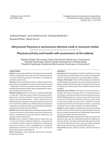 Knapik, Rottermund, Myśliwiec, Plinta, Gruca Aktywność fizyczna a samoocena zdrowia osób w starszym wieku © Wydawnictwo UR 2010 ISSN 2082-369X 195 Przegląd Medyczny Uniwersytetu Rzeszowskiego i Narodowego Instytutu Leków w Warszawie Rzeszów 2011, 2, 195–204 Andrzej Knapik1, Jerzy Rottermund2, Andrzej Myśliwiec3, Ryszard Plinta1, Maria Gruca3 Aktywność fizyczna a samoocena zdrowia osób w starszym wieku Physical activity and health self-assessment of the elderly Wydział Opieki Zdrowotnej, Śląski Uniwersytet Medyczny w Katowicach 2 Wydział Fizjoterapii, Wyższa Szkoła Administracji w Bielsku Białej 3 Wydział Fizjoterapii, Akademia Wychowania Fizycznego w Katowicach 1 STRESZCZENIE Wstęp: Prognozy demograficzne wskazują na wzrost odsetka ludności w podeszłym wieku. Niesie to za sobą konsekwencje w postaci badań dotyczących czynników warunkujących pomyślne starzenie się. Cel pracy: Celem pracy było określenie, w jakim stopniu wiek, płeć, poziom wykształcenia i poziom aktywności fizycznej – wpływają na samoocenę zdrowia osób w starszym wieku. Ponadto postanowiono zbadać, jakie współzależności zachodzą pomiędzy tymi zmiennymi. Materiał i metody: Zbadano 129 osób: 71 kobiet, 58 mężczyzn w wieku 60–79 lat, przy użyciu technik socjometrycznych. Aktywność ruchową określono za pomocą International Physical Activity Questionnaire – IPAQ w wersji skróconej (IPAQshortpast), natomiast samoocenę zdrowia za pomocą SF-36: Short Form Health Survey. Analiza statystyczna obejmowała wykonanie statystyk opisowych, obliczenia wskaźników korelacji oraz analizy wariancji ANOVA. Wyniki: Odnotowano słabą, ujemną korelację między wiekiem i samooceną zdrowia oraz wiekiem i poziomem aktywności. Poziom wykształcenia różnicuje zarówno aktywność, jak i poziom samooceny zdrowia. Wnioski: Wraz z wiekiem maleje zarówno aktywność, jak i samoocena zdrowia. Między kobietami a mężczyznami nie znaleziono różnic istotnych statystycznie, dotyczących samooceny zdrowia. Silnym modyfikatorem, korzystnie wpływającym zarówno na aktywność, jak i samoocenę zdrowia jest poziom wykształcenia. Słowa kluczowe: wiek podeszły, aktywność ruchowa, samoocena zdrowia ABSTRACT Introduction: Demographic projections indicate an increase in the proportion of the elderly in the society. Consequently, research on factors leading to successful aging is needed. Purpose of the study: The aim of the study was to determine to what degree age, gender, education and physical activity influence health self-assessment in the elderly. Furthermore, an attempt was made to assess the correlation between these variables. Materials and methods: 129 subjects were examined: 71 females, 58 males in the age of 60–79, using sociometric techniques. International Physical Activity Questionnaire or IPAQ (IPAQshortpast) was used to measure physical activity, whereas SF-36 (Short Form Health Survey) was used in order to determine health self-assessment. Statistical analysis involved performing the descriptive statistics, calculating correlation ratio as well as analysis of variation (ANOVA). Results: A weak, negative correlation between age and health self-assessment as well as between age and physical activity level was noted. Educational level differentiates both physical activity and health self-assessment level. Conclusions: Both physical activity and health self-assessment decrease with age. No statistically significant differences between females and males regarding health self-assessment were found. Educational level is a strong modifier, positively influencing both activity and health self-assessment. Key words: old age, physical activity, self-assessment of health
