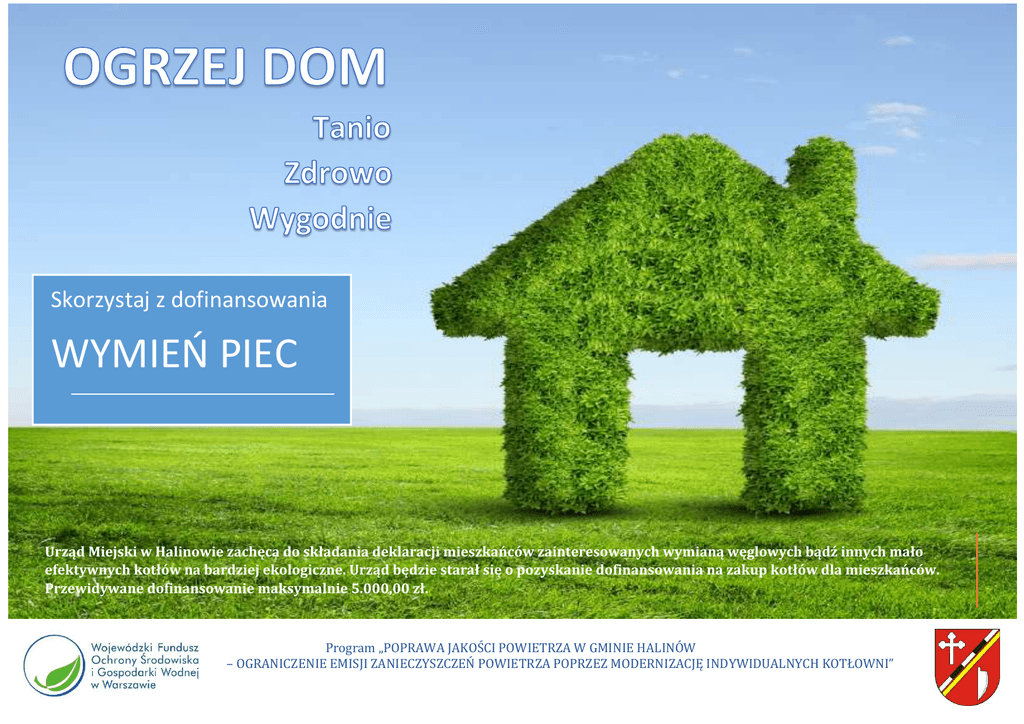 Skorzystaj z dofinansowania WYMIEŃ PIEC Urząd Miejski w Halinowie zachęca do składania deklaracji mieszkańców zainteresowanych wymianą węglowych bądź innych mało efektywnych kotłów na bardziej ekologiczne. Urząd będzie starał się o pozyskanie dofinansowania na zakup kotłów dla mieszkańców. Przewidywane dofinansowanie maksymalnie 5.000,00 zł. Program „POPRAWA JAKOŚCI POWIETRZA W GMINIE HALINÓW – OGRANICZENIE EMISJI ZANIECZYSZCZEŃ POWIETRZA POPRZEZ MODERNIZACJĘ INDYWIDUALNYCH KOTŁOWNI”
