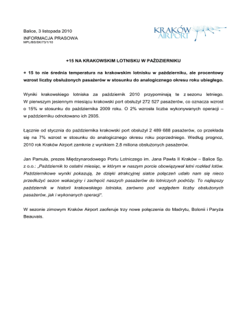 Balice, 3 listopada 2010 INFORMACJA PRASOWA MPL/BS/SK/73/1/10 +15 NA KRAKOWSKIM LOTNISKU W PAŹDZIERNIKU + 15 to nie średnia temperatura na krakowskim lotnisku w październiku, ale procentowy wzrost liczby obsłużonych pasażerów w stosunku do analogicznego okresu roku ubiegłego. Wyniki krakowskiego lotniska za październik 2010 przypominają te z sezonu letniego. W pierwszym jesiennym miesiącu krakowski port obsłużył 272 527 pasażerów, co oznacza wzrost o 15% w stosunku do października 2009 roku. O 2% wzrosła liczba wykonywanych operacji – w październiku odnotowano ich 2935. Łącznie od stycznia do października krakowski port obsłużył 2 489 688 pasażerów, co przekłada się na 7% wzrost w stosunku do analogicznego okresu roku poprzedniego. Według prognoz, 2010 rok Kraków Airport zamknie z wynikiem 2,8 miliona obsłużonych pasażerów. Jan Pamuła, prezes Międzynarodowego Portu Lotniczego im. Jana Pawła II Kraków – Balice Sp. z o.o.: „Październik to ostatni miesiąc, w którym w naszym porcie obowiązywał letni rozkład lotów. Październikowe wyniki pokazują, że dzięki atrakcyjnej siatce połączeń udało nam się nieco przedłużyć sezon wakacyjny i zachęcić naszych pasażerów do lotniczych podróży. To najlepszy październik w historii krakowskiego lotniska, zarówno pod względem liczby obsłużonych pasażerów, jak i wykonanych operacji“. W sezonie zimowym Kraków Airport zaoferuje trzy nowe połączenia do Madrytu, Bolonii i Paryża Beauvais.