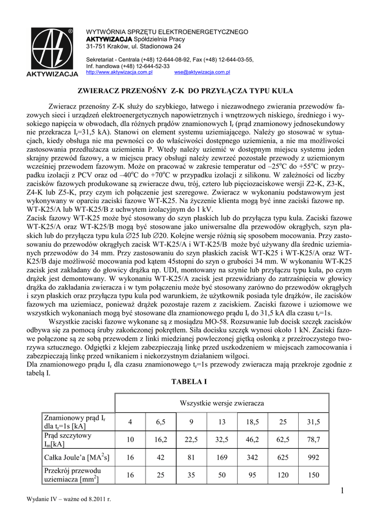 WYTWÓRNIA SPRZĘTU ELEKTROENERGETYCZNEGO AKTYWIZACJA Spółdzielnia Pracy 31-751 Kraków, ul. Stadionowa 24 Sekretariat - Centrala (+48) 12-644-08-92, Fax (+48) 12-644-03-55, Inf. handlowa (+48) 12-644-52-33 http://www.aktywizacja.com.pl [email protected] ZWIERACZ PRZENOŚNY Z-K DO PRZYŁĄCZA TYPU KULA Zwieracz przenośny Z-K służy do szybkiego, łatwego i niezawodnego zwierania przewodów fazowych sieci i urządzeń elektroenergetycznych napowietrznych i wnętrzowych niskiego, średniego i wysokiego napięcia w obwodach, dla różnych prądów znamionowych Ir (prąd znamionowy jednosekundowy nie przekracza Ir=31,5 kA). Stanowi on element systemu uziemiającego. Należy go stosować w sytuacjach, kiedy obsługa nie ma pewności co do właściwości dostępnego uziemienia, a nie ma możliwości zastosowania przedłużacza uziemienia P. Wtedy należy uziemić w dostępnym miejscu systemu jeden skrajny przewód fazowy, a w miejscu pracy obsługi należy zewrzeć pozostałe przewody z uziemionym wcześniej przewodem fazowym. Może on pracować w zakresie temperatur od –25oC do +55oC w przypadku izolacji z PCV oraz od –40oC do +70oC w przypadku izolacji z silikonu. W zależności od liczby zacisków fazowych produkowane są zwieracze dwu, trój, cztero lub pięciozaciskowe wersji Z2-K, Z3-K, Z4-K lub Z5-K, przy czym ich połączenie jest szeregowe. Zwieracz w wykonaniu podstawowym jest wykonywany w oparciu zaciski fazowe WT-K25. Na życzenie klienta mogą być inne zaciski fazowe np. WT-K25/A lub WT-K25/B z uchwytem izolacyjnym do 1 kV. Zacisk fazowy WT-K25 może być stosowany do szyn płaskich lub do przyłącza typu kula. Zaciski fazowe WT-K25/A oraz WT-K25/B mogą być stosowane jako uniwersalne dla przewodów okrągłych, szyn płaskich lub do przyłącza typu kula ∅25 lub ∅20. Kolejne wersje różnią się sposobem mocowania. Przy zastosowaniu do przewodów okrągłych zacisk WT-K25/A i WT-K25/B może być używany dla średnic uziemianych przewodów do 34 mm. Przy zastosowaniu do szyn płaskich zacisk WT-K25 i WT-K25/A oraz WTK25/B daje możliwość mocowania pod kątem 45stopni do szyn o grubości 34 mm. W wykonaniu WT-K25 zacisk jest zakładany do głowicy drążka np. UDI, montowany na szynie lub przyłączu typu kula, po czym drążek jest demontowany. W wykonaniu WT-K25/A zacisk jest przewidziany do zatrzaśnięcia w głowicy drążka do zakładania zwieracza i w tym połączeniu może być stosowany zarówno do przewodów okrągłych i szyn płaskich oraz przyłącza typu kula pod warunkiem, że użytkownik posiada tyle drążków, ile zacisków fazowych ma uziemiacz, ponieważ drążek pozostaje razem z zaciskiem. Zaciski fazowe i uziomowe we wszystkich wykonaniach mogą być stosowane dla znamionowego prądu Ir do 31,5 kA dla czasu tr=1s. Wszystkie zaciski fazowe wykonane są z mosiądzu MO-58. Rozsuwanie lub docisk szczęk zacisków odbywa się za pomocą śruby zakończonej pokrętłem. Siła docisku szczęk wynosi około 1 kN. Zaciski fazowe połączone są ze sobą przewodem z linki miedzianej powleczonej giętką osłonką z przeźroczystego tworzywa sztucznego. Odgiętki z klejem zabezpieczają linkę przed uszkodzeniem w miejscach zamocowania i zabezpieczają linkę przed wnikaniem i niekorzystnym działaniem wilgoci. Dla znamionowego prądu Ir dla czasu znamionowego tr=1s przewody zwieracza mają przekroje zgodnie z tabelą I. TABELA I Wszystkie wersje zwieracza Znamionowy prąd Ir dla tr=1s [kA] Prąd szczytowy Im[kA] 4 6,5 9 13 18,5 25 31,5 10 16,2 22,5 32,5 46,2 62,5 78,7 Całka Joule’a [MA2s] 16 42 81 169 342 625 992 Przekrój przewodu uziemiacza [mm2] 16 25 35 50 95 120 150 1 Wydanie IV – ważne od 8.2011 r. Sposób doboru w/w zwieracza dla pozostałych wyszczególnionych w normie PN-EN 61230:2011 wartości czasu znamionowego tr i odpowiadających im prądów znamionowych Ir obrazuje wykres I. WYKRES I Dopuszczalny prąd zwarcia Ir w funkcji czasu zwarcia tr dla różnych przekrojów przewodów zwieraczy UWAGA: W zakresie czasów: tr :1s ÷ 3s – prąd przeliczeniowy gwarantowany 0,1s ÷ 1s– prąd przeliczeniowy po sprawdzeniu wytrzymałości elektrodynamicznej zwieracza (wykonanie specjalne) Zwieracz posiada standardowe długości przewodów podane poniżej. L1= 1, 2, 3, 4, 5, 8 [m]. Na życzenie zamawiającego mogą być wykonywane zwieracze, w których długość przewodów zwierających L1 jest większa lub równa 0,3 m z gradacją co 0,1 m, a całkowita długość zwieracza (X-1)L1 nie przekracza 24 m. Opakowanie jednostkowe uziemiacza stanowi torba wykonana z tkaniny powlekanej wodoodpornej. 2 Wydanie IV – ważne od 8.2011 r. SPOSÓB OZNACZANIA WERSJI ZWIERACZA Z-K ZX-K-A-L1-I/t-S-(B) gdzie: X - ilość zacisków fazowych (od 2 do 5) A - oznaczenie zacisku fazowego: WT-K25 -zacisk fazowy na szyny płaskie i przyłącze typu kula - do 31,5 kA/1s WT-K25/A -zacisk fazowy na przewody okrągłe, szyny płaskie i przyłącze typu kula - do 31,5 kA/1s WT-K25/B -zacisk fazowy na przewody okrągłe, szyny płaskie i przyłącze typu kula - do 31,5 kA/1s L1 - długość przewodu zwierającego (od 0,3 m z gradacją co 0,1 m) UWAGA: Długość całkowita zwieracza w wykonaniu szeregowym nie może przekraczać 24m I - Ir znamionowy prąd zwarcia dla czasu zwarcia tr [kA] t - tr znamionowy czas zwarcia [s] S - przekrój przewodów zwieracza wynikający ze znamionowego prądu i czasu zwarcia [mm2] B - sposób połączenia przewodów zwieracza wielozaciskowego: - S zwieracz w wykonaniu szeregowym Przykłady oznaczenia: 1. Zwieracz przenośny pięciozaciskowy na szyny płaskie i przyłącze typu kula (zacisk WT-K25) z przewodami zwierającymi o długości L1= 1 m i prądzie znamionowym Ir=6,5 kA/1s, wykonanymi z linki miedzianej o przekroju 25 mm2 w wykonaniu szeregowym: Z5-K-WT-K25-1-6,5/1-25-(S) 2. Zwieracz przenośny czterozaciskowy na przewody okrągłe, na szyny płaskie i przyłącze typu kula (zacisk WT-K25/A) z przewodami zwierającymi o długośc