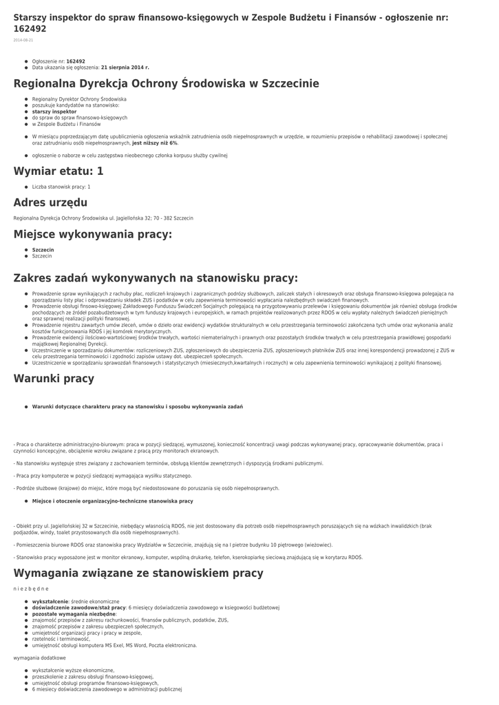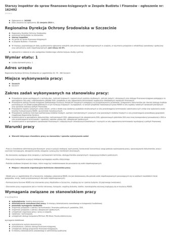 Starszy inspektor do spraw finansowo-księgowych w Zespole Budżetu i Finansów - ogłoszenie nr: 162492 2014-08-21 Ogłoszenie nr: 162492 Data ukazania się ogłoszenia: 21 sierpnia 2014 r. Regionalna Dyrekcja Ochrony Środowiska w Szczecinie Regionalny Dyrektor Ochrony Środowiska poszukuje kandydatów na stanowisko: starszy inspektor do spraw do spraw finansowo-księgowych w Zespole Budżetu i Finansów W miesiącu poprzedzającym datę upublicznienia ogłoszenia wskaźnik zatrudnienia osób niepełnosprawnych w urzędzie, w rozumieniu przepisów o rehabilitacji zawodowej i społecznej oraz zatrudnianiu osób niepełnosprawnych, jest niższy niż 6%. ogłoszenie o naborze w celu zastępstwa nieobecnego członka korpusu służby cywilnej Wymiar etatu: 1 Liczba stanowisk pracy: 1 Adres urzędu Regionalna Dyrekcja Ochrony Środowiska ul. Jagiellońska 32; 70 - 382 Szczecin Miejsce wykonywania pracy: Szczecin Szczecin Zakres zadań wykonywanych na stanowisku pracy: Prowadzenie spraw wynikających z rachuby płac, rozliczeń krajowych i zagranicznych podrózy służbowych, zaliczek stałych i okresowych oraz obsługa finansowo-księgowa polegająca na sporządzaniu listy płac i odprowadzaniu składek ZUS i podatków w celu zapewnienia terminowości wypłacania nalezbędnych swiadczeń finanowych. Prowadzenie obsługi finsowo-księgowej Zakładowego Funduszu Świadczeń Socjalnych polegajacą na przygotowywaniu przelewów i księgowaniu dokumentów jak również obsługa środków pochodzących ze źródeł pozabudżetowych w tym funduszy krajowych i europejskich, w ramach projektów realizowanych przez RDOŚ w celu wypłaty należnych świadczeń pieniężnych oraz sprawnej realizacji polityki finansowej. Prowadzenie rejestru zawartych umów zleceń, umów o dzieło oraz ewidencji wydatków strukturalnych w celu przestrzegania terminowości zakończena tych umów oraz wykonania analiz kosztów funkcjonowania RDOŚ i jej komórek merytorycznych. Prowadzenie ewidencji ilościowo-wartościowej środków trwałych, wartości niematerialnych i prawnych oraz pozostałych środków trwałych w celu przestrzegania prawidłowej gospodarki majątkowej Regionalnej Dyrekcji. Uczestniczenie w sporzadzaniu dokumentów: rozliczeniowych ZUS, zgłoszeniowych do ubezpieczenia ZUS, zgłoszeniowych płatników ZUS oraz innej korespondencji prowadzonej z ZUS w celu przestrzegania terminowości i zgodności zapisów ustawy dot. ubezpieczeń społecznych. Uczestniczenie w sporządzaniu sprawozdań finansowych i statystycznych (miesiecznych,kwartalnych i rocznych) w celu zapewnienia terminowości wynikajacej z polityki finansowej. Warunki pracy Warunki dotyczące charakteru pracy na stanowisku i sposobu wykonywania zadań - Praca o charakterze administracyjno-biurowym: praca w pozycji siedzącej, wymuszonej, konieczność koncentracji uwagi podczas wykonywanej pracy, opracowywanie dokumentów, praca i czynności koncepcyjne, obciążenie wzroku związane z pracą przy monitorach ekranowych. - Na stanowisku występuje stres związany z zachowaniem terminów, obsługą klientów zewnętrznych i dyspozycją środkami publicznymi. - Praca przy komputerze w pozycji siedzącej wymagająca wysiłku statycznego. - Podróże służbowe (krajowe) do miejsc, które mogą być niedostosowane do poruszania się osób niepełnosprawnych. Miejsce i otoczenie organizacyjno-techniczne stanowiska pracy - Obiekt przy ul. Jagiellońskiej 32 w Szczecinie, niebędący własnością RDOŚ, nie jest dostosowany dla potrzeb osób niepełnosprawnych poruszających się na wózkach inwalidzkich (brak podjazdów, windy, toalet przystosowanych dla osób niepełnosprawnych). - Pomieszczenia biurowe RDOŚ oraz stanowiska pracy Wydziałów w Szczecinie, znajdują się na I pietrze budynku 10 piętrowego (wieżowiec). - Stanowisko pracy wyposażone jest w monitor ekranowy, komputer, wspólną drukarkę, telefon, kserokopiarkę sieciową znajdującą się w korytarzu RDOŚ. Wymagania związane ze stanowiskiem pracy niezbędne wykształcenie: średnie ekonomiczne doświadczenie zawodowe/staż pracy: 6 miesięcy doświadczenia zawodowego w ksiegowości budżetowej pozostałe wymagania niezbędne: znajomość przepisów z zakresu rachunkowości, finansów publicznych, podatków, ZUS, znajomość przepisów z zakresu ubezpieczeń społecznych, umiejetność organizacji pracy i pracy w zespole, rzetelnośc i terminowość, umiejętność obsługi komputera MS Exel, MS Word, Poczta elektroniczna. wymagania dodatkowe wykształcenie wyższe ekonomiczne, przeszkolenie z zakresu obsługi finansowo-księgowej, umiejętność obsługi programów finansowo-księgowych, 6 miesiecy doświadczenia zawodowego w administracji publicznej Wymagane dokumenty i oświadczenia: życiorys i list motywacyjny oświadczenie kandydata o wyrażeniu zgody na przetwarzanie danych osobowych do celów rekrutacji oświadczenie kandydata o korzystaniu z pełni praw publicznych oświadczenie kandydata o nieskazaniu prawomocnym wyrokiem za umyślne przestępstwo lub umyślne przestępstwo skarbowe kopie dokumentów potwierdzających wykształcenie kopia dokumentu potwierdzającego posiadanie polskiego obywatelstwa lub oświadczenie o posiadaniu obywatelstwa polskiego kopie dokumentów potwierdzających 6 miesieczne doświadczenie zawodowe w obszarze ksiegowości budzetowej oraz 6 miesięczne doświadczenie zawodowe w administracji publicznej (świadectwa pracy, zaświadczenia, umowy cywillnoprawne, zakresy obowiązków i inne, z których jednoznacznie wynika okres wykonywania czynności w wymienionych obszarach). Inne dokumenty i oświadczenia: kopia dokumentu potwierdzającego niepełnosprawność - w przypadku kandydatów, którzy zamierzają skorzystać z pierwszeństwa w zatrudnieniu w przypadku, gdy znajdą się w gronie najlepszych kandydatów Termin składania dokumentów: 31-08-2014 Miejsce składania dokumentów: Regionalna Dyrekcja Ochrony Środowiska Jagiellońska 32 70-3