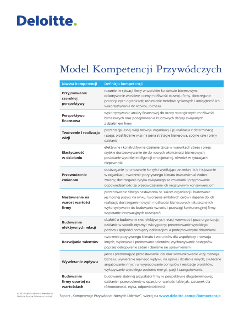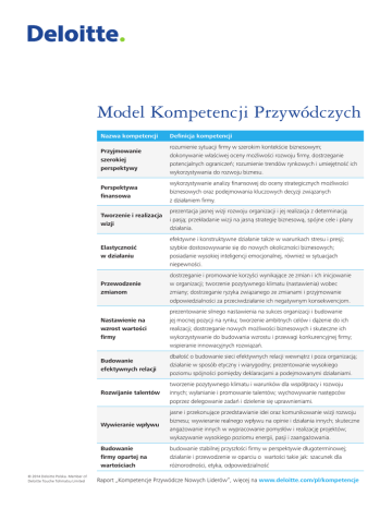 Model Kompetencji Przywódczych © 2014 Deloitte Polska. Member of Deloitte Touche Tohmatsu Limited Nazwa kompetencji Definicja kompetencji Przyjmowanie szerokiej perspektywy rozumienie sytuacji firmy w szerokim kontekście biznesowym; dokonywanie właściwej oceny możliwości rozwoju firmy, dostrzeganie potencjalnych ograniczeń; rozumienie trendów rynkowych i umiejętność ich wykorzystywania do rozwoju biznesu. Perspektywa finansowa wykorzystywanie analizy finansowej do oceny strategicznych możliwości biznesowych oraz podejmowania kluczowych decyzji związanych z działaniem firmy. Tworzenie i realizacja wizji prezentacja jasnej wizji rozwoju organizacji i jej realizacja z determinacją i pasją; przekładanie wizji na jasną strategię biznesową, spójne cele i plany działania. Elastyczność w działaniu efektywne i konstruktywne działanie także w warunkach stresu i presji; szybkie dostosowywanie się do nowych okoliczności biznesowych; posiadanie wysokiej inteligencji emocjonalnej, również w sytuacjach niepewności. Przewodzenie zmianom dostrzeganie i promowanie korzyści wynikające ze zmian i ich inicjowanie w organizacji; tworzenie pozytywnego klimatu (nastawienia) wobec zmiany; dostrzeganie ryzyka związanego ze zmianami i przyjmowanie odpowiedzialności za przeciwdziałanie ich negatywnym konsekwencjom. Nastawienie na wzrost wartości firmy prezentowanie silnego nastawienia na sukces organizacji i budowanie jej mocnej pozycji na rynku; tworzenie ambitnych celów i dążenie do ich realizacji; dostrzeganie nowych możliwości biznesowych i skuteczne ich wykorzystywanie do budowania wzrostu i przewagi konkurencyjnej firmy; wspieranie innowacyjnych rozwiązań. Budowanie efektywnych relacji dbałość o budowanie sieci efektywnych relacji wewnątrz i poza organizacją; działanie w sposób etyczny i wiarygodny; prezentowanie wysokiego poziomu spójności pomiędzy deklaracjami a podejmowanymi działaniami. Rozwijanie talentów tworzenie pozytywnego klimatu i warunków dla współpracy i rozwoju innych; wyłanianie i promowanie talentów; wychowywanie następców poprzez delegowanie zadań i dzielenie się uprawnieniami. Wywieranie wpływu jasne i przekonujące przedstawianie idei oraz komunikowanie wizji rozwoju biznesu; wywieranie realnego wpływu na opinie i działania innych; skuteczne angażowanie innych w wypracowanie pomysłów i realizację projektów; wykazywanie wysokiego poziomu energii, pasji i zaangażowania. Budowanie firmy opartej na wartościach budowanie stabilnej przyszłości firmy w perspektywie długoterminowej; działanie i przewodzenie w oparciu o wartości takie jak: szacunek dla różnorodności, etyka, odpowiedzialność Raport „Kompetencje Przywódcze Nowych Liderów”, więcej na www.deloitte.com/pl/kompetencje