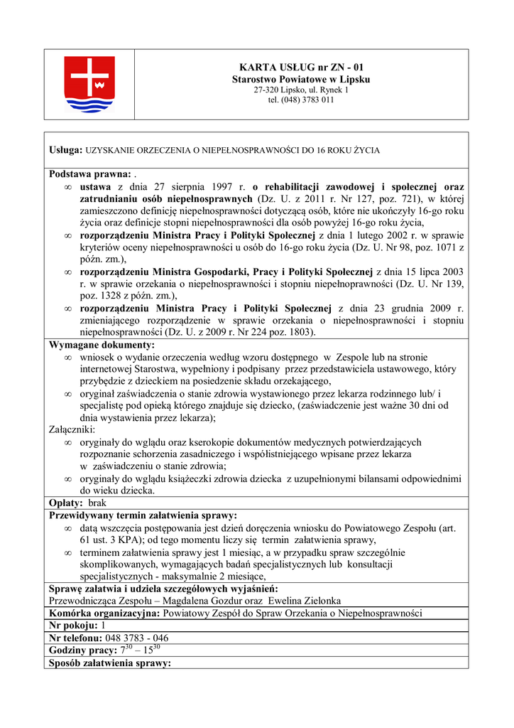 KARTA USŁUG nr ZN - 01 Starostwo Powiatowe w Lipsku 27-320 Lipsko, ul. Rynek 1 tel. (048) 3783 011 Usługa: UZYSKANIE ORZECZENIA O NIEPEŁNOSPRAWNOŚCI DO 16 ROKU ŻYCIA Podstawa prawna: . • ustawa z dnia 27 sierpnia 1997 r. o rehabilitacji zawodowej i społecznej oraz zatrudnianiu osób niepełnosprawnych (Dz. U. z 2011 r. Nr 127, poz. 721), w której zamieszczono definicję niepełnosprawności dotyczącą osób, które nie ukończyły 16-go roku życia oraz definicje stopni niepełnosprawności dla osób powyżej 16-go roku życia, • rozporządzeniu Ministra Pracy i Polityki Społecznej z dnia 1 lutego 2002 r. w sprawie kryteriów oceny niepełnosprawności u osób do 16-go roku życia (Dz. U. Nr 98, poz. 1071 z późn. zm.), • rozporządzeniu Ministra Gospodarki, Pracy i Polityki Społecznej z dnia 15 lipca 2003 r. w sprawie orzekania o niepełnosprawności i stopniu niepełnoprawności (Dz. U. Nr 139, poz. 1328 z późn. zm.), • rozporządzeniu Ministra Pracy i Polityki Społecznej z dnia 23 grudnia 2009 r. zmieniającego rozporządzenie w sprawie orzekania o niepełnosprawności i stopniu niepełnosprawności (Dz. U. z 2009 r. Nr 224 poz. 1803). Wymagane dokumenty: • wniosek o wydanie orzeczenia według wzoru dostępnego w Zespole lub na stronie internetowej Starostwa, wypełniony i podpisany przez przedstawiciela ustawowego, który przybędzie z dzieckiem na posiedzenie składu orzekającego, • oryginał zaświadczenia o stanie zdrowia wystawionego przez lekarza rodzinnego lub/ i specjalistę pod opieką którego znajduje się dziecko, (zaświadczenie jest ważne 30 dni od dnia wystawienia przez lekarza); Załączniki: • oryginały do wglądu oraz kserokopie dokumentów medycznych potwierdzających rozpoznanie schorzenia zasadniczego i współistniejącego wpisane przez lekarza w zaświadczeniu o stanie zdrowia; • oryginały do wglądu książeczki zdrowia dziecka z uzupełnionymi bilansami odpowiednimi do wieku dziecka. Opłaty: brak Przewidywany termin załatwienia sprawy: • datą wszczęcia postępowania jest dzień doręczenia wniosku do Powiatowego Zespołu (art. 61 ust. 3 KPA); od tego momentu liczy się termin załatwienia sprawy, • terminem załatwienia sprawy jest 1 miesiąc, a w przypadku spraw szczególnie skomplikowanych, wymagających badań specjalistycznych lub konsultacji specjalistycznych - maksymalnie 2 miesiące, Sprawę załatwia i udziela szczegółowych wyjaśnień: Przewodnicząca Zespołu – Magdalena Gozdur oraz Ewelina Zielonka Komórka organizacyjna: Powiatowy Zespół do Spraw Orzekania o Niepełnosprawności Nr pokoju: 1 Nr telefonu: 048 3783 - 046 Godziny pracy: 730 – 1530 Sposób załatwienia sprawy: • o terminie posiedzenia składu orzekającego zawiadamia się wnioskodawcę w terminie co najmniej 7 dni przed dniem tego posiedzenia, • wnioskodawca wraz z dzieckiem ma obowiązek stawić się na posiedzeniu składu orzekającego w wyznaczonym terminie; sankcją za niestawiennictwo jest pozostawienie sprawy bez rozpatrzenia. Wyjątkiem jest sytuacja, gdy osoba zainteresowana usprawiedliwi swoją nieobecność, • Powiatowy Zespół jest zobowiązany do doręczenia orzeczenia osobie zainteresowanej w terminie nie później niż 14 dni od daty posiedzenia składu orzekającego, Tryb odwoławczy: • przedstawiciel ustawowy, ma prawo wnieść odwołanie od orzeczenia do Wojewódzkiego Zespołu ds. Orzekania o Niepełnosprawności w Warszawie w terminie 14 dni od daty otrzymania orzeczenia za pośrednictwem Zespołu, który orzeczenie wydał, • w przypadku negatywnego rozpatrzenia odwołania, Powiatowy Zespół, jako I instancja, obowiązany jest przesłać odwołanie wraz z aktami sprawy w terminie 7 dni od daty otrzymania odwołania do wojewódzkiego zespołu (II instancja), Uwagi: • Powiatowy Zespół ds. Orzekania o Niepełnosprawności w Lipsku informuje, że od dnia 01.01.2010r. osoby niepełnosprawne, którym kończy się ważność orzeczenia o niepełnosprawności mogą wystąpić z wnioskiem o ponowne ustalenie niepełnosprawności nie wcześniej niż 30 dni przed upływem ważności poprzedniego orzeczenia. • Na podstawie zaświadczenia lekarza prowadzącego, w uzasadnionych przypadkach, wniosek może zostać rozpatrzony zaocznie.