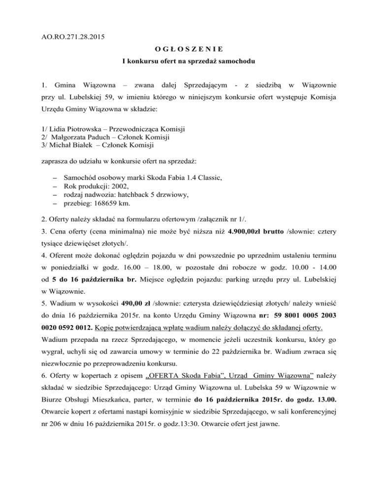 AO.RO.271.28.2015 OGŁOSZENIE I konkursu ofert na sprzedaż samochodu 1. Gmina Wiązowna – zwana dalej Sprzedającym - z siedzibą w Wiązownie przy ul. Lubelskiej 59, w imieniu którego w niniejszym konkursie ofert występuje Komisja Urzędu Gminy Wiązowna w składzie: 1/ Lidia Piotrowska – Przewodnicząca Komisji 2/ Małgorzata Paduch – Członek Komisji 3/ Michał Białek – Członek Komisji zaprasza do udziału w konkursie ofert na sprzedaż: Samochód osobowy marki Skoda Fabia 1.4 Classic, Rok produkcji: 2002, rodzaj nadwozia: hatchback 5 drzwiowy, przebieg: 168659 km. 2. Oferty należy składać na formularzu ofertowym /załącznik nr 1/. 3. Cena oferty (cena minimalna) nie może być niższa niż 4.900,00zł brutto /słownie: cztery tysiące dziewięćset złotych/. 4. Oferent może dokonać oględzin pojazdu w dni powszednie po uprzednim ustaleniu terminu w poniedziałki w godz. 16.00 – 18.00, w pozostałe dni robocze w godz. 10.00 - 14.00 od 5 do 16 października br. Miejsce oględzin pojazdu: parking urzędu przy ul. Lubelskiej w Wiązownie. 5. Wadium w wysokości 490,00 zł /słownie: czterysta dziewięćdziesiąt złotych/ należy wnieść do dnia 16 października 2015r. na konto Urzędu Gminy Wiązowna nr: 59 8001 0005 2003 0020 0592 0012. Kopię potwierdzającą wpłatę wadium należy dołączyć do składanej oferty. Wadium przepada na rzecz Sprzedającego, w momencie jeżeli uczestnik konkursu, który go wygrał, uchyli się od zawarcia umowy w terminie do 22 października br. Wadium zwraca się niezwłocznie po przeprowadzeniu konkursu. 6. Oferty w kopertach z opisem „OFERTA Skoda Fabia”, Urząd Gminy Wiązowna” należy składać w siedzibie Sprzedającego: Urząd Gminy Wiązowna ul. Lubelska 59 w Wiązownie w Biurze Obsługi Mieszkańca, parter, w terminie do 16 października 2015r. do godz. 13.00. Otwarcie kopert z ofertami nastąpi komisyjnie w siedzibie Sprzedającego, w sali konferencyjnej nr 206 w dniu 16 października 2015r. o godz.13:30. Otwarcie ofert jest jawne. 7. Złożenie przynajmniej jednej oferty wystarczy do przeprowadzenia konkursu. Sprzedający zawrze umowę sprzedaży z uczestnikiem konkursu (oferentem), który złożył ofertę najkorzystniejszą, tj.: ofertę z najwyższą ceną brutto. Wzór umowy /Załącznik nr 2/. 8. Oferent, którego oferta została w przetargu uznana za najkorzystniejszą jest nią związany do czasu zawarcia umowy, nie później jednak niż 7 dni liczone od dnia otwarcia ofert. 9. W przypadku wycofania się Oferenta z najkorzystniejszą ofertą wybiera się ofertę następną w kolejności z najkorzystniejszą zaoferowaną ceną. 10. W przypadku złożonych równoważnych najkorzystniejszych ofert Sprzedający przeprowadzi w dniu przeprowadzania postępowania licytację ustną, podczas której postąpienie będzie wynosić 1% ceny minimalnej tj. 49,00zł /słownie: czterdzieści dziewięć złotych/. 11. Konkurs kończy się wynikiem negatywnym w sytuacji, w której żaden z uczestników nie zaoferował ceny równej bądź przewyższającej cenę minimalną, bądź nie wpłynęła żadna oferta do siedziby Sprzedającego. 12. Sprzedający do dnia zawarcia umowy zastrzega sobie prawo unieważnienia konkursu bez podania przyczyn. 13. Zastrzeżenia i uwagi: a/ Zastrzega się możliwość odwołania konkursu jedynie z ważnych powodów. b/ Osoba reprezentująca inną osobę fizyczną lub prawną /również współmałżonka/, winna okazać się stosowną dokumentacją, potwierdzającą pełnomocnictwo do reprezentowania. 14. Wszelkie informacje niezbędne do złożenia oferty można pobrać ze strony internetowej www.tuwiazowna.pl bądź otrzymać w siedzibie Urzędu Gminy w Wiązownie przy ul. Lubelskiej 59, 05-462 Wiązowna w pok. 208 tel.: 22 512 – 5 – 831. Osobą uprawnioną do kontaktów z oferentami jest Małgorzata Paduch. 15. Na udostępniane oferentom dokumenty konkursu ofert składają się: a) ogłoszenie, b) formularz oferty, c) wzór umowy. 16. Niniejsze ogłoszenie podlega publikacji w Biuletynie Informacji Publicznej Sprzedającego (www.bip.wiazowna.pl) oraz na tablicy ogłoszeń w siedzibie Sprzedającego. z up. Wójta Anna Rosłaniec Sekretarz Gminy