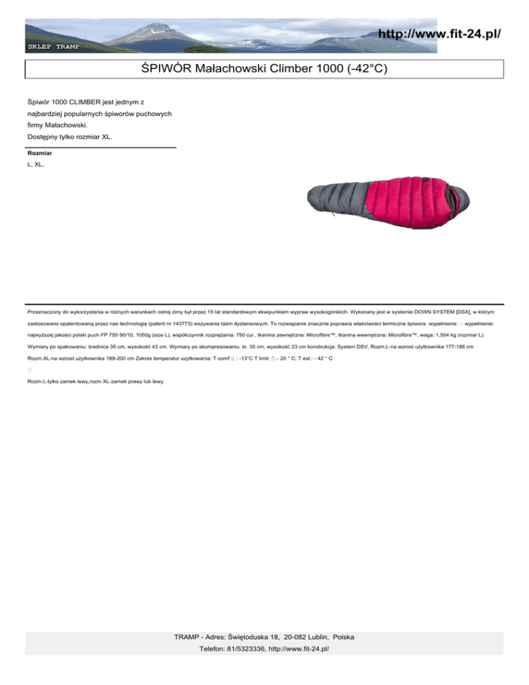 http://www.fit-24.pl/ ŚPIWÓR Małachowski Climber 1000 (-42°C) Śpiwór 1000 CLIMBER jest jednym z najbardziej popularnych śpiworów puchowych firmy Małachowski. Dostępny tylko rozmiar XL. Rozmiar L, XL, Przeznaczony do wykorzystania w różnych warunkach ostrej zimy był przez 15 lat standardowym ekwipunkiem wypraw wysokogórskich. Wykonany jest w systemie DOWN SYSTEM [DSX], w którym zastosowano opatentowaną przez nas technologię (patent nr 143773) wszywania taśm dystansowych. To rozwiązanie znacznie poprawia właściwości termiczne śpiwora. wypełnienie: wypełnienie: najwyższej jakości polski puch FP 750 90/10, 1050g (size L), współczynnik rozprężania: 750 cui , tkanina zewnętrzna: Microfibre™, tkanina wewnętrzna: Microfibre™, waga: 1,504 kg (rozmiar L) Wymiary po spakowaniu: średnica 35 cm, wysokość 43 cm. Wymiary po skompresowaniu: śr. 35 cm, wysokość 23 cm konstrukcja: System DSV, Rozm.L-na wzrost użytkownika 177-188 cm Rozm.XL-na wzrost użytkownika 189-200 cm Zakres temperatur uzytkowania: T comf ♀ : -13°C T limit ♂: - 20 ° C; T ext : - 42 ° C Rozm.L-tylko zamek lewy,rozm XL-zamek prawy lub lewy TRAMP - Adres: Świętoduska 18, 20-082 Lublin, Polska Telefon: 81/5323336, http://www.fit-24.pl/