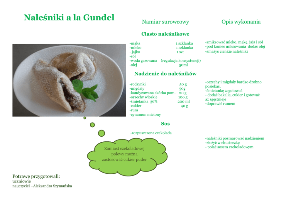 Naleśniki a la Gundel Namiar surowcowy Opis wykonania Ciasto naleśnikowe -mąka 1 szklanka -mleko 1 szklanka - jajko 1 szt -sól -woda gazowana (regulacja konsystencji) -olej 50ml -zmiksować mleko, mąkę, jaja i sól -pod koniec miksowania dodać olej -smażyć cienkie naleśniki Nadzienie do naleśników -rodzynki -migdały -kandyzowana skórka pom. -orzechy włoskie -śmietanka 36% -cukier -rum -cynamon mielony 50 g 50g 20 g 100 g 200 ml 40 g -orzechy i migdały bardzo drobno posiekać. -śmietankę zagotować - dodać bakalie, cukier i gotować aż zgęstnieje -doprawić rumem Sos -rozpuszczona czekolada Zamiast czekoladowej polewy można zastosować cukier puder Potrawę przygotowali: uczniowie nauczyciel –Aleksandra Szymańska -naleśniki posmarować nadzieniem -złożyć w chusteczkę - polać sosem czekoladowym