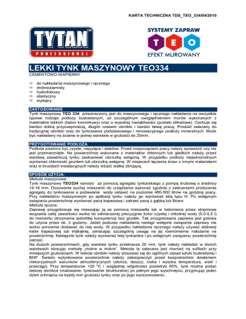 KARTA TECHNICZNA TDS_TEO_334/04/2010 LEKKI TYNK MASZYNOWY TEO334 CEMENTOWO-WAPIENNY do nakładania maszynowego i ręcznego drobnoziarnisty hydrofobowy elastyczny wydajny ZASTOSOWANIE Tynk maszynowy TEO 334 przeznaczony jest do maszynowego i ręcznego nakładania na wszystkie typowe rodzaje podłoży budowlanych, ze szczególnym uwzględnieniem murów wykonanych z materiałów lekkich (beton komórkowy) oraz o wysokiej nasiąkliwości (pustaki silikatowe). Cechuje się bardzo dobrą przyczepnością, długim czasem obróbki i bardzo łatwą pracą. Produkt zalecany do tradycyjnej obróbki oraz do tynkowania podstawowego i renowacyjnego podłoży mineralnych. Może być nakładany na ścianie w jednej warstwie w grubości do 20mm. PRZYGOTOWANIE PODŁOŻA Podłoże powinno być czyste, niepylące i stabilne. Przed rozpoczęciem pracy należy sprawdzić czy nie jest przemarznięte. Na powierzchnie wykonane z materiałów chłonnych lub gładkich należy przed warstwą zasadniczą tynku zastosować obrzutkę wstępną. W przypadku podłoży niejednorodnych wyrównać chłonność gruntem lub obrzutką wstępną. W miejscach łączenia ścian z innymi materiałami oraz w bruzdach instalacyjnych należy wtopić siatkę zbrojącą. SPOSÓB UŻYCIA: Metoda maszynowa: Tynk maszynowy TEO334 nanosić za pomocą agregatu tynkarskiego z pompą śrubową o średnicy 14-16 mm. Dozowanie suchej mieszanki do urządzenia wykonać zgodnie z zaleceniami producenta agregatu do tynkowania a podawanie wody ustawić na poziomie 480-500 litrów na godzinę pracy. Przy nakładaniu maszynowym po aplikacji tynku należy go wyrównać łatą typu H. Po wstępnym związaniu powierzchnię wyrównać pacą trapezową i zatrzeć pacą z gąbką lub filcem. Metoda ręczna: Zaprawę przygotowuje się mieszając ją za pomocą mieszadła lub w betoniarce przez stopniowe wsypanie całej zawartości worka do odmierzonej precyzyjnie ilości czystej i chłodnej wody (5,0-5,5 l) do momentu otrzymania jednolitej konsystencji bez grudek. Tak przygotowana zaprawa jest gotowa do użycia przez ok. 2 godziny. Jeżeli podczas nakładania nastąpi wstępne związanie zaprawy nie wolno ponownie dodawać do niej wody. W przypadku nakładania ręcznego należy używać stalowej kielni trapezowej lub trójkątnej, zwracając szczególną uwagę na jej równomierne nałożenie na powierzchnię. Następnie tynk należy wyrównać łatą tynkarska i po wstępnym związaniu powierzchnię zatrzeć. Na dużych powierzchniach, gdy warstwa tynku przekracza 20 mm, tynk należy nakładać w dwóch warstwach stosując metodę „mokre w mokre”. Metoda ta zalecana jest również na sufitach przy mniejszych grubościach. W trakcie obróbki należy stosować się do ogólnych zasad sztuki budowlanej i BHP. Świeżo wytynkowane powierzchnie należy zabezpieczyć przed bezpośrednim działaniem niekorzystnych warunków atmosferycznych (słońce, deszcz, niska i wysoka temperatura, wiatr i przeciągi). Przy temperaturze +20 ºC i względnej wilgotności powietrze 65%, tynk można podać dalszej obróbce (malowanie, tynkowanie strukturalne) po pełnym jego wyschnięciu, przyjmując jeden dzień schnięcia na każdy mm grubości tynku oraz po jego wyrezonowaniu. KARTA TECHNICZNA TDS_TEO_334/04/2010 DANE TECHNICZNE: proporcje mieszania-metoda maszynowa proporcje mieszania-metoda ręczna ziarno temperatura stosowania wytrzymałość na ściskanie wytrzymałość na zginanie współczynnik oporu dyfuzyjnego pary wodnej µ zużycie Minimalna grubość warstwy: stropy ściana na zewnątrz kolor 480-500 litrów wody na 1h pracy agregatu tynkarskiego 5,0-5,5 litrów wody na 25 kg suchej mieszanki do 0,5 mm o o od +5 C do +25 C 2 1,5 N/m 2 0,7 N/m <9 2 1,1 kg/1mm/m min 8 mm min 8 mm min 15 mm naturalnie szary lub biały SKŁADOWANIE I TRANSPORT Zaprawę należy przewozić i przechowywać w suchych warunkach na paletach i w oryginalnych, nie uszkodzonych opakowaniach. Tak przechowywany produkt posiada okres przydatności do użycia 12 miesięcy. Chronić przed wilgocią. ZGODNOŚĆ Z NORMAMI I WYMAGANIAMI JAKOŚCIOWYMI Produkt zgodny z Polską Normą PN-EN 998-1:2004 Deklaracja Zgodności WE nr 19/1/2012 10 SELENA SA ul. Wyścigowa 56 E, 53-012 Wrocław EN 998-1 Zaprawa tynkarska lekka (LW) ogólnego przeznaczenia (GP) do stosowania wewnątrz i na zewnątrz budynków Reakcja na ogień :Klasa A1 2 Przyczepność do podłoża :≥ 0,2 N/mm FP:B Adsorpcja wody:W0 Współczynnik przepuszczania pary wodnej µ: ≥ 9 Wytrzymałość na ściskanie: CS II Współczynnik przewodzenia ciepła: ≤ 0,37 W/m*K Ubytek masy po 25 cyklach: max. 15% Spadek wytrzymałości na ściskanie: max. 55% Aktualizacja 20.01.2012 Powyższe dane, zalecenia i wskazówki opierają się na naszej najlepszej wiedzy, badaniach oraz doświadczeniach i zostały udzielone w dobrej wierze zgodnie z zasadami obowiązującymi w naszej firmie i u naszych dostawców. Zaproponowane sposoby postępowania uznane są za powszechne, jednak każdy z użytkowników tego materiału powinien upewnić się na wszelkie możliwe sposoby, włącznie ze sprawdzeniem produktu końcowego w odpowiednich warunkach, o przydatności dostarczanych materiałów dla osiągnięcia celów przez niego zamierzonych. Ani Spółka, ani jej upoważnieni przedstawiciele nie mogą ponosić odpowiedzialności za jakiekolwiek straty poniesione na skutek nieprawidłowego, bądź błędnego użycia jej materiałów.