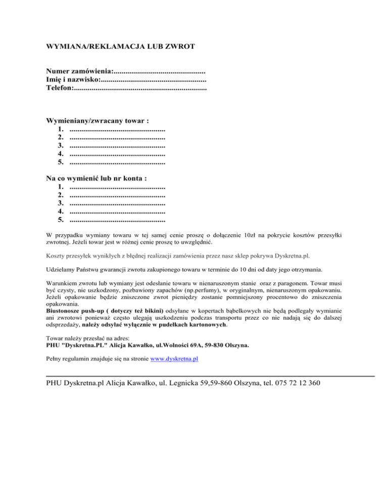 WYMIANA/REKLAMACJA LUB ZWROT Numer zamówienia:............................................... Imię i nazwisko:...................................................... Telefon:.................................................................... Wymieniany/zwracany towar : 1. ................................................. 2. ................................................. 3. ................................................. 4. ................................................. 5. ................................................. Na co wymienić lub nr konta : 1. ................................................. 2. ................................................. 3. ................................................. 4. ................................................. 5. ................................................. W przypadku wymiany towaru w tej samej cenie proszę o dołączenie 10zł na pokrycie kosztów przesyłki zwrotnej. JeŜeli towar jest w róŜnej cenie proszę to uwzględnić. Koszty przesyłek wynikłych z błędnej realizacji zamówienia przez nasz sklep pokrywa Dyskretna.pl. Udzielamy Państwu gwarancji zwrotu zakupionego towaru w terminie do 10 dni od daty jego otrzymania. Warunkiem zwrotu lub wymiany jest odesłanie towaru w nienaruszonym stanie oraz z paragonem. Towar musi być czysty, nie uszkodzony, pozbawiony zapachów (np.perfumy), w oryginalnym, nienaruszonym opakowaniu. JeŜeli opakowanie będzie zniszczone zwrot pieniędzy zostanie pomniejszony procentowo do zniszczenia opakowania. Biustonosze push-up ( dotyczy teŜ bikini) odsyłane w kopertach bąbelkowych nie będą podlegały wymianie ani zwrotowi poniewaŜ często ulegają uszkodzeniu podczas transportu przez co nie nadają się do dalszej odsprzedaŜy, naleŜy odsyłać wyłącznie w pudełkach kartonowych. Towar naleŜy przesłać na adres: PHU "Dyskretna.PL" Alicja Kawałko, ul.Wolności 69A, 59-830 Olszyna. Pełny regulamin znajduje się na stronie www.dyskretna.pl PHU Dyskretna.pl Alicja Kawałko, ul. Legnicka 59,59-860 Olszyna, tel. 075 72 12 360