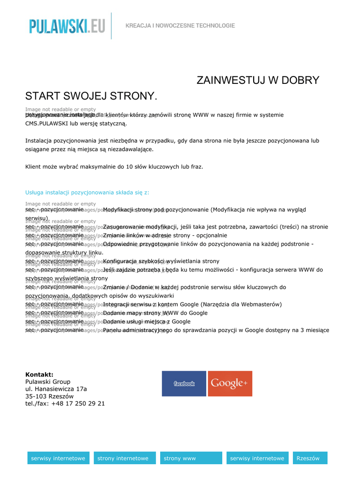 ZAINWESTUJ W DOBRY START SWOJEJ STRONY. Image not readable or empty pozycjonowanie instalacja Usługa przeznaczona jest dla klientów którzy zamówili stronę WWW w naszej firmie w systemie /app/webroot/upload/images/499_pozycjonowanie.jpg CMS.PULAWSKI lub wersję statyczną. Instalacja pozycjonowania jest niezbędna w przypadku, gdy dana strona nie była jeszcze pozycjonowana lub osiągane przez nią miejsca są niezadawalające. Klient może wybrać maksymalnie do 10 słów kluczowych lub fraz. Usługa instalacji pozycjonowania składa się z: Image not readable or empty seo - pozycjonowanie Modyfikacji strony pod pozycjonowanie (Modyfikacja nie wpływa na wygląd /app/webroot/upload/images/pozycjonowanie_arrow(1).jpg serwisu) Image not readable or empty seo - pozycjonowanie Zasugerowanie modyfikacji, jeśli taka jest potrzebna, zawartości (treści) na stronie /app/webroot/upload/images/pozycjonowanie_arrow(1).jpg Image not readable or empty seo - pozycjonowanie Zmianie linków w adresie strony - opcjonalnie /app/webroot/upload/images/pozycjonowanie_arrow(1).jpg Image not readable or empty seo - pozycjonowanie Odpowiednie przygotowanie linków do pozycjonowania na każdej podstronie /app/webroot/upload/images/pozycjonowanie_arrow(1).jpg dopasowanie struktury linku. Image not readable or empty seo - pozycjonowanie Konfiguracja szybkości wyświetlania strony /app/webroot/upload/images/pozycjonowanie_arrow(1).jpg Image not readable or empty seo pozycjonowanie Jeśli zajdzie potrzeba i będa ku temu możliwości - konfiguracja serwera WWW do /app/webroot/upload/images/pozycjonowanie_arrow(1).jpg szybszego wyświetlania strony Image not readable or empty seo - pozycjonowanie Zmianie / Dodanie w każdej podstronie serwisu słów kluczowych do /app/webroot/upload/images/pozycjonowanie_arrow(1).jpg pozycjonowania, dodatkowych opisów do wyszukiwarki Image not readable or empty seo - pozycjonowanie Integracji serwisu z kontem Google (Narzędzia dla Webmasterów) /app/webroot/upload/images/pozycjonowanie_arrow(1).jpg Image not readable or empty seo pozycjonowanie Dodanie mapy strony WWW do Google /app/webroot/upload/images/pozycjonowanie_arrow(1).jpg Image not readable or empty seo - pozycjonowanie Dodanie usługi miejsca z Google /app/webroot/upload/images/pozycjonowanie_arrow(1).jpg Image not readable or empty seo - pozycjonowanie Panelu administracyjnego do sprawdzania pozycji w Google dostępny na 3 miesiące /app/webroot/upload/images/pozycjonowanie_arrow(1).jpg Kontakt: Pulawski Group ul. Hanasiewicza 17a 35-103 Rzeszów tel./fax: +48 17 250 29 21 serwisy internetowe strony internetowe strony www serwisy internetowe Rzeszów