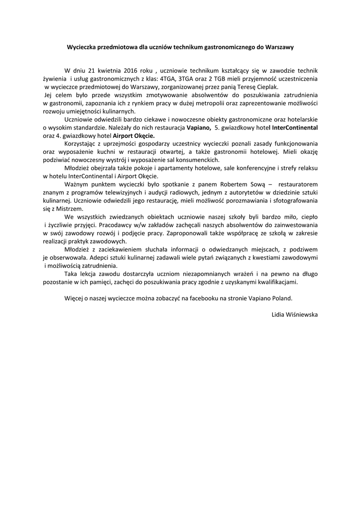 Wycieczka przedmiotowa dla uczniów technikum gastronomicznego do Warszawy W dniu 21 kwietnia 2016 roku , uczniowie technikum kształcący się w zawodzie technik żywienia i usług gastronomicznych z klas: 4TGA, 3TGA oraz 2 TGB mieli przyjemność uczestniczenia w wycieczce przedmiotowej do Warszawy, zorganizowanej przez panią Teresę Cieplak. Jej celem było przede wszystkim zmotywowanie absolwentów do poszukiwania zatrudnienia w gastronomii, zapoznania ich z rynkiem pracy w dużej metropolii oraz zaprezentowanie możliwości rozwoju umiejętności kulinarnych. Uczniowie odwiedzili bardzo ciekawe i nowoczesne obiekty gastronomiczne oraz hotelarskie o wysokim standardzie. Należały do nich restauracja Vapiano, 5. gwiazdkowy hotel InterContinental oraz 4. gwiazdkowy hotel Airport Okęcie. Korzystając z uprzejmości gospodarzy uczestnicy wycieczki poznali zasady funkcjonowania oraz wyposażenie kuchni w restauracji otwartej, a także gastronomii hotelowej. Mieli okazję podziwiać nowoczesny wystrój i wyposażenie sal konsumenckich. Młodzież obejrzała także pokoje i apartamenty hotelowe, sale konferencyjne i strefy relaksu w hotelu InterContinental i Airport Okęcie. Ważnym punktem wycieczki było spotkanie z panem Robertem Sową – restauratorem znanym z programów telewizyjnych i audycji radiowych, jednym z autorytetów w dziedzinie sztuki kulinarnej. Uczniowie odwiedzili jego restaurację, mieli możliwość porozmawiania i sfotografowania się z Mistrzem. We wszystkich zwiedzanych obiektach uczniowie naszej szkoły byli bardzo miło, ciepło i życzliwie przyjęci. Pracodawcy w/w zakładów zachęcali naszych absolwentów do zainwestowania w swój zawodowy rozwój i podjęcie pracy. Zaproponowali także współpracę ze szkołą w zakresie realizacji praktyk zawodowych. Młodzież z zaciekawieniem słuchała informacji o odwiedzanych miejscach, z podziwem je obserwowała. Adepci sztuki kulinarnej zadawali wiele pytań związanych z kwestiami zawodowymi i możliwością zatrudnienia. Taka lekcja zawodu dostarczyła uczniom niezapomnianych wrażeń i na pewno na długo pozostanie w ich pamięci, zachęci do poszukiwania pracy zgodnie z uzyskanymi kwalifikacjami. Więcej o naszej wycieczce można zobaczyć na facebooku na stronie Vapiano Poland. Lidia Wiśniewska