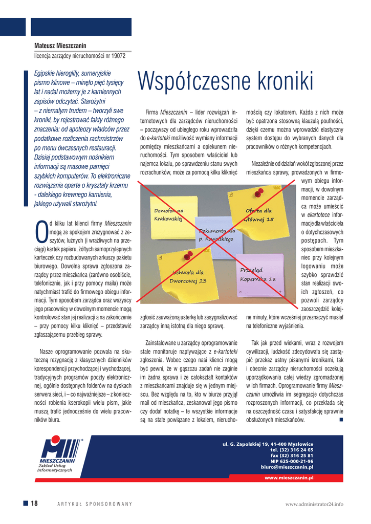 Mateusz Mieszczanin licencja zarządcy nieruchomości nr 19072 Egipskie hieroglify, sumeryjskie pismo klinowe – minęło pięć tysięcy lat i nadal możemy je z kamiennych zapisów odczytać. Starożytni – z niemałym trudem – tworzyli swe kroniki, by rejestrować fakty różnego znaczenia: od apoteozy władców przez podatkowe rozliczenia rachmistrzów po menu ówczesnych restauracji. Dzisiaj podstawowym nośnikiem informacji są masowe pamięci szybkich komputerów. To elektroniczne rozwiązania oparte o kryształy krzemu - dalekiego krewnego kamienia, jakiego używali starożytni. Współczesne kroniki Firma Mieszczanin – lider rozwiązań internetowych dla zarządców nieruchomości – począwszy od ubiegłego roku wprowadziła do e-kartoteki możliwość wymiany informacji pomiędzy mieszkańcami a opiekunem nieruchomości. Tym sposobem właściciel lub najemca lokalu, po sprawdzeniu stanu swych rozrachunków, może za pomocą kilku kliknięć zgłosić zauważoną usterkę lub zasygnalizować zarządcy inną istotną dla niego sprawę. Niezależnie od działań wokół zgłoszonej przez mieszkańca sprawy, prowadzonych w firmowym obiegu informacji, w dowolnym momencie zarządca może umieścić w ekartotece informacje dla właściciela o dotychczasowych postępach. Tym sposobem mieszkaniec przy kolejnym logowaniu może szybko sprawdzić stan realizacji swoich zgłoszeń, co pozwoli zarządcy zaoszczędzić kolejne minuty, które wcześniej przeznaczyć musiał na telefoniczne wyjaśnienia. Zainstalowane u zarządcy oprogramowanie stale monitoruje napływające z e-kartoteki zgłoszenia. Wobec czego nasi klienci mogą być pewni, że w gąszczu zadań nie zaginie im żadna sprawa i że całokształt kontaktów z mieszkańcami znajduje się w jednym miejscu. Bez względu na to, kto w biurze przyjął mail od mieszkańca, zeskanował jego pismo czy dodał notatkę – te wszystkie informacje są na stałe powiązane z lokalem, nierucho- Tak jak przed wiekami, wraz z rozwojem cywilizacji, ludzkość zdecydowała się zastąpić przekaz ustny pisanymi kronikami, tak i obecnie zarządcy nieruchomości oczekują uporządkowania całej wiedzy zgromadzonej w ich firmach. Oprogramowanie firmy Mieszczanin umożliwia im segregacje dotychczas rozproszonych informacji, co przekłada się na oszczędność czasu i satysfakcję sprawnie obsłużonych mieszkańców. O d kilku lat klienci firmy Mieszczanin mogą ze spokojem zrezygnować z zeszytów, luźnych (i wrażliwych na przeciągi) kartek papieru, żółtych samoprzylepnych karteczek czy rozbudowanych arkuszy pakietu biurowego. Dowolna sprawa zgłoszona zarządcy przez mieszkańca (zarówno osobiście, telefonicznie, jak i przy pomocy maila) może natychmiast trafić do firmowego obiegu informacji. Tym sposobem zarządca oraz wszyscy jego pracownicy w dowolnym momencie mogą kontrolować stan jej realizacji a na zakończenie – przy pomocy kilku kliknięć – przedstawić zgłaszającemu przebieg sprawy. Nasze oprogramowanie pozwala na skuteczną rezygnację z klasycznych dzienników korespondencji przychodzącej i wychodzącej, tradycyjnych programów poczty elektronicznej, ogólnie dostępnych folderów na dyskach serwera sieci, i – co najważniejsze – z konieczności robienia kserokopii wielu pism, jakie muszą trafić jednocześnie do wielu pracowników biura. 18 ARTYKUŁ SPONSOROWANY mością czy lokatorem. Każda z nich może być opatrzona stosowną klauzulą poufności, dzięki czemu można wprowadzić elastyczny system dostępu do wybranych danych dla pracowników o różnych kompetencjach. www.administrator24.info
