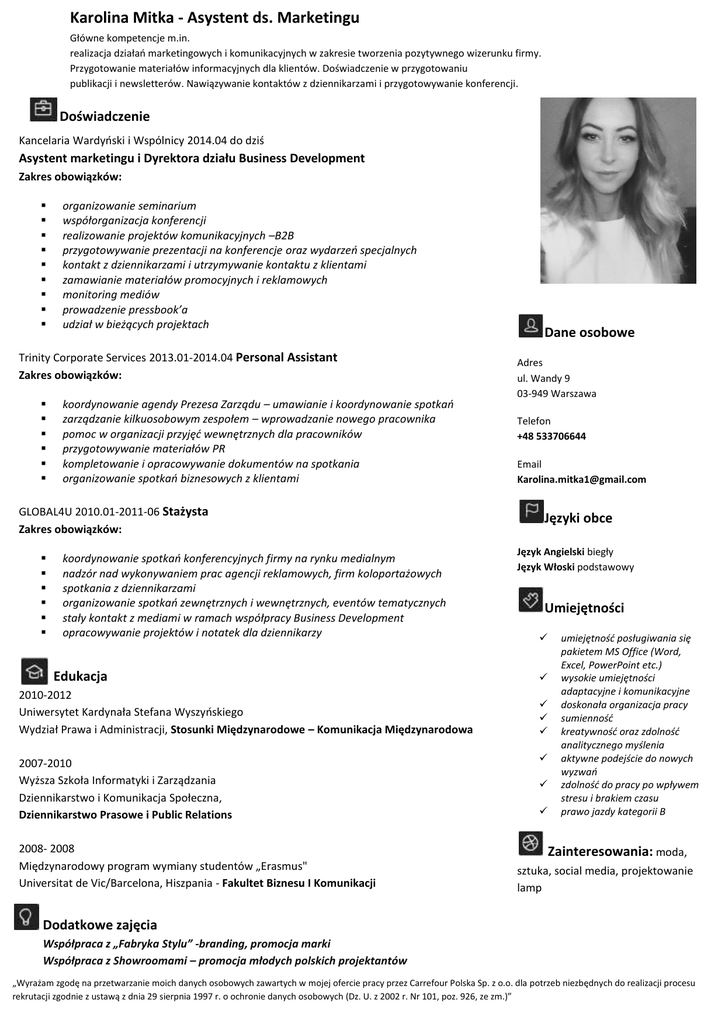 Karolina Mitka - Asystent ds. Marketingu Główne kompetencje m.in. realizacja działań marketingowych i komunikacyjnych w zakresie tworzenia pozytywnego wizerunku firmy. Przygotowanie materiałów informacyjnych dla klientów. Doświadczenie w przygotowaniu publikacji i newsletterów. Nawiązywanie kontaktów z dziennikarzami i przygotowywanie konferencji. Doświadczenie c Kancelaria Wardyński i Wspólnicy 2014.04 do dziś Asystent marketingu i Dyrektora działu Business Development Zakres obowiązków: organizowanie seminarium współorganizacja konferencji realizowanie projektów komunikacyjnych –B2B przygotowywanie prezentacji na konferencje oraz wydarzeń specjalnych kontakt z dziennikarzami i utrzymywanie kontaktu z klientami zamawianie materiałów promocyjnych i reklamowych monitoring mediów prowadzenie pressbook’a udział w bieżących projektach Trinity Corporate Services 2013.01-2014.04 Personal Assistant Zakres obowiązków: koordynowanie agendy Prezesa Zarządu – umawianie i koordynowanie spotkań zarządzanie kilkuosobowym zespołem – wprowadzanie nowego pracownika pomoc w organizacji przyjęć wewnętrznych dla pracowników przygotowywanie materiałów PR kompletowanie i opracowywanie dokumentów na spotkania organizowanie spotkań biznesowych z klientami GLOBAL4U 2010.01-2011-06 Stażysta Zakres obowiązków: koordynowanie spotkań konferencyjnych firmy na rynku medialnym nadzór nad wykonywaniem prac agencji reklamowych, firm koloportażowych spotkania z dziennikarzami organizowanie spotkań zewnętrznych i wewnętrznych, eventów tematycznych stały kontakt z mediami w ramach współpracy Business Development opracowywanie projektów i notatek dla dziennikarzy Edukacja 2010-2012 Uniwersytet Kardynała Stefana Wyszyńskiego Wydział Prawa i Administracji, Stosunki Międzynarodowe – Komunikacja Międzynarodowa 2007-2010 Wyższa Szkoła Informatyki i Zarządzania Dziennikarstwo i Komunikacja Społeczna, Dziennikarstwo Prasowe i Public Relations 2008- 2008 Międzynarodowy program wymiany studentów „Erasmus" Universitat de Vic/Barcelona, Hiszpania - Fakultet Biznesu I Komunikacji Dane osobowe Adres ul. Wandy 9 03-949 Warszawa Telefon +48 533706644 Email [email protected] Języki obce Język Angielski biegły Język Włoski podstawowy Umiejętności umiejętność posługiwania się pakietem MS Office (Word, Excel, PowerPoint etc.) wysokie umiejętności adaptacyjne i komunikacyjne doskonała organizacja pracy sumienność kreatywność oraz zdolność analitycznego myślenia aktywne podejście do nowych wyzwań zdolność do pracy po wpływem stresu i brakiem czasu prawo jazdy kategorii B Zainteresowania: moda, sztuka, social media, projektowanie lamp Dodatkowe zajęcia Współpraca z „Fabryka Stylu” -branding, promocja marki Współpraca z Showroomami – promocja młodych polskich projektantów „Wyrażam zgodę na przetwarzanie moich danych osobowych zawartych w mojej ofercie pracy przez Carrefour Polska Sp. z o.o. dla potrzeb niezbędnych do realizacji procesu rekrutacji zgodnie z ustawą z dnia 29 sierpnia 1997 r. o ochronie danych osobowych (Dz. U. z 2002 r. Nr 101, poz. 926, ze zm.)”