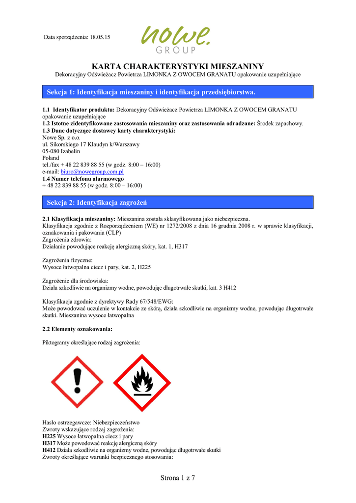 Data sporządzenia: 18.05.15 KARTA CHARAKTERYSTYKI MIESZANINY Dekoracyjny Odświeżacz Powietrza LIMONKA Z OWOCEM GRANATU opakowanie uzupełniające Sekcja 1: Identyfikacja mieszaniny i identyfikacja przedsiębiorstwa. 1.1 Identyfikator produktu: Dekoracyjny Odświeżacz Powietrza LIMONKA Z OWOCEM GRANATU opakowanie uzupełniające 1.2 Istotne zidentyfikowane zastosowania mieszaniny oraz zastosowania odradzane: Środek zapachowy. 1.3 Dane dotyczące dostawcy karty charakterystyki: Nowe Sp. z o.o. ul. Sikorskiego 17 Klaudyn k/Warszawy 05-080 Izabelin Poland tel./fax + 48 22 839 88 55 (w godz. 8:00 – 16:00) e-mail: [email protected] 1.4 Numer telefonu alarmowego + 48 22 839 88 55 (w godz. 8:00 – 16:00) Sekcja 2: Identyfikacja zagrożeń 2.1 Klasyfikacja mieszaniny: Mieszanina została sklasyfikowana jako niebezpieczna. Klasyfikacja zgodnie z Rozporządzeniem (WE) nr 1272/2008 z dnia 16 grudnia 2008 r. w sprawie klasyfikacji, oznakowania i pakowania (CLP) Zagrożenia zdrowia: Działanie powodujące reakcję alergiczną skóry, kat. 1, H317 Zagrożenia fizyczne: Wysoce łatwopalna ciecz i pary, kat. 2, H225 Zagrożenie dla środowiska: Działa szkodliwie na organizmy wodne, powodując długotrwałe skutki, kat. 3 H412 Klasyfikacja zgodnie z dyrektywy Rady 67/548/EWG: Może powodować uczulenie w kontakcie ze skórą, działa szkodliwie na organizmy wodne, powodując długotrwałe skutki. Mieszanina wysoce łatwopalna 2.2 Elementy oznakowania: Piktogramy określające rodzaj zagrożenia: Hasło ostrzegawcze: Niebezpieczeństwo Zwroty wskazujące rodzaj zagrożenia: H225 Wysoce łatwopalna ciecz i pary H317 Może powodować reakcję alergiczną skóry H412 Działa szkodliwie na organizmy wodne, powodując długotrwałe skutki Zwroty określające warunki bezpiecznego stosowania: Strona 1 z 7 Data sporządzenia: 18.05.15 KARTA CHARAKTERYSTYKI MIESZANINY Dekoracyjny Odświeżacz Powietrza LIMONKA Z OWOCEM GRANATU opakowanie uzupełniające P101 – W razie konieczności zasięgnięcia porady lekarza, należy pokazać pojemnik lub etykietę. P102 – Chronić przed dziećmi. P210 – Przechowywać z dala od źródeł ciepła, gorących powierzchni, źródeł iskrzenia, otwartego ognia i innych źródeł zapłonu. Nie palić. P264 – Dokładnie umyć ręce po użyciu. P273 – Unikać uwolnienia do środowiska. Zawiera: kompozycję zapachową: LIMONENE, CITRAL. 2.3 Inne zagrożenia: Brak. Mieszanina nie spełnia kryteriów PBT i vPvB zgodnie z załącznikiem XIII do rozporządzenia (WE) nr 1907/2006. Sekcja 3: Skład i informacja o składnikach 3.2 Mieszanina Opis mieszaniny: ciekła mieszanina związków organicznych Składniki niebezpieczne: Nazwa Metoksyizopropanol Etanol GAMMA UNDECALACTONE 4-tert-BUTYLCYCLOHEXYL ACETATE Numery CAS: 107-98-2 WE: 203-539-1 CAS: 64-17-5 WE: 200-578-6 CAS: 104-67-6 WE: 104-67-6 CAS: 32210-23-4 WE: 250-954-9 Numery rejestr. REACH: Klasyfikacja 1272/2008 Flam. Liq. 3, H226 STOT SE 3 H336 % wag 01-2119457610-43-xxxx Flam. Liq. 2, H225 30 – 40 01-2119959333-34-xxxx Aquatic Chronic 3; H412 2–5 Skin Sens. 1, H317 2–5 01-2119457435-35-xxxx 01-2119976286-24-xxxx Limonen LIMONENE CAS: 5989-27-5 WE: 227-813-5 01-2119529223-47-xxxx CITRAL CAS: 5392-40-5 WE: 226-394-6 01-2119462829-23-xxxx Flam. Liq. 3, H226 Skin Irrit. 2, H315, Skin Sens. 1, H317, Aquatic Chronic 1; H410 Eye Irrit. 2; H319 Skin Irrit. 2, H315 Skin Sens. 1, H317 30 – 40 1–2 0,5 – 1,0 Pełna treść przytoczonych zwrotów wskazujących rodzaj zagrożenia znajduje się w rozdziale 16. Sekcja 4: Środki pierwszej pomocy 4.1 Opis środków pierwszej pomocy Drogi narażenia: przez drogi oddechowe, przez kontakt ze skórą, z oczami oraz przez przewód pokarmowy. W przypadku wdychania: W razie zawrotów głowy lub nudności wyprowadzić poszkodowanego na świeże powietrze, w razie braku szybkiej poprawy zasięgnąć porady lekarza. W przypadku kontaktu ze skórą: Zdjąć zanieczyszczoną odzież. Umyć skórę wodą z mydłem. W przypadku poparzenia nałożyć jałowy opatrunek. W przypadku trwałego podrażnienia skóry zwrócić się do lekarza. W przypadku kontaktu z oczami: Usunąć szkła kontaktowe. Płukać oczy z otwartą powieką przez kilka minut dużą ilością wody. Niezwłocznie zasięgnąć porady lekarza. W przypadku połknięcia: Nie powodować wymiotów. Przepłukać jamę ustną i wypić dużą ilość wody. W przypadku utrzymującej się dolegliwości zasięgnąć porady lekarza. 4.2 Najważniejsze ostre i opóźnione objawy oraz skutki narażenia Brak. 4.3. Wskazania dotyczące wszelkiej natychmiastowej pomocy lekarskiej i szczególnego postępowania z poszkodowanym O sposobie postępowania decyduje lekarz po ocenie stanu poszkodowanego. Strona 2 z 7 Data sporządzenia: 18.05.15 KARTA CHARAKTERYSTYKI MIESZANINY Dekoracyjny Odświeżacz Powietrza LIMONKA Z OWOCEM GRANATU opakowanie uzupełniające Sekcja 5: Postępowanie w przypadku pożaru 5.1. Środki gaśnicze Właściwe środki gaśnicze: Dwutlenek węgla, piana, proszek lub strumień wody. Środki gaśnicze, których nie wolno używać: Strumień wody pod wysokim ciśnieniem. 5.2. Szczególne zagrożenia związane z mieszaniną Mieszanina jest palna. W wyniku działania podwyższonej temperatury mogą wydzielać się szkodliwe gazy. 5.3. Informacje dla straży pożarnej Podczas gaszenia pożaru stosować urządzenia oddechowe z własnym obiegiem powietrza i odzież ochronną na całą sylwetkę. Sekcja 6: Postępowanie w przypadku niezamierzonego uwolnienia do środowiska 6.1 Indywidualne środki ostrożności, wyposażenie ochronne i procedury w sytuacjach awaryjnych Unikać kontaktu ze skórą. Nie wdychać par. Stosować rękawice ochronne z kauczuku butylowego, gumy nitrylowej lub neoprenu. Jeśli zachodzi potrzeba likwidacji szkód należy nałożyć odzież ochronną gazoszczelną i aparat izolujący drogi oddechowe. 6.2 Środki ostrożności w zakresie ochrony środowiska Zapobiegać rozprzestrzenianiu się oraz p