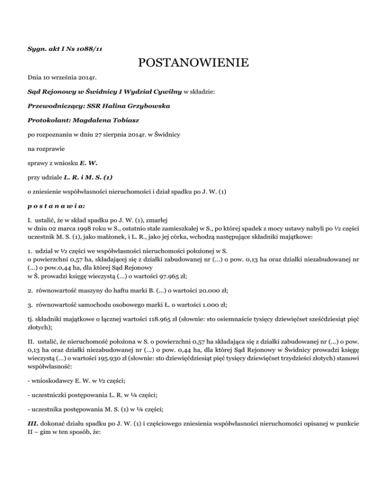 Sygn. akt I Ns 1088/11 POSTANOWIENIE Dnia 10 września 2014r. Sąd Rejonowy w Świdnicy I Wydział Cywilny w składzie: Przewodniczący: SSR Halina Grzybowska Protokolant: Magdalena Tobiasz po rozpoznaniu w dniu 27 sierpnia 2014r. w Świdnicy na rozprawie sprawy z wniosku E. W. przy udziale L. R. i M. S. (1) o zniesienie współwłasności nieruchomości i dział spadku po J. W. (1) p o s t a n a w i a: I. ustalić, że w skład spadku po J. W. (1), zmarłej w dniu 02 marca 1998 roku w S., ostatnio stale zamieszkałej w S., po której spadek z mocy ustawy nabyli po ½ części uczestnik M. S. (1), jako małżonek, i L. R., jako jej córka, wchodzą następujące składniki majątkowe: 1. udział w ½ części we współwłasności nieruchomości położonej w S. o powierzchni 0,57 ha, składającej się z działki zabudowanej nr (...) o pow. 0,13 ha oraz działki niezabudowanej nr (...) o pow.0,44 ha, dla której Sąd Rejonowy w Ś. prowadzi księgę wieczystą (...) o wartości 97.965 zł; 2. równowartość maszyny do haftu marki B. (...) o wartości 20.000 zł; 3. równowartość samochodu osobowego marki Ł. o wartości 1.000 zł; tj. składniki majątkowe o łącznej wartości 118.965 zł (słownie: sto osiemnaście tysięcy dziewięćset sześćdziesiąt pięć złotych); II. ustalić, że nieruchomość położona w S. o powierzchni 0,57 ha składająca się z działki zabudowanej nr (...) o pow. 0,13 ha oraz działki niezabudowanej nr (...) o pow. 0,44 ha, dla której Sąd Rejonowy w Świdnicy prowadzi księgę wieczystą (...) o wartości 195.930 zł (słownie: sto dziewięćdziesiąt pięć tysięcy dziewięćset trzydzieści złotych) stanowi współwłasność: - wnioskodawcy E. W. w ½ części; - uczestniczki postępowania L. R. w ¼ części; - uczestnika postępowania M. S. (1) w ¼ części; III. dokonać działu spadku po J. W. (1) i częściowego zniesienia współwłasności nieruchomości opisanej w punkcie II – gim w ten sposób, że: 1. nieruchomość opisaną w punkcie II-gim o wartości 195.930 zł przyznać na współwłasność w udziałach po 1/2 części wnioskodawcy E. W. i uczestniczce postępowania L. R.; 2. równowartość samochodu osobowego Ł. i maszyny do haftu, opisanych w pkt. I pkt. 2 i 3 o łącznej wartości 21.000 zł przyznać uczestnikowi M. S. (1); IV. zasądzić od uczestniczki postępowania L. R. na rzecz uczestnika postępowania M. S. (1) tytułem dopłaty wartości udziału spadkowego po J. W. (1) kwotę 38.482,50 zł płatną w terminie 3 miesięcy od uprawomocnienia się niniejszego postanowienia; V. ustalić, że wnioskodawca E. W. poniósł nakłady na nieruchomość opisaną w punkcie II. o wartości 830 zł; VI. zasądzić od uczestnika M. S. (1) na rzecz wnioskodawcy E. W. kwotę 207,50 zł tytułem zwrotu części nakładów wymienionych w punkcie płatną w terminie 3 miesięcy od uprawomocnienia się niniejszego postanowienia z odsetkami ustawowymi na wypadek zwłoki; VII. zasądzić od uczestnika M. S. (1) tytułem zwrotu pożytków z nieruchomości wspólnej: a) na rzecz wnioskodawcy E. W. kwotę 1.800 zł (słownie: jeden tysiąc osiemset złotych) płatną w terminie 3 miesięcy od uprawomocniania się niniejszego postanowienia z odsetkami ustawowymi na wypadek zwłoki; b) na rzecz uczestniczki L. R. kwotę 900 zł (słownie: dziewięćset złotych) płatną w terminie 3 miesięcy od uprawomocniania się niniejszego postanowienia z odsetkami ustawowymi na wypadek zwłoki; VIII. nakazać uczestnikowi M. S. (1), aby opuścił i wydał wnioskodawcy E. W. i uczestniczce postępowania L. R. nieruchomość opisaną w punkcie II-gim w terminie 3 miesięcy od uprawomocnienia się niniejszego postanowienia; IX. oddalić pozostałe żądania uczestnika M. S. (1) z tytułu ustalenia i rozliczenia nakładów oraz kosztów zarządu nieruchomością opisaną w punkcie II-gim; X. oddalić pozostałe żądania wnioskodawcy E. W. i uczestniczki L. R. z tytułu nakładów i pożytków z nieruchomości opisanej w punkcie II-gim i maszyny do haftu opisanej w punkcie I; XI. ustalić, że każdy z uczestników postepowania ponosi we własnym zakresie koszty postępowania związane ze swoim udziałem w sprawie. Sygn.akt I Ns 1088/11 UZASADNIENIE Wnioskodawca E. W. działający w imieniu własnym i jako pełnomocnik uczestniczki L. R. domagał się działu spadku po L. W. i J. W. (1), podając, że w skład spadku wchodzi nieruchomość zabudowana położona w S. nr 40 objęta księgą wieczystą Kw nr (...) składająca się z działki gruntu o pow.5700 m2- o wartości 100.000 zł zabudowana domem mieszkalnym o pow. 200 m2 – o wartości 63 700 zł i zaproponował przyznać : wnioskodawcy posiadającemu udział w 1 /2 części - połowę powierzchni użytków rolnych zabudowanych na działce nr (...), w tym: 1. Dla wnioskodawcy 4 pomieszczenia mieszkalne na I piętrze budynku, 1 piwnice i 2 pomieszczenia gospodarcze a uczestnikom posiadającym udziały po ¼ części ,w w tym : 2. L. R. 2 pomieszczenia mieszkalne na 1 piętrze, 1 piwnicę i 1 pomieszczenie gospodarcze 3. M. S. (1) - : 2 pomieszczenia na parterze i 1 pomieszczenie gospodarcze z zastrzeżeniem, że jedno pomieszczenie mieszkalne wnioskodawcy może być przekazane pozostałym za dopłatą .,a odnośnie gruntów ornych części działki nr (...) o powierzchni odpowiadającej ich udziałom w nieruchomości . W odpowiedzi na wniosek k. 28 uczestnik M. S. (1) przyznał okoliczności dot,. kręgu spadkobierców po zmarłych (...), że na parterze budynku są 3 pomieszczenia mieszkalne, 2 piwnice i 4 pomieszczenia gospodarcze gospodarcze. Zaproponował przyznanie w całości i budynku mieszkalnego uczestnikowi M. S. (1) z działką siedliskową z obowiązkiem spłat wg wartości podanej przez wnioskodawcę z uwzględnieniem nakładów poniesionych przez niego z tytułu remontu poniesionych przez uczestnika postepowania w ciągu 35 tego zamieszkiwania , przedstawiając zestawienie remont