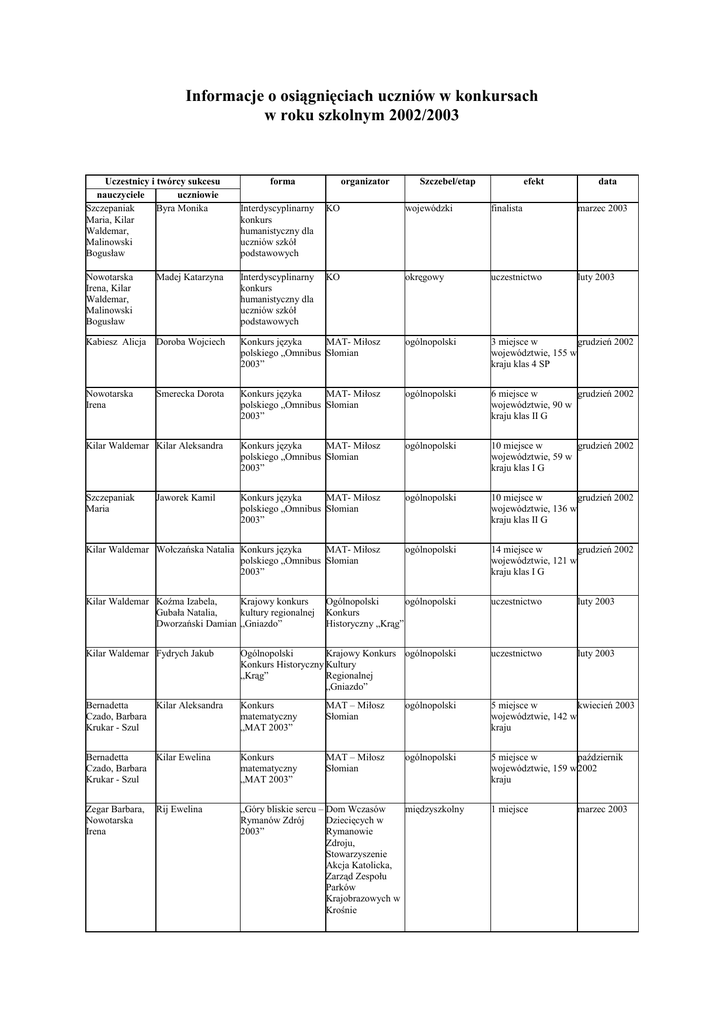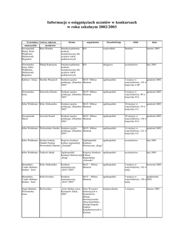 Informacje o osiągnięciach uczniów w konkursach w roku szkolnym 2002/2003 Uczestnicy i twórcy sukcesu nauczyciele uczniowie Szczepaniak Byra Monika Maria, Kilar Waldemar, Malinowski Bogusław Interdyscyplinarny konkurs humanistyczny dla uczniów szkół podstawowych KO wojewódzki finalista marzec 2003 Nowotarska Irena, Kilar Waldemar, Malinowski Bogusław Madej Katarzyna Interdyscyplinarny konkurs humanistyczny dla uczniów szkół podstawowych KO okręgowy uczestnictwo luty 2003 Kabiesz Alicja Doroba Wojciech Konkurs języka MAT- Miłosz polskiego „Omnibus Słomian 2003” ogólnopolski 3 miejsce w grudzień 2002 województwie, 155 w kraju klas 4 SP Nowotarska Irena Smerecka Dorota Konkurs języka MAT- Miłosz polskiego „Omnibus Słomian 2003” ogólnopolski 6 miejsce w grudzień 2002 województwie, 90 w kraju klas II G Kilar Waldemar Kilar Aleksandra Konkurs języka MAT- Miłosz polskiego „Omnibus Słomian 2003” ogólnopolski 10 miejsce w grudzień 2002 województwie, 59 w kraju klas I G Szczepaniak Maria Konkurs języka MAT- Miłosz polskiego „Omnibus Słomian 2003” ogólnopolski 10 miejsce w grudzień 2002 województwie, 136 w kraju klas II G Kilar Waldemar Wołczańska Natalia Konkurs języka MAT- Miłosz polskiego „Omnibus Słomian 2003” ogólnopolski 14 miejsce w grudzień 2002 województwie, 121 w kraju klas I G Jaworek Kamil forma Kilar Waldemar Koźma Izabela, Krajowy konkurs Gubała Natalia, kultury regionalnej Dworzański Damian „Gniazdo” organizator Szczebel/etap efekt data Ogólnopolski ogólnopolski Konkurs Historyczny „Krąg” uczestnictwo luty 2003 Kilar Waldemar Fydrych Jakub Ogólnopolski Krajowy Konkurs ogólnopolski Konkurs Historyczny Kultury „Krąg” Regionalnej „Gniazdo” uczestnictwo luty 2003 Bernadetta Kilar Aleksandra Czado, Barbara Krukar - Szul Konkurs matematyczny „MAT 2003” MAT – Miłosz Słomian ogólnopolski 5 miejsce w kwiecień 2003 województwie, 142 w kraju Bernadetta Kilar Ewelina Czado, Barbara Krukar - Szul Konkurs matematyczny „MAT 2003” MAT – Miłosz Słomian ogólnopolski 5 miejsce w październik województwie, 159 w 2002 kraju Zegar Barbara, Nowotarska Irena międzyszkolny „Góry bliskie sercu – Dom Wczasów Rymanów Zdrój Dziecięcych w 2003” Rymanowie Zdroju, Stowarzyszenie Akcja Katolicka, Zarząd Zespołu Parków Krajobrazowych w Krośnie Rij Ewelina 1 miejsce marzec 2003 Zegar Barbara, Nowotarska Irena Śliwka Ewa „Góry bliskie sercu – Dom Wczasów międzyszkolny Rymanów Zdrój Dziecięcych w 2003” Rymanowie Zdroju, Stowarzyszenie Akcja Katolicka, Zarząd Zespołu Parków Krajobrazowych w Krośnie 2 miejsce marzec 2003 Zegar Barbara, Nowotarska Irena Kosztyła Agnieszka „Góry bliskie sercu – Dom Wczasów międzyszkolny Rymanów Zdrój Dziecięcych w 2003” Rymanowie Zdroju, Stowarzyszenie Akcja Katolicka, Zarząd Zespołu Parków Krajobrazowych w Krośnie 2 miejsce marzec 2003 Chmiel Urszula Potasiewicz Grzegorz, Kwolek Jakub, Ziemba Maciej Ogólnopolski Turniej Komenda Miejska powiatowy Wiedzy o Policji w Krośnie Bezpieczeństwie Ruchu Drogowego 1 miejsce w gminie, 4 kwiecień 2003 miejsce w powiecie Zięba Agnieszka Zięba Izabela Konkurs wiedzy Zarząd Okręgu ekologicznej „Formy Podkarpackiego ochrony przyrody” Ligi Ochrony Przyrody” wojewódzki finalistka grudzień 2002 Zięba Agnieszka Kuzian Radosław Konkurs wiedzy Zarząd Okręgu ekologicznej „Formy Podkarpackiego ochrony przyrody” Ligi Ochrony Przyrody” regionalny uczestnictwo listopad 2002 Czado Bernadetta Kilar Aleksandra Konkurs Alfik Łowcy Talentów - ogólnopolski Matematyczny 2002 Jersz 13 miejsce w grudzień 2002 województwie klas I G Czado Bernadetta Kilar Maria Konkurs Alfik Łowcy Talentów - ogólnopolski Matematyczny 2002 Jersz 56 miejsce w grudzień 2002 województwie klas II G Szczepaniak Maria Doroba Joanna Konkurs Alfik Łowcy Talentów - ogólnopolski Humanistyczny 2002 Jersz 5 miejsce w grudzień 2002 województwie, 127 w kraju klas I G Nowotarska Irena Kilar Ewelina Konkurs Alfik Łowcy Talentów - ogólnopolski Humanistyczny 2002 Jersz 13 miejsce w grudzień 2002 województwie, 166 w kraju klas III G Niemczyk Maria Niemczyk Kamelia Konkurs Alfik Łowcy Talentów - ogólnopolski Humanistyczny 2002 Jersz 24 miejsce w grudzień 2002 województwie klas 3 SP Kabiesz Alicja Śliwka Anna Konkurs Alfik Łowcy Talentów - ogólnopolski Humanistyczny 2002 Jersz 18 miejsce w grudzień 2002 województwie, 292 w kraju klas 4 SP Nowotarska Irena Krukar Krzysztof Konkurs Alfik Łowcy Talentów - ogólnopolski Humanistyczny 2002 Jersz 26 miejsce w grudzień 2002 województwie klas II G Kabiesz Alicja Bolanowska Aleksandra Konkurs Alfik Łowcy Talentów - ogólnopolski Humanistyczny 2002 Jersz 27 miejsce w grudzień 2002 województwie klas 5 SP Szczepaniak Maria Rij Ewelina Konkurs Alfik Łowcy Talentów - ogólnopolski Humanistyczny 2002 Jersz 37 miejsce w grudzień 2002 województwie klas II G Kwolek Agnieszka, Szymanowska Alicja Jaworek Kamil Konkurs English High Flier 2002 Łowcy Talentów - ogólnopolski Jersz 7 miejsce w listopad 2002 województwie, 250 w kraju klas II G Kwolek Agnieszka, Penar Paulina Konkurs English High Flier 2002 Łowcy Talentów - ogólnopolski Jersz listopad 2002 9 miejsce w województwie, 465 w kraju klas 5 SP Kwolek Agnieszka, Szymanowska Alicja Kogut Paweł Konkurs English High Flier 2002 Łowcy Talentów - ogólnopolski Jersz 29 miejsce w listopad 2002 województwie klas II G Kwolek Agnieszka, Szymanowska Alicja Golowski Sylwester Konkurs English High Flier 2002 Łowcy Talentów - ogólnopolski Jersz 29 miejsce w województwie klas III G Kwolek Agnieszka, Szymanowska Alicja Kilar Aleksandra Konkurs English High Flier 2002 Łowcy Talentów - ogólnopolski Jersz 32 miejsce w listopad 2002 województwie klas I G Kwolek Agnieszka, Szymanowska Alicja Penar Natalia Konkurs English High Flier 2002 Łowcy Talentów - ogólnopolski Jersz 33 miejsce w listopad 2002 wojew