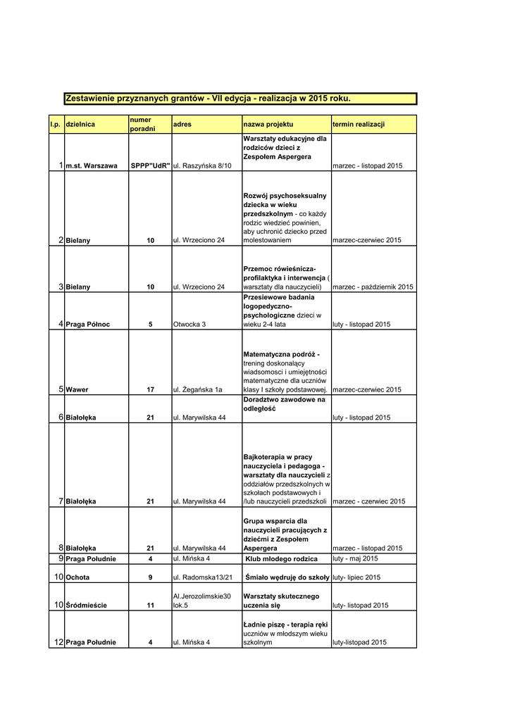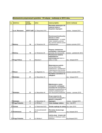 Zestawienie przyznanych grantów - VII edycja - realizacja w 2015 roku. l.p. dzielnica numer poradni adres nazwa projektu termin realizacji Warsztaty edukacyjne dla rodziców dzieci z Zespołem Aspergera 1 m.st. Warszawa 2 Bielany 3 Bielany 4 Praga Północ SPPP"UdR" ul. Raszyńska 8/10 10 10 5 marzec - listopad 2015 ul. Wrzeciono 24 Rozwój psychoseksualny dziecka w wieku przedszkolnym - co każdy rodzic wiedzieć powinien, aby uchronić dziecko przed molestowaniem marzec-czerwiec 2015 ul. Wrzeciono 24 Przemoc rówieśniczaprofilaktyka i interwencja ( warsztaty dla nauczycieli) marzec - październik 2015 Otwocka 3 Przesiewowe badania logopedycznopsychologiczne dzieci w wieku 2-4 lata luty - listopad 2015 5 Wawer 17 ul. Żegańska 1a 6 Białołęka 21 ul. Marywilska 44 Matematyczna podróż trening doskonalący wiadsomosci i umiejętności matematyczne dla uczniów klasy I szkoły podstawowej. marzec-czerwiec 2015 Doradztwo zawodowe na odległość luty - listopad 2015 ul. Marywilska 44 Bajkoterapia w pracy nauczyciela i pedagoga warsztaty dla nauczycieli z oddziałów przedszkolnych w szkołach podstawowych i /lub nauczycieli przedszkoli marzec - czerwiec 2015 21 ul. Marywilska 44 Grupa wsparcia dla nauczycieli pracujących z dziećmi z Zespołem marzec - listopad 2015 Aspergera 4 ul. Mińska 4 Klub młodego rodzica 10 Ochota 9 ul. Radomska13/21 Śmiało wędruję do szkoły luty- lipiec 2015 10 Śródmieście 11 Al.Jerozolimskie30 lok.5 Warsztaty skutecznego uczenia się ul. Mińska 4 Ładnie piszę - terapia ręki uczniów w młodszym wieku szkolnym luty-listopad 2015 7 Białołęka 8 Białołęka 9 Praga Południe 12 Praga Południe 21 4 luty - maj 2015 luty- listopad 2015 13 Praga Południe 16 14 Targówek 13 15 Targówek 13 15 Bemowo 20 17 Bemowo 20 18 Bemowo 20 19 Wola 20 Wola 21 Wola 22 Wola ZPPPnr1 2 2 2 ul. Siennicka Twórczy nauczyciel zdolny przedszkolakwarsztaty dla nauczycieli przedszkolnych luty-listopad 2015 Bez klapsa - jak z miłością i szacunkiem wyznaczać dziecku granice - warsztaty dla rodziców dzieci w wieku ul. Odrowąża 75 0-6 luty- marzec 2015 Rozumiem i wyrażam ul. Odrowąża 75 luty-czerwiec 2015 siebie poprzez sztukę Poznać i zrozumieć by pomóc. ul. Powstańców Śl. 17 marzec-czerwiec 2015 "Będę małym Pitagorasem"- zajęcia dla dzieci uzdolnionych ul. Powstańców Śl. 17 matematycznie "Elementarz zdrowego stylu życia" ul. Powstańców Śl. 17 Terapia ręki ul. Zawiszy 13 ul. Księcia Janusza 45/48 ul. Księcia Janusza 45/49 ul. Księcia Janusza 45/49 luty- czerwiec 2015 luty- czerwiec 2015 luty - październik 2015 Mistrz umysłu interaktywne zajęcia warsztatowe dla gimnazjalistów i licealistów z dysleksją rozwojową i uczniów, którzy mają trudności z koncentracją uwagi luty-listopad 2015 Udany Start luty - kwiecień 2015 Wychowanie bez klapsówwarsztaty psychoedukacyjne dla rodziców kwiecień- maj 2015