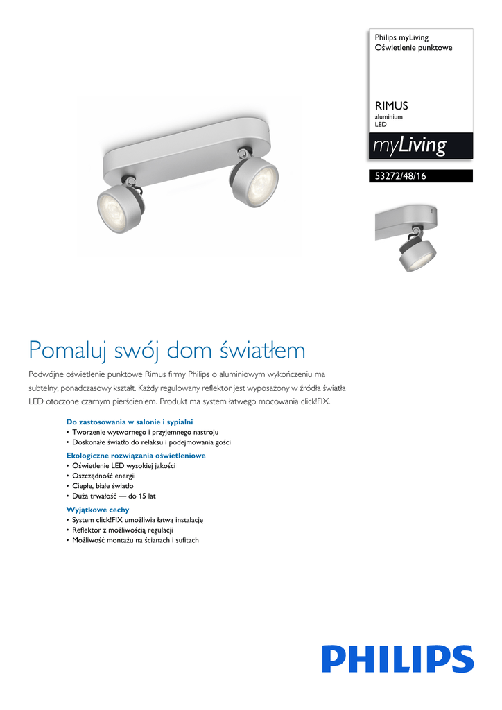 Philips myLiving Oświetlenie punktowe RIMUS aluminium LED myLiving 53272/48/16 Pomaluj swój dom światłem Podwójne oświetlenie punktowe Rimus firmy Philips o aluminiowym wykończeniu ma subtelny, ponadczasowy kształt. Każdy regulowany reflektor jest wyposażony w źródła światła LED otoczone czarnym pierścieniem. Produkt ma system łatwego mocowania click!FIX. Do zastosowania w salonie i sypialni • Tworzenie wytwornego i przyjemnego nastroju • Doskonałe światło do relaksu i podejmowania gości Ekologiczne rozwiązania oświetleniowe • Oświetlenie LED wysokiej jakości • Oszczędność energii • Ciepłe, białe światło • Duża trwałość — do 15 lat Wyjątkowe cechy • System click!FIX umożliwia łatwą instalację • Reflektor z możliwością regulacji • Możliwość montażu na ścianach i sufitach 532724816 Oświetlenie punktowe RIMUS aluminium, LED Zalety Oświetlenie LED wysokiej jakości Reflektor z możliwością regulacji światła, co pozwala zmniejszyć rachunki za prąd i przyczynia się do ochrony środowiska. Duża trwałość Technologia LED zastosowana w tej lampie firmy Philips to wyjątkowe rozwiązanie opracowane przez firmę Philips. Natychmiast się włącza, pozwala na uzyskanie optymalnej wydajności oświetlenia oraz podkreśla i ożywia kolory w Twoim domu. Skieruj światło w wybrane miejsce, obracając lub nachylając reflektor. System łatwego mocowania click!FIX Ciepłe, białe światło Światło może mieć różne temperatury barwowe oznaczane za pomocą jednostek zwanych kelwinami (K). Lampy o niskiej wartości kelwinów zapewniają ciepłe, bardziej przytulne światło, natomiast lampy o wysokiej wartości kelwinów dają chłodne, bardziej pobudzające światło. Ta lampa firmy Philips rzuca ciepłe, białe światło, które zapewnia przytulną atmosferę. Lampa LED wykorzystuje system click!FIX, czyli nowy, rewolucyjny system mocowania opatentowany przez firmę Philips. Korzystając z systemu click!FIX, można łatwo zamontować lampę w 4 prostych krokach. To proste i szybkie! Produkt godny zaufania. Trwałość wbudowanych źródeł światła LED wykorzystanych w tej lampie LED firmy Philips wynosi nawet 15 tysięcy godzin (co oznacza 15 lat w przypadku średniego użycia przez 3 godziny dziennie, przy co najmniej 13 000 włączeń i wyłączeń). Już nie musisz się martwić naprawą lub wymianą żarówki, ciesząc się doskonałym, nastrojowym oświetleniem w domu. Montaż na ścianie i suficie Oszczędność energii Tę lampę można zamontować na ścianie lub na suficie — w zależności od potrzeb. Ta energooszczędna lampa firmy Philips zużywa mniej energii niż tradycyjne źródła Tworzenie wytwornego nastroju Ta lampa została stworzona w oparciu o nowoczesne poczucie smaku, trendy i style życia. Doskonale wtapia się w wystrój wnętrza i pozwala stworzyć wymarzony, niepowtarzalny nastrój. 532724816 Oświetlenie punktowe RIMUS aluminium, LED Dane techniczne Stylistyka i wykończenie • Materiał: metal • Kolor: aluminium Dodatkowe funkcje/akcesoria w zestawie • • • • Wbudowane diody LED Precyzyjne wiązki światła Reflektor z możliwością regulacji System mocowania click!FIX Wymiary i waga produktu • • • • Wysokość: 9,5 cm Długość: 24,3 cm Szerokość: 7,0 cm Waga netto: 0,640 kg • Kąt rozsyłu: 50° • Łączna moc strumienia świetlnego oprawy w lumenach: 330 lm • Oprawa z możliwością przyciemniania: Nie • LED • Współczynnik IP: IP20, ochrona przed przedmiotami powyżej 12,5 mm, brak ochrony przed wodą • Klasa ochronności: I — uziemienie • Źródło światła odpowiadające tradycyjnej żarówce o mocy: 35 W Serwis • Gwarancja: 2 lata Wymiary i waga opakowania Dane techniczne • Zasilanie sieciowe: Przedział 220–240 V, 50–60 Hz • Technologia źródła światła: LED, Bezpieczne, bardzo niskie napięcie • Liczba źródeł światła: 2 • Moc źródła światła w zestawie: 3 W • Barwa światła: ciepła biel • Maksymalna trwałość źródła światła: 15 000 godz. • • • • Wysokość: 24,8 cm Długość: 9,3 cm Szerokość: 7,3 cm Waga: 0,690 kg Różne • Opracowano z myślą o: Salon i sypialnia • Styl: Nowoczesne • Typ: Oświetlenie punktowe • Data wydania 2015-08-27 © 2015 Koninklijke Philips N.V. Wszelkie prawa zastrzeżone. Wersja: 1.0.1 Dane techniczne mogą ulec zmianie bez powiadomienia. Znaki towarowe są własnością Koninklijke Philips N.V. lub własnością odpowiednich firm. 12 NC: 9150 043 34901 EAN: 87 18291 48854 5 www.philips.com
