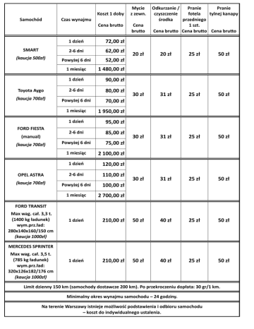 Koszt 1 doby Samochód Czas wynajmu Cena brutto 1 dzień 72,00 zł SMART 2-6 dni 62,00 zł (kaucja 500zł) Powyżej 6 dni 52,00 zł 1 miesiąc 90,00 zł Toyota Aygo 2-6 dni 80,00 zł (kaucja 700zł) Powyżej 6 dni 70,00 zł 1 miesiąc (manual) (kaucja 700zł) 95,00 zł 2-6 dni 85,00 zł Powyżej 6 dni 75,00 zł 20 zł 25 zł 50 zł 30 zł 31 zł 25 zł 50 zł 30 zł 31 zł 25 zł 50 zł 30 zł 31 zł 25 zł 50 zł 2 100,00 zł 1 dzień 120,00 zł OPEL ASTRA 2-6 dni 110,00 zł (kaucja 700zł) Powyżej 6 dni 100,00 zł 1 miesiąc 20 zł 1 950,00 zł 1 dzień 1 miesiąc Cena brutto Odkurzanie / Pranie Pranie czyszczenie fotela tylnej kanapy środka przedniego 1 szt. Cena brutto Cena brutto Cena brutto 1 480,00 zł 1 dzień FORD FIESTA Mycie z zewn. 2 700,00 zł FORD TRANSIT Max wag. cał. 3,3 t. (1400 kg ładunek) wym.prz.ład: 280x140x160/150 cm (kaucja 1000zł) 1 dzień 210,00 zł 50 zł 40 zł 25 zł 50 zł 1 dzień 210,00 zł 50 zł 40 zł 25 zł 50 zł MERCEDES SPRINTER Max wag. cał. 3,5 t. (785 kg ładunek) wym.prz.ład: 320x126x182/176 cm (kaucja 1000zł) Limit dzienny 150 km (samochody dostawcze 200 km). Po przekroczeniu dopłata: 30 gr/1 km. Minimalny okres wynajmu samochodu – 24 godziny. Na terenie Warszawy istnieje możliwość podstawienia i odbioru samochodu – koszt do indywidualnego ustalenia.