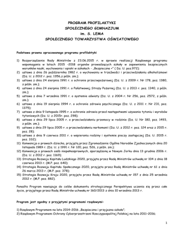 PROGRAM PROFILAKTYKI SPOŁECZNEGO GIMNAZJUM im. S. LEMA SPOŁECZNEGO TOWARZYSTWA OŚWIATOWEGO Podstawa prawna opracowanego programu profilaktyki 1) Rozporządzenie Rady Ministrów z 23.06.2015 r. w sprawie realizacji Rządowego programu wspomagania w latach 2015 -2018 organów prowadzących szkoły w zapewnieniu bezpiecznych warunków nauki, wychowania i opieki w szkołach - „Bezpieczna +” ( Dz. U. poz.972); 2) ustawa z dnia 26 października 1982 r. o wychowaniu w trzeźwości i przeciwdziałaniu alkoholizmowi (Dz. U. z 2012 r. poz. 1356,z późn. zm.); 3) ustawa z dnia 24 sierpnia 1991 r. o ochronie przeciwpożarowej (Dz. U. z 2009 r. Nr 178, poz. 1380, z późn. zm.); 4) ustawa z dnia 24 sierpnia 1991 r. o Państwowej Straży Pożarnej (Dz. U. z 2013 r. poz. 1340, z późn. zm.); 5) ustawa z dnia 7 września 1991 r. o systemie oświaty (Dz. U. z 2004 r. Nr 256, poz. 2572, z późn. zm.); 6) ustawa z dnia 19 sierpnia 1994 r. o ochronie zdrowia psychicznego (Dz. U. z 2011 r. Nr 231, poz. 1375); 7) ustawa z dnia 9 listopada 1995 r. o ochronie zdrowia przed następstwami używania tytoniu i wyrobów tytoniowych (Dz. U. z 2015r. poz. 298); 8) ustawa z dnia 29 lipca 2005 r. o przeciwdziałaniu przemocy w rodzinie (Dz. U. Nr 180, poz. 1493, z późn. zm.); 9) ustawa z dnia 29 lipca 2005 r. o przeciwdziałaniu narkomanii (Dz. U. z 2012 r. poz. 124 oraz z 2015 r. poz. 28); 10) ustawa z dnia 9 czerwca 2011 r. o wspieraniu rodziny i systemie pieczy zastępczej (Dz. U. 2015 r. poz. 332); 11) Konwencja o prawach dziecka, przyjętą przez Zgromadzenie Ogólne Narodów Zjednoczonych dnia 20 listopada 1989 r. (Dz. U. z 1991 r. Nr 120, poz. 526, z późn. zm.); 12) Konwencja o prawach osób niepełnosprawnych, sporządzoną w Nowym Jorku dnia 13 grudnia 2006 r. (Dz. U. z 2012 r. poz. 1169); 13) Strategia Rozwoju Kapitału Ludzkiego 2020, przyjęta przez Radę Ministrów uchwałą nr 104 z dnia 18 czerwca 2013 r. (M.P. poz. 640); 14) Strategia Rozwoju Kapitału Społecznego 2020, przyjęta przez Radę Ministrów uchwałą nr 61 z dnia 26 marca 2013 r. (M.P. poz. 378); 15) Strategia Rozwoju Kraju 2020, przyjęta przez Radę Ministrów uchwałą nr 157 z dnia 25 września 2012 r. (M.P. poz. 882). Ponadto Program nawiązuje do celów dokumentu strategicznego Perspektywa uczenia się przez całe życie, przyjętego przez Radę Ministrów uchwałą nr 160/2013 z dnia 10 września 2013 r. Program jest zgodny z przyjętymi programami rządowymi: 1) Rządowym Programem na lata 2014–2016 „Bezpieczna i przyjazna szkoła”; 2) Rządowym Programem Ochrony Cyberprzestrzeni Rzeczypospolitej Polskiej na lata 2011–2016; 1 3) Krajowym Programem Przeciwdziałania Narkomanii na lata 2011–2016; 4) Krajowym Programem Działań Na Rzecz Równego Traktowania na lata 2013–2016; 5) Rządowym Programem ograniczania przestępczości i aspołecznych zachowań „Razem bezpieczniej”; 6) Narodowym Programem Ochrony Zdrowia Psychicznego; 7) Krajowym Programem Przeciwdziałania Przemocy w Rodzinie; 8) Programem Ograniczenia Zdrowotnych Następstw Palenia Tytoniu w Polsce; 9) Programem Operacyjnym Polska Cyfrowa 2014–2020. Cele przyjęte w programie: 1. 2. 3. 4. 5. 6. 7. 8. 9. Zwiększenie otwartości szkoły na współpracę z rodzicami i otoczeniem. Podnoszenie szkolnych standardów bezpieczeństwa. Budowanie pozytywnego klimatu szkoły. Podnoszenie kompetencji związanych z bezpieczeństwem przeciwpożarowym. Podnoszenie umiejętności konstruktywnego wykorzystywania technologii informacyjno komunikacyjnych. Upowszechnienie wiedzy o zasadach postępowania w sytuacjach kryzysowych. Promowanie zdrowego stylu życia wśród dzieci i młodzieży. Zapobieganie zachowaniom problemowym uczniów. Profilaktyka uzależnienia od dopalaczy, środków psychoaktywnych, narkotyków, nikotyny i alkoholu. Pożądane efekty wprowadzenia nowego programu profilaktyki: 1. 2. 3. 4. 5. Uczeń jest kompetentny – zna i rozumie problemy szkolne i środowiska pozaszkolnego, w tym rozpoznaje i reaguje na nieprawidłowości. Uczeń trzyma się zasad – w swoim postępowaniu kieruje się szczerością, uczciwością i wierny jest ideałom. Uczeń dba o swój rozwój – rozumie znaczenie intelektualnej, fizycznej i psychicznej równowagi w dążeniu do dorosłości. Odrzuca wszelkiego rodzaju używki, w tym dopalacze i substancje psychoaktywne, promuje ich szkodliwość i prawidłowo reaguje w przypadku kontaktu z narkotykiem. Uczeń wykazuje się krytyczną refleksją - ocenia i rozumie swoje mocne strony, jak i słabości. Rozpoznaje sygnały organizmu – na zmęczenie i stres – potrafi konstruktywnie organizować pracę i wypoczynek. Uczeń jest wrażliwy - kieruje się empatią, szacunkiem i tego samego wymaga dla siebie. Swoją postawą otwiera się na środowisko i korzysta z jego możliwości- neguje agresję, przemoc, wulgaryzmy. Program poddawany będzie ewaluacji aby przyczynić się do podnoszenia jego skuteczności. Decydującym będzie głos całej społeczności szkolnej tj. uczniów, wychowawców, nauczycieli, psychologa szkolnego, rodziców i instytucji współpracujących. Opracowując niniejszy program oparto się na: 1. Wywiadach indywidualnych na temat higieny psychicznej dzieci i młodzieży całego środowiska. 2. Określeniu stopnia zagrożenia uczniów zjawiskiem uzależnienia od dopalaczy, środków psychoaktywnych, narkotyków, nikotyny - współpraca z rodzicami, psychologiem szkolnym. 3. Ewaluacji pracy opiekuńczo wychowawczej podczas Rad Pedagogicznych. 4. Współpracy z instytucjami działającymi na rzecz rozwoju dzieci i młodzieży. 2 5. Spotkaniach klasowych z rodzicami uczniów – analizie ich obserwacji, uwag i zaleceń. Program obejmuje następujące działy: 1. 2. 3. 4. 5. 6. Przeciwdziałanie używaniu dopalaczy, substancji psychoaktywnych, nikotyny i alkoholu oraz profilaktykę uzależnienia od gier komputerowych, internetu, oraz hazardu. Promowanie cyberprzestrzeni w środowisku jako bezpieczneg
