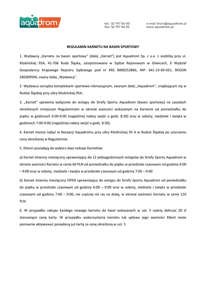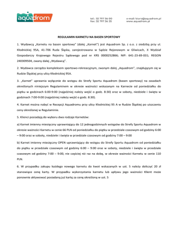 REGULAMIN KARNETU NA BASEN SPORTOWY 1. Wydawcą „Karnetu na basen sportowy” (dalej „Karnet”) jest Aquadrom Sp. z o.o. z siedzibą przy ul. Kłodnickiej 95A, 41-706 Ruda Śląska, zarejestrowana w Sądzie Rejonowym w Gliwicach, X Wydział Gospodarczy Krajowego Rejestru Sądowego pod nr KRS 0000252866; NIP: 641-23-69-031; REGON 240309504, zwany dalej „Wydawcą”. 2. Wydawca zarządza kompleksem sportowo-rekreacyjnym, zwanym dalej „Aquadrom”, znajdującym się w Rudzie Śląskiej przy ulicy Kłodnickiej 95A. 3. „Karnet” uprawnia wyłącznie do wstępu do Strefy Sportu Aquadrom (basen sportowy) na zasadach określonych niniejszym Regulaminem w okresie ważności wskazanym na Karnecie od poniedziałku do piątku w godzinach 6:00-9:00 (najpóźniej należy wejść o godz. 8:30) oraz w soboty, niedziele i święta w godzinach 7:00-9:00 (najpóźniej należy wejść o godz. 8:30). 4. Karnet można nabyć w Recepcji Aquadromu przy ulicy Kłodnickiej 95 A w Rudzie Śląskiej po uiszczeniu ceny określonej w Regulaminie. 5. Klienci posiadają do wyboru dwa rodzaje Karnetów: a) Karnet imienny miesięczny uprawniający do 12 jednogodzinnych wstępów do Strefy Sportu Aquadrom w okresie ważności Karnetu w cenie 66 PLN od poniedziałku do piątku w przedziale czasowym od godziny 6:00 – 9:00 oraz w soboty, niedziele i święta w przedziale czasowym od godziny 7:00 – 9:00 b) Karnet imienny miesięczny OPEN uprawniający do wstępu do Strefy Sportu Aquadrom od poniedziałku do piątku w przedziale czasowym od godziny 6:00 – 9:00 oraz w soboty, niedziele i święta w przedziale czasowym od godziny 7:00 – 9:00, nie częściej niż raz na dobę, w okresie ważności Karnetu w cenie 110 PLN. 6. W przypadku zakupu każdego nowego karnetu do kwot wskazanych w ust. 5 należy doliczyć 20 zł stanowiące cenę karty. W przypadku wykorzystania karnetu lub upływu jego ważności Klient może ponownie aktywować posiadaną już kartę za cenę określoną w ust. 5 7. Przekroczenie czasu korzystania, a także korzystanie z innych usług Wystawcy niż wstęp do Strefy Sportu, w tym przejście do innej Strefy, powoduje konieczność zapłaty za świadczone przez Wystawcę usługi zgodnie z cennikiem Wystawcy. 8. Karnet jest ważny 1 miesiąc od momentu jego aktywacji dokonanej podczas zakupu Karnetu. 9. Cena uiszczona za Karnet nie podlega zwrotowi a nadto niewykorzystana w ramach nabytego Karnetu wartość usług nie podlega wymianie na środki pieniężne, w przypadku niewykorzystania Karnetu w okresie jego ważności. 10. Ryzyko utraty lub uszkodzenia karty przechodzi na Klienta z chwilą jej wydania, w związku z czym po jej wydaniu Klientowi nie przysługują żadne roszczenia wobec Wydawcy z tytułu utraty lub uszkodzenia karty. W przypadku utraty lub uszkodzenia karty Klient, aby skorzystać z pozostałych na karcie wejść lub wykorzystać karnet do końca okresu ważności, może otrzymać nową kartę na niewykorzystane wejścia po uiszczeniu ceny karty określonej w ust. 6. 11. Nabywca karnetu przyjmuje do wiadomości i wyraża zgodę na to, iż Zarządzający (Wydawca) może czasowo ograniczyć wejście Klientów do Aquadromu z powodu osiągnięcia maksymalnej ilości osób korzystających. 12. Aquadrom nie gwarantuje dostępu do każdej strefy, atrakcji i urządzeń w każdym czasie, w szczególności z powodu konieczności prowadzenia remontów lub konserwacji, względnie wykorzystania poszczególnych stref lub atrakcji dla dedykowanych zajęć. Każda osoba zamierzająca korzystać z Aquadromu może uzyskać informację o zakresie usług świadczonych w danym czasie bądź występujących w tej mierze ograniczeń, a decyzje co do korzystania z Aquadromu podejmuje na własne ryzyko. 13. Nabywca przyjmuje do wiadomości i akceptuje, że korzystając z Karnetu zobowiązany jest do przestrzegania oraz podlegania ograniczeniom przewidzianym w Regulaminie korzystania z Aquadromu dostępnym w recepcji Aquadromu oraz na stronie internetowej Aquadromu. 14. Reklamacje dotyczące usługi rozpatrywane będą w terminie 14 dni od daty złożenia reklamacji w Biurze Obsługi Klienta (BOK) znajdującym się w Aquadromie. 15. Regulamin dostępny jest w recepcji Aquadromu oraz na stronie internetowej Aquadromu www.aquadrom.pl