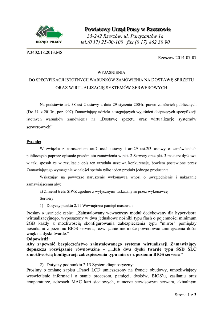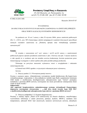 PPoow wiiaattoow wyy U Urrzząądd PPrraaccyy w wR Rzzeesszzoow wiiee 35-242 Rzeszów, ul. Partyzantów 1a tel.(0 17) 25-00-100 fax (0 17) 862 30 90 P.3402.18.2013.MS Rzeszów 2014-07-07 WYJAŚNIENIA DO SPECYFIKACJI ISTOTNYCH WARUNKÓW ZAMÓWIENIA NA DOSTAWĘ SPRZĘTU ORAZ WIRTUALIZACJĘ SYSTEMÓW SERWEROWYCH Na podstawie art. 38 ust 2 ustawy z dnia 29 stycznia 2004r. prawo zamówień publicznych (Dz. U. z 2013r., poz. 907) Zamawiający udziela następujących wyjaśnień dotyczących specyfikacji istotnych warunków zamówienia na „Dostawę sprzętu oraz wirtualizację systemów serwerowych” Pytanie: W związku z naruszeniem art.7 ust.1 ustawy i art.29 ust.2i3 ustawy o zamówieniach publicznych poprzez opisanie przedmiotu zamówienia w pkt. 2 Serwery oraz pkt. 3 macierz dyskowa w taki sposób że w rezultacie opis ten utrudnia uczciwą konkurencję, bowiem postawione przez Zamawiającego wymagania w całości spełnia tylko jeden produkt jednego producenta. Wskazując na powyższe naruszenie wykonawca wnosi o uwzględnienie i nakazanie zamawiającemu aby: a) Zmienił treść SIWZ zgodnie z wytycznymi wskazanymi przez wykonawcę Serwery 1) Dotyczy punktu 2.11 Wewnętrzna pamięć masowa : Prosimy o usunięcie zapisu: „Zainstalowany wewnętrzny moduł dedykowany dla hypervisora wirtualizacyjnego, wyposażony w dwa jednakowe nośniki typu flash o pojemności minimum 2GB każdy z możliwością skonfigurowania zabezpieczenia typu "mirror" pomiędzy nośnikami z poziomu BIOS serwera, rozwiązanie nie może powodować zmniejszenia ilości wnęk na dyski twarde.” Odpowiedź: Aby zapewnić bezpieczeństwo zainstalowanego systemu wirtualizacji Zamawiający dopuszcza rozwiązanie równoważne – „...lub dwa dyski twarde typu SSD SLC z możliwością konfiguracji zabezpieczenia typu mirror z poziomu BIOS serwera” 2) Dotyczy podpunktu 2.13 System diagnostyczny: Prosimy o zmianę zapisu „Panel LCD umieszczony na froncie obudowy, umożliwiający wyświetlenie informacji o stanie procesora, pamięci, dysków, BIOS’u, zasilaniu oraz temperaturze, adresach MAC kart sieciowych, numerze serwisowym serwera, aktualnym Strona 1 z 3 zużyciu energii, nazwie serwera, modelu serwera.” Na zapis „ Powinien posiadać wizualny lub dźwiękowy system diagnostyczny” Prosimy o usunięcie zapisu „Wbudowany czujnik otwarcia obudowy współpracujący z BIOS i kartą zarządzającą” Odpowiedź: Zamawiający zmienia wymóg : Panel diagnostyczny umieszczony na froncie obudowy, umożliwiający wyświetlenie informacji o stanie procesora, pamięci, dysków, BIOS’u, zasilaniu oraz temperaturze, adresach MAC kart sieciowych, numerze serwisowym serwera, aktualnym zużyciu energii, nazwie serwera, modelu serwera. Zamawiający dopuszcza rozwiązanie równoważne do czujnika otwarcia obudowy – jednak aby zachować poziom bezpieczeństwa wymaga aby serwer został dostarczony z oprogramowaniem umożliwiającym monitorowanie zmian konfiguracji sprzętowej – min. procesorów, dysków twardych, pamięci RAM 3) Dotyczy podpunktu 2.13 Sloty PCI Express: Prosimy o zmianę zapisu:”2.6.1. minimum dwa sloty x16 generacji 3 połowy wysokości 2.6.2. minimum jeden slot x8 połowy wysokości’ na „ minimum 3 sloty PCI Express x8 połowy wysokości oraz minimum 1 slot PCI Express x16 połowy wysokości” Odpowiedź: Zamawiający dopuszcza serwer wyposażony w min. 3 sloty PCI Express x8 połowy wysokości oraz min. 1 slot PCI Express x 16 połowy wysokości” 4) Dotyczy podpunktu 2.9 Interfejsy Sieciowe: Prosimy o usunięcie zapisu „interfejsy sieciowe nie mogą zajmować żadnego z dostępnych slotów PCI Express.” Odpowiedź: Zamawiający dopuszcza aby interfejsy sieciowe były instalowane w postaci karty PCI Express jednak serwer musi być wyposażony w taką ilość slotów aby zainstalowanie dodatkowych kart nie zmniejszyło ilości slotów wymaganych w pkt. 2.6 Sloty PCI Express które muszą pozostać wolne do przyszłej rozbudowy. 5) Dotyczy podpunktu 2.17 Zarządzanie: Prosimy o usunięcie zapisu 2.17.17 tj. „Możliwość rozbudowy funkcjonalności karty o automatyczne przywracanie ustawień serwera, kart sieciowych, BIOS, wersji firmware w przypadku awarii i wymiany któregoś z komponentów ze zintegrowanej na karcie zarządzającej pamięci flash(w tym kontrolera RAID, kart sieciowych, płyty głównej).” Odpowiedź: Zamawiający dopuszcza rozwianie równoważne - serwer musi posiadać rozwiązanie programowe umożliwiające zapisywanie na wewnętrznej pamięci serwera (np. dyskach twardych) danych o aktualnej konfiguracji serwera z możliwością ich odczytu w przypadku awarii któregoś z komponentów sprzętowych. Strona 2 z 3 Macierz 1) Prosimy o usunięcie zapisu 3.1 Obudowa „Posiadająca dodatkowy przedni panel zamykany na klucz chroniący dyski twarde przed nieuprawnionym wyjęciem z macierzy.” Odpowiedź: Zamawiający ze względów bezpieczeństwa nie przewiduje zmian w opisie przedmiotu zamówienia Powyższe wyjaśnienia zostaną zamieszczone na stronie internetowej Zamawiającego, oraz zostaną niezwłocznie doręczone Wykonawcom, którzy nabyli specyfikację istotnych warunków zamówienia i będą stanowić jej integralną część. Strona 3 z 3