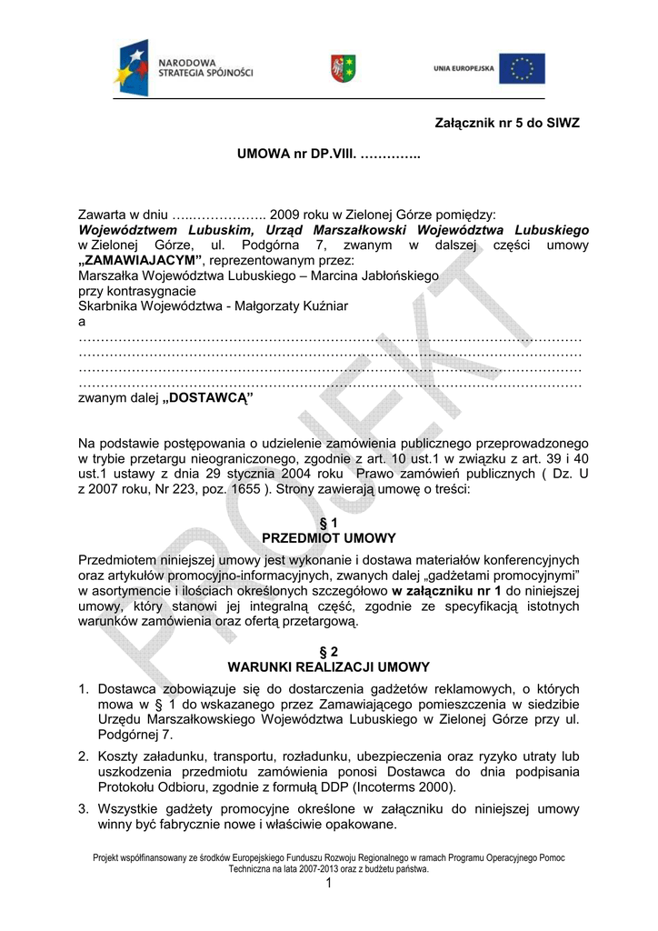 Załącznik nr 5 do SIWZ UMOWA nr DP.VIII. ………….. Zawarta w dniu …..…………….. 2009 roku w Zielonej Górze pomiędzy: Województwem Lubuskim, Urząd Marszałkowski Województwa Lubuskiego w Zielonej Górze, ul. Podgórna 7, zwanym w dalszej części umowy „ZAMAWIAJACYM”, reprezentowanym przez: Marszałka Województwa Lubuskiego – Marcina Jabłońskiego przy kontrasygnacie Skarbnika Województwa - Małgorzaty Kuźniar a …………………………………………………………………………………………………… …………………………………………………………………………………………………… …………………………………………………………………………………………………… …………………………………………………………………………………………………… zwanym dalej „DOSTAWCĄ” Na podstawie postępowania o udzielenie zamówienia publicznego przeprowadzonego w trybie przetargu nieograniczonego, zgodnie z art. 10 ust.1 w związku z art. 39 i 40 ust.1 ustawy z dnia 29 stycznia 2004 roku Prawo zamówień publicznych ( Dz. U z 2007 roku, Nr 223, poz. 1655 ). Strony zawierają umowę o treści: §1 PRZEDMIOT UMOWY Przedmiotem niniejszej umowy jest wykonanie i dostawa materiałów konferencyjnych oraz artykułów promocyjno-informacyjnych, zwanych dalej „gadŜetami promocyjnymi” w asortymencie i ilościach określonych szczegółowo w załączniku nr 1 do niniejszej umowy, który stanowi jej integralną część, zgodnie ze specyfikacją istotnych warunków zamówienia oraz ofertą przetargową. §2 WARUNKI REALIZACJI UMOWY 1. Dostawca zobowiązuje się do dostarczenia gadŜetów reklamowych, o których mowa w § 1 do wskazanego przez Zamawiającego pomieszczenia w siedzibie Urzędu Marszałkowskiego Województwa Lubuskiego w Zielonej Górze przy ul. Podgórnej 7. 2. Koszty załadunku, transportu, rozładunku, ubezpieczenia oraz ryzyko utraty lub uszkodzenia przedmiotu zamówienia ponosi Dostawca do dnia podpisania Protokołu Odbioru, zgodnie z formułą DDP (Incoterms 2000). 3. Wszystkie gadŜety promocyjne określone w załączniku do niniejszej umowy winny być fabrycznie nowe i właściwie opakowane. Projekt współfinansowany ze środków Europejskiego Funduszu Rozwoju Regionalnego w ramach Programu Operacyjnego Pomoc Techniczna na lata 2007-2013 oraz z budŜetu państwa. 1 4. W przypadku gadŜetów promocyjnych, dla których określa się termin gwarancji ich uŜycia, terminy te muszą wynosić co najmniej 12 miesięcy, licząc od dnia ich odbioru. 5. Dostawa gadŜetów promocyjnych będzie zrealizowana do dnia 30 października 2009 r. 6. Niedotrzymanie przez Dostawcę terminu, o którym mowa w ust. 5 uprawnia Zamawiającego do odstąpienia od umowy bez odszkodowania. 7. Przekazanie przedmiotu umowy nastąpi na podstawie Protokołu Odbioru, podpisanego przez przedstawicieli Zamawiającego i Dostawcy. W imieniu Zamawiającego odbioru przedmiotu zamówienia dokona: Wojciech Lubiński – inspektor w Departamencie Rozwoju Regionalnego i Planowania Przestrzennego. 8. W przypadku stwierdzenia, Ŝe dostarczone gadŜety promocyjne: 1) jakościowo nie spełniają wymogów określonych przez Zamawiającego w specyfikacji istotnych warunków zamówienia, 2) są niezgodne ilościowo lub asortymentowo ze złoŜonym zamówieniem lub są niekompletne, 3) posiadają ślady uszkodzenia lub są wadliwe, Zamawiający odmówi ich odbioru i wstrzyma się z podpisaniem Protokołu Odbioru, aŜ do momentu ich wymiany. 9. Dostawca zobowiązany jest do dostarczenia gadŜetów promocyjnych wolnych od wad lub uzupełnienia ich braków na swój koszt, w terminie 2 dni od dnia zawiadomienia przez Zamawiającego o zastrzeŜeniach dotyczących zamówionych artykułów. Procedura czynności odbioru zostanie powtórzona. §3 ZASADY ROZLICZEŃ 1. Z tytułu naleŜytego wykonania przedmiotu umowy, o którym mowa w § 1, Zamawiający zapłaci Dostawcy, zgodnie ze złoŜoną ofertą cenę w wysokości ………………… zł. netto, powiększoną o podatek VAT tj. kwota …………………. zł, cena brutto wyniesie …………………… zł (słownie złotych: …………………………………………………………………………………………….). 2. Cena, o której mowa w ust. 1, obejmuje koszty dostawy i transportu poniesione przez Dostawcę. 3. Zapłata naleŜności nastąpi po dostarczeniu wszystkich gadŜetów promocyjnych zgodnie z przedmiotem umowy określonym w § 1 umowy i podpisaniu Protokołu Odbioru dostarczonych gadŜetów promocyjnych bez uwag i zastrzeŜeń. Projekt współfinansowany ze środków Europejskiego Funduszu Rozwoju Regionalnego w ramach Programu Operacyjnego Pomoc Techniczna na lata 2007-2013 oraz z budŜetu państwa. 2 §4 WARUNKI PŁATNOŚCI 1. Zapłata za dostarczone gadŜety promocyjne nastąpi w formie przelewu bankowego na konto Dostawcy wskazane na fakturze w terminie 21 dni od dnia otrzymania przez Zamawiającego prawidłowo wystawionej faktury VAT. Faktura moŜe być wystawiona po otrzymaniu przez Dostawcę Protokołu Odbioru stwierdzającego odbiór gadŜetów promocyjnych bez wad, uwag i zastrzeŜeń. 2. Za dzień dokonania płatności przyjmuje się dzień obciąŜenia rachunku Zamawiającego. 3. W przypadku zwłoki w płatności Dostawca na prawo naliczyć odsetki w wysokości ustawowej. 4. Zamawiający jest uprawniony do potrącenia naliczonych kar umownych z ceny naleŜnej Dostawcy. 5. Dostawca ma prawo wystawienia faktury VAT bez podpisu Zamawiającego. §5 ODPOWIEDZIALNOŚĆ ZA NIEWŁAŚCIWE WYKONANIE UMOWY, KARY UMOWNE 1. Dostawca ponosi odpowiedzialność za niewykonanie lub nienaleŜyte wykonanie przedmiotu umowy. 2. Dostawca ponosi wobec Zamawiającego pełną odpowiedzialność za wyrządzone szkody, będące następstwem nienaleŜytego wykonania czynności objętych niniejszą umową, ocenianego w gra