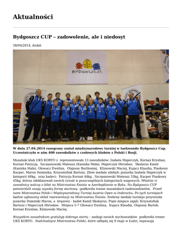 Aktualności Bydgoszcz CUP – zadowolenie, ale i niedosyt 28/04/2014, dodał: W dniu 27.04.2014 rozegrany został międzynarodowy turniej w taekwondo Bydgoszcz Cup. Uczestniczyło w nim 400 zawodników z czołowych klubów z Polski i Rosji. Mszański klub UKS KORYO z reprezentowało 13 zawodników: Izabela Majerczyk, Kornaś Krystian, Kornaś Patrycja, Szczęsnowski Mateusz (Kasinka Mała), Majerczyk Mirosław, Skolarus Kamil (Kasinka Mała), Głowacz Ewelina, Olajossy Bartłomiej, Klimowski Maciej, Kujacz Klaudia, Piaskowy Kacper, Maron Dominika, Krzysztofiak Bartosz. Złote medale zdobyli: juniorka Izabela Majerczyk w kategorii 46kg. oraz kadeci: Patrycja Kornaś 44kg , Szczęsnowski Mateusz 33kg, Kacper Piaskowy 45kg, którzy zdeklasowali swoich rywali w poszczególnych kategoriach wagowych. Właśnie ci zawodnicy walczą o bilet na Mistrzostwa Świata w Azerbejdżanie w Baku. Na Bydgoszcz CUP potwierdzili swoją wysoką formę startową –podkreśla trener mszańskich taekwondzistów. Przed nami Mistrzostwa Polski i Międzynarodowy Turniej Austria Open w Insbrucku. Po tych turniejach będzie ogłoszony skład reprezentacji na Mistrzostwa Świata. Srebrny medalz turnieju przywiozła juniorka Dominiki Maron, a brązowy - kadet Kamil Skokarus. Piąte miejsce zajęli: Krzysztofiak Bartosz i Majerczyk Mirosław. Miejsca 5-7 Głowacz Ewelina, Kujacz Klaudia, Olajossy Bartek, Kornaś Krystian, Klimowski Maciej. Wszystkim zawodnikom gratuluję dobrego startu – zasługi swoich wychowanków podkreśla trener UKS KORYO. Nadchodzące Mistrzostwa Polski, które odbędą się 9 maja w Łodzi, napawają optymizmem lecz czeka nas bardzo ciężka praca przez weekend majowy, by skorygować błędy, które wykluczyły nas o walkę o medal w Bydgoszczy. red. Zbigniew Karpierz
