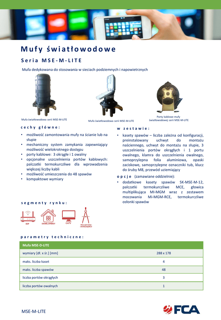Mufy światłowodowe Seria MSE-M-LITE Mufa dedykowana do stosowania w sieciach podziemnych i napowietrznych Mufa światłowodowa serii MSE-M-LITE Mufa światłowodowa serii MSE-M-LITE Porty kablowe mufy światłowodowej serii MSE-M-LITE cechy główne: w zestawie: • • • • • • • możliwość zamontowania mufy na ścianie lub na słupie mechaniczny system zamykania zapewniający możliwość wielokrotnego dostępu porty kablowe: 3 okrągłe i 1 owalny opcjonalne uszczelnienia portów kablowych: palczatki termokurczliwe dla wprowadzenia większej liczby kabli możliwość umieszczenia do 48 spawów kompaktowe wymiary segmenty rynku: kasety spawów – liczba zależna od konfiguracji, preinstalowany uchwyt do montażu naściennego, uchwyt do montażu na słupie, 3 uszczelnienia portów okrągłych i 1 portu owalnego, klamra do uszczelnienia owalnego, samoprzylepna folia aluminiowa, opaski zaciskowe, samoprzylepne oznaczniki tub, klucz do śruby M8, przewód uziemiający o p c j e (zamawiane oddzielnie): • dodatkowe kasety spawów SK-MSE-M-12, palczatki termokurczliwe MCE, głowica multiplikująca MI-MGM wraz z zestawem mocowania Mi-MGM-RCE, termokurczliwe osłonki spawów parametry techniczne: Mufa MSE-D-LITE wymiary [dł. x śr.] [mm] 288 x 178 maks. liczba kaset 4 maks. liczba spawów 48 liczba portów okrągłych 3 liczba portów owalnych 1 MSE-M-LITE Mufa MSE-D-LITE maksymalna liczba wprowadzanych kabli:* dla kabli 3 – 8 mm 12 dla kabli 5 – 9 mm 9 waga [kg] 1,95 – 2,25 stopień szczelności IP 66 wykonanie tworzywo ABS *przy wykorzystaniu palczatek termokurczliwych MCE konfiguracja: 0 1 opis mufa światłowodowa MSE-M-48K12-KPL-LITE konfiguracja dla 12 spawów K24-KPL-LITE konfiguracja dla 24 spawów K36-KPL-LITE konfiguracja dla 36 spawów K48-KPL-LITE konfiguracja dla 48 spawów przykład: • MSE-M-48-K48-KPL-LITE – mufa światłowodowa MSE-M w konfiguracji dla 48 spawów MSE-M