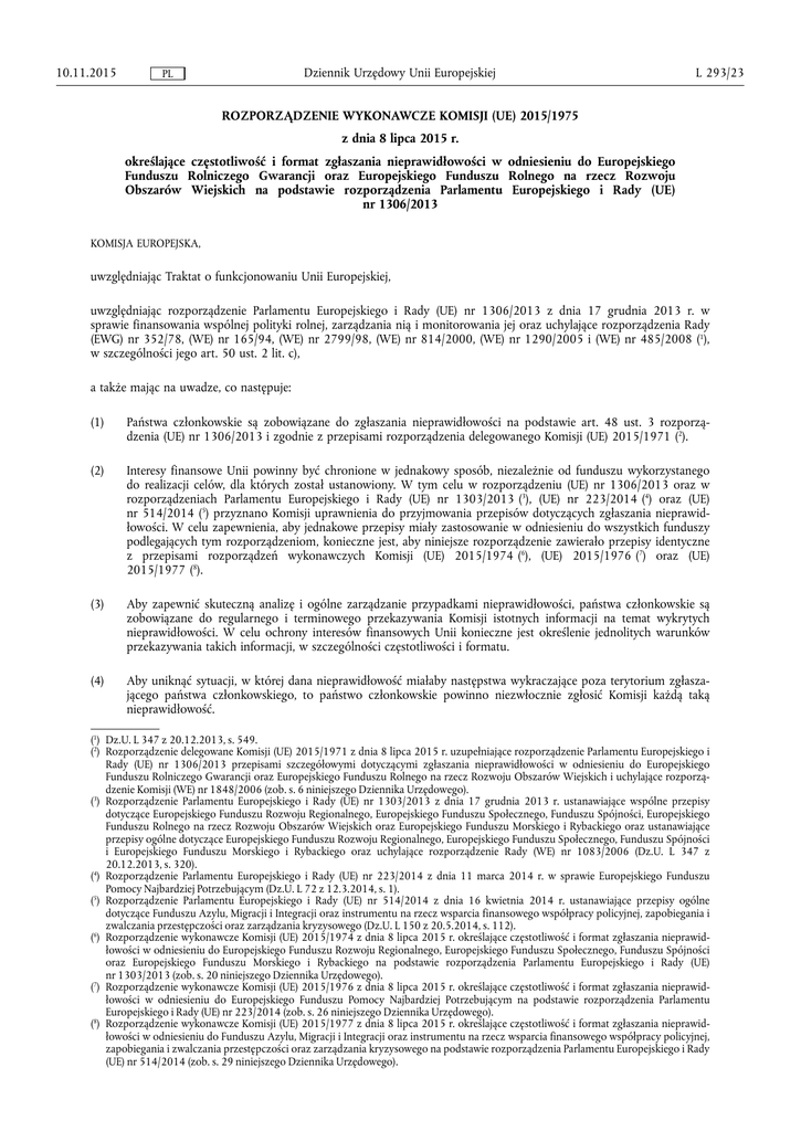 10.11.2015 Dziennik Urzędowy Unii Europejskiej PL L 293/23 ROZPORZĄDZENIE WYKONAWCZE KOMISJI (UE) 2015/1975 z dnia 8 lipca 2015 r. określające częstotliwość i format zgłaszania nieprawidłowości w odniesieniu do Europejskiego Funduszu Rolniczego Gwarancji oraz Europejskiego Funduszu Rolnego na rzecz Rozwoju Obszarów Wiejskich na podstawie rozporządzenia Parlamentu Europejskiego i Rady (UE) nr 1306/2013 KOMISJA EUROPEJSKA, uwzględniając Traktat o funkcjonowaniu Unii Europejskiej, uwzględniając rozporządzenie Parlamentu Europejskiego i Rady (UE) nr 1306/2013 z dnia 17 grudnia 2013 r. w sprawie finansowania wspólnej polityki rolnej, zarządzania nią i monitorowania jej oraz uchylające rozporządzenia Rady (EWG) nr 352/78, (WE) nr 165/94, (WE) nr 2799/98, (WE) nr 814/2000, (WE) nr 1290/2005 i (WE) nr 485/2008 (1), w szczególności jego art. 50 ust. 2 lit. c), a także mając na uwadze, co następuje: (1) Państwa członkowskie są zobowiązane do zgłaszania nieprawidłowości na podstawie art. 48 ust. 3 rozporzą dzenia (UE) nr 1306/2013 i zgodnie z przepisami rozporządzenia delegowanego Komisji (UE) 2015/1971 (2). (2) Interesy finansowe Unii powinny być chronione w jednakowy sposób, niezależnie od funduszu wykorzystanego do realizacji celów, dla których został ustanowiony. W tym celu w rozporządzeniu (UE) nr 1306/2013 oraz w rozporządzeniach Parlamentu Europejskiego i Rady (UE) nr 1303/2013 (3), (UE) nr 223/2014 (4) oraz (UE) nr 514/2014 (5) przyznano Komisji uprawnienia do przyjmowania przepisów dotyczących zgłaszania nieprawid łowości. W celu zapewnienia, aby jednakowe przepisy miały zastosowanie w odniesieniu do wszystkich funduszy podlegających tym rozporządzeniom, konieczne jest, aby niniejsze rozporządzenie zawierało przepisy identyczne z przepisami rozporządzeń wykonawczych Komisji (UE) 2015/1974 (6), (UE) 2015/1976 (7) oraz (UE) 2015/1977 (8). (3) Aby zapewnić skuteczną analizę i ogólne zarządzanie przypadkami nieprawidłowości, państwa członkowskie są zobowiązane do regularnego i terminowego przekazywania Komisji istotnych informacji na temat wykrytych nieprawidłowości. W celu ochrony interesów finansowych Unii konieczne jest określenie jednolitych warunków przekazywania takich informacji, w szczególności częstotliwości i formatu. (4) Aby uniknąć sytuacji, w której dana nieprawidłowość miałaby następstwa wykraczające poza terytorium zgłasza jącego państwa członkowskiego, to państwo członkowskie powinno niezwłocznie zgłosić Komisji każdą taką nieprawidłowość. (1) Dz.U. L 347 z 20.12.2013, s. 549. (2) Rozporządzenie delegowane Komisji (UE) 2015/1971 z dnia 8 lipca 2015 r. uzupełniające rozporządzenie Parlamentu Europejskiego i Rady (UE) nr 1306/2013 przepisami szczegółowymi dotyczącymi zgłaszania nieprawidłowości w odniesieniu do Europejskiego Funduszu Rolniczego Gwarancji oraz Europejskiego Funduszu Rolnego na rzecz Rozwoju Obszarów Wiejskich i uchylające rozporzą dzenie Komisji (WE) nr 1848/2006 (zob. s. 6 niniejszego Dziennika Urzędowego). (3) Rozporządzenie Parlamentu Europejskiego i Rady (UE) nr 1303/2013 z dnia 17 grudnia 2013 r. ustanawiające wspólne przepisy dotyczące Europejskiego Funduszu Rozwoju Regionalnego, Europejskiego Funduszu Społecznego, Funduszu Spójności, Europejskiego Funduszu Rolnego na rzecz Rozwoju Obszarów Wiejskich oraz Europejskiego Funduszu Morskiego i Rybackiego oraz ustanawiające przepisy ogólne dotyczące Europejskiego Funduszu Rozwoju Regionalnego, Europejskiego Funduszu Społecznego, Funduszu Spójności i Europejskiego Funduszu Morskiego i Rybackiego oraz uchylające rozporządzenie Rady (WE) nr 1083/2006 (Dz.U. L 347 z 20.12.2013, s. 320). (4) Rozporządzenie Parlamentu Europejskiego i Rady (UE) nr 223/2014 z dnia 11 marca 2014 r. w sprawie Europejskiego Funduszu Pomocy Najbardziej Potrzebującym (Dz.U. L 72 z 12.3.2014, s. 1). (5) Rozporządzenie Parlamentu Europejskiego i Rady (UE) nr 514/2014 z dnia 16 kwietnia 2014 r. ustanawiające przepisy ogólne dotyczące Funduszu Azylu, Migracji i Integracji oraz instrumentu na rzecz wsparcia finansowego współpracy policyjnej, zapobiegania i zwalczania przestępczości oraz zarządzania kryzysowego (Dz.U. L 150 z 20.5.2014, s. 112). (6) Rozporządzenie wykonawcze Komisji (UE) 2015/1974 z dnia 8 lipca 2015 r. określające częstotliwość i format zgłaszania nieprawid łowości w odniesieniu do Europejskiego Funduszu Rozwoju Regionalnego, Europejskiego Funduszu Społecznego, Funduszu Spójności oraz Europejskiego Funduszu Morskiego i Rybackiego na podstawie rozporządzenia Parlamentu Europejskiego i Rady (UE) nr 1303/2013 (zob. s. 20 niniejszego Dziennika Urzędowego). (7) Rozporządzenie wykonawcze Komisji (UE) 2015/1976 z dnia 8 lipca 2015 r. określające częstotliwość i format zgłaszania nieprawid łowości w odniesieniu do Europejskiego Funduszu Pomocy Najbardziej Potrzebującym na podstawie rozporządzenia Parlamentu Europejskiego i Rady (UE) nr 223/2014 (zob. s. 26 niniejszego Dziennika Urzędowego). (8) Rozporządzenie wykonawcze Komisji (UE) 2015/1977 z dnia 8 lipca 2015 r. określające częstotliwość i format zgłaszania nieprawid łowości w odniesieniu do Funduszu Azylu, Migracji i Integracji oraz instrumentu na rzecz wsparcia finansowego współpracy policyjnej, zapobiegania i zwalczania przestępczości oraz zarządzania kryzysowego na podstawie rozporządzenia Parlamentu Europejskiego i Rady (UE) nr 514/2014 (zob. s. 29 niniejszego Dziennika Urzędowego). L 293/24 Dziennik Urzędowy Unii Europejskiej PL 10.11.2015 (5) Aby w pełni wykorzystać zalety wynikające ze stosowania elektronicznych środków wymiany informacji przy jednoczesnym zachowaniu bezpieczeństwa wymiany informacji, państwa członkowskie powinny stosować specjalny system zarządzania nieprawidłowościami (Irregularity Management System, IMS) dostępny w ramach ustanowionej przez Komisję platformy syste