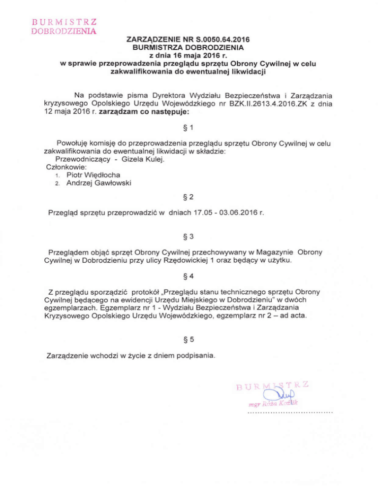 }'| RZ DCl]ii )']7,iiNIA i] U ], ]\,1 i zARzĄDzENlE NR s.0050.64.2016 BURMlsTRzA DoBRoDzlENlA z dnia l6 maja 2016 r. w sprawie przeprowadzenia przeglądu sprzętu obrony cywilnej w celu zakwalifi kowania do €wentualnej likwidacji Na podstawie pisma Dyrektora Wydziału Bezpieczeństwa i Zarządzania kryzysowego opolskiego Urzędu Wojewódzkiego nr BzK.l1,2613 ,4.20'l6.zK 12 mąa 2016 l. zalządzam co następuje: z dnia §1 Powołuję komisję do przeprowadzenia przeglądu sprzętu obrony cywilnej W celu zakwalifikowania do ewentualnej likwidacji W składzie: Przewodniczący - Gizela Kulej. członkowie: 1, Piotr Więdłocha 2- AndEą Gawłowski §2 Przegląd sprzętu przeprowadzić W dniach 17.05 - 03.06.2016 r. §3 Przeglądem objąó sprzęt obrony cywilnej przechowywany W Magazynie obrony cywilnej W Dobrodzieniu przy ulicy Rzędowickiej 1 oraz będący W uźytku. §4 z przeglądu sporządzić protokół ,,Przeglądu stanu technicznego sprzętu obrony cywilnej będącego na ewidencji Urzędu Miejskiego W Dobrodzieniu" W dwóch egzemplarzach. Egzemplarz nr 1 - Wydziału Bezpieczeństwa i zażądzania Kryzysowego opolskiego Urzędu Wojewódzkiego, egzemplarz nr 2 - ad acta, §5 zarządzenie Wchodzi W życie z dniem podpisania.