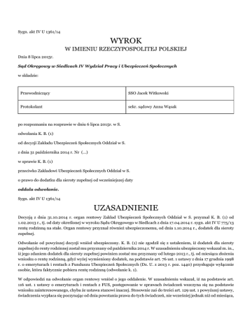 Sygn. akt IV U 1361/14 WYROK W IMIENIU RZECZYPOSPOLITEJ POLSKIEJ Dnia 8 lipca 2015r. Sąd Okręgowy w Siedlcach IV Wydział Pracy i Ubezpieczeń Społecznych w składzie: Przewodniczący SSO Jacek Witkowski Protokolant sekr. sądowy Anna Wąsak po rozpoznaniu na rozprawie w dniu 6 lipca 2015r. w S. odwołania K. B. (1) od decyzji Zakładu Ubezpieczeń Społecznych Oddział w S. z dnia 31 października 2014 r. Nr (...) w sprawie K. B. (1) przeciwko Zakładowi Ubezpieczeń Społecznych Oddział w S. o prawo do dodatku dla sieroty zupełnej od wcześniejszej daty oddala odwołanie. Sygn. akt IV U 1361/14 UZASADNIENIE Decyzją z dnia 31.10.2014 r. organ rentowy Zakład Ubezpieczeń Społecznych Oddział w S. przyznał K. B. (1) od 1.02.2013 r., tj. od daty określonej w wyroku Sądu Okręgowego w Siedlcach z dnia 17.04.2014 r. sygn. akt IV U 775/13 rentę rodzinną na stałe. Organ rentowy przyznał również ubezpieczonemu, od dnia 1.10.2014 r., dodatek dla sieroty zupełnej. Odwołanie od powyższej decyzji wniósł ubezpieczony. K. B. (1) nie zgodził się z ustaleniem, iż dodatek dla sieroty zupełnej do renty rodzinnej został mu przyznany od października 2014 r. W uzasadnieniu ubezpieczony wskazał m. in., iż jego zdaniem dodatek dla sieroty zupełnej powinien zostać mu przyznany od lutego 2013 r., tj. od miesiąca złożenia wniosku o rentę rodzinną, gdyż wyżej wymieniony dodatek, na podstawie art. 76 ust. 1 ustawy z dnia 17 grudnia 1998 r. o emeryturach i rentach z Funduszu Ubezpieczeń Społecznych (Dz. U. z 2013 r. poz. 1440) przysługuje wyłącznie osobie, która faktycznie pobiera rentę rodzinną (odwołanie k. 1). W odpowiedzi na odwołanie organ rentowy wniósł o jego oddalenie. W uzasadnieniu wskazał, iż na podstawie art. 116 ust. 1 ustawy o emeryturach i rentach z FUS, postępowanie w sprawach świadczeń wszczyna się na podstawie wniosku zainteresowanego, chyba że ustawa stanowi inaczej. Stosownie zaś do treści art. 129 ust. 1 powyższej ustawy, świadczenia wypłaca się poczynając od dnia powstania prawa do tych świadczeń, nie wcześniej jednak niż od miesiąca, w którym zgłoszono wniosek lub wydano decyzję z urzędu. Wniosek o przyznanie dodatku dla sieroty zupełnej został złożony przez ubezpieczonego w dniu 16.10.2014 r., dlatego też wskazany dodatek został wypłacony K. B. (1) począwszy od dnia 1.10.2014 r. (odpowiedź na odwołanie k. 3-4). Sąd Okręgowy ustalił i zważył, co następuje: W dniu 13.02.2013 r. K. B. (1) złożył do (...) Oddział w S. dwa wnioski: o przyznanie renty rodzinnej po zmarłym w dniu 26.01.2010 r. ojcu, W. B. oraz o renty socjalnej. (wnioski k. 1-7 akt o rentę rodzinną, k. 1-4 akt o rentę socjalną). Organ rentowy, w drodze decyzji z dnia 20.05.2013 r., (decyzje k. 20 akt o rentę rodzinną, k. 16 akt o rentę socjalną). Na skutek złożonych przez ubezpieczonego odwołań, sprawa została rozpoznawana przez Sąd Okręgowy w Siedlcach, który w wyroku z dnia 17.04.2014 r. sygn. akt IV 775/13 w pkt I zmienił zaskarżoną decyzję z dnia 20.05.2013 r. i ustalił, że ubezpieczonemu przysługuje prawo do stałej renty rodzinnej od dnia 1.02.2013 r., zaś w pkt II oddalił odwołanie od decyzji z dnia 20.05.2013 r. dotyczącej odmowy przyznania prawa do renty socjalnej (odpis wyroku k. 42 akt o rentę rodzinną). Sąd Apelacyjny w Lublinie w wyroku z dnia 27.08.2014 r. sygn. akt III AUa 523/14 oddalił apelację organu rentowego od wyżej wymienionego wyroku (odpis wyroku k. 50 akt o rentę rodzinną). W dniu 16.10.2014 r. K. B. (1) złożył wniosek o wypłatę dodatku sierocego do renty rodzinnej (wniosek k. 60 akt o rentę rodzinną). Do powyższego wniosku ubezpieczony dołączył odpis skrócony aktu zgonu jego matki, K. B. (2). Wynika z niego, iż K. B. (2) zmarła w dniu 22.03.1995 r. (poświadczona przez ZUS kserokopia odpisu skróconego aktu zgonu k. 61 akt o rentę rodzinną). Wobec powyższego, organ rentowy wydał w dniu 31.10.2014 r. zaskarżoną decyzję (k. 68 akt o rentę rodzinną). Kluczowym dla rozstrzygnięcia niniejszego postępowania jest treść art. 129 ust. 1 ustawy o emeryturach i rentach z FUS, zgodnie z którym świadczenia wypłaca się poczynając od dnia powstania prawa do tych świadczeń, nie wcześniej jednak niż od miesiąca, w którym zgłoszono wniosek lub wydano decyzję z urzędu. Na uwadze należy mieć również treść 116 ust. 1 powyższej ustawy, w myśl którego postępowanie w sprawach świadczeń wszczyna się na podstawie wniosku zainteresowanego, chyba że ustawa stanowi inaczej. Wskazać przy tym należy, iż nie istnieje żaden przepis szczególny, który nakazywałby wypłatę dodatku dla sieroty zupełnej z urzędu. Artykuł 76 ust. 1 przywołanej decyzji stanowi bowiem jedynie, iż jeżeli do renty rodzinnej uprawniona jest sierota zupełna, przysługuje jej dodatek dla sierot zupełnych. W tym miejscu zasadnym jest powołanie się na poglądy wyrażone w orzecznictwie. Jak wskazał Sąd Apelacyjny w Lublinie w uzasadnieniu do wyroku z dnia 10.01.2006 r. III AUa 376/05 ogólną zasadą prawa emerytalnorentowego jest, że świadczenia wypłaca się na wniosek zainteresowanego, poczynając od dnia powstania prawa do emerytury/renty, lecz nie wcześniej niż od miesiąca, w którym zgłoszono wniosek o świadczenie. Czym innym jest bowiem data nabycia prawa do świadczenia, a czym innym data podjęcia jego wypłaty. Reguła powyższa wyklucza możliwość wstecznego wypłacania świadczeń, tj. za okres po nabyciu prawa, a przed złożeniem wniosku, co uzasadnia się zapobieganiem powstawaniu zjawiska kapitalizacji świadczeń. Prawo do świadczenia może być realizowane dopiero po zgłoszeniu do właściwego organu rentowego wniosku o przyznanie prawa. Inicjatywa należy zawsze do ubezpieczonego. W ocenie Sądu Okręgowego, powyższe stanowisko, w drodze analogii, znajdzie zastosowanie również w przypadku prawa do dodatku dla sierot zupełnych. Warto pr